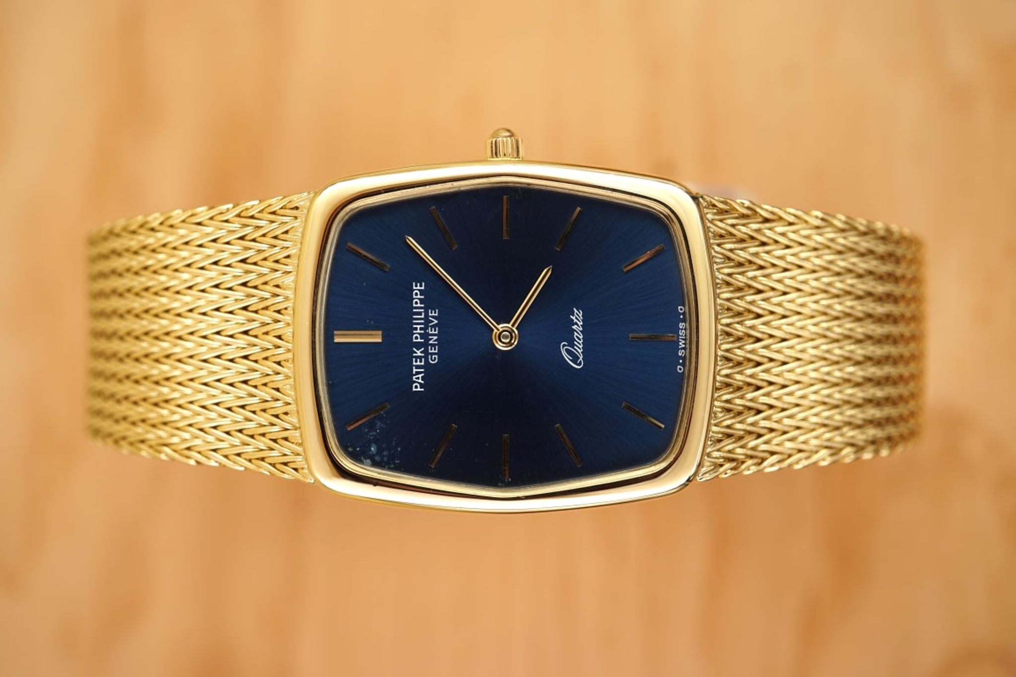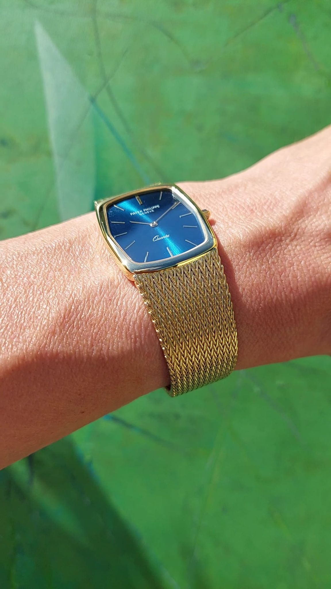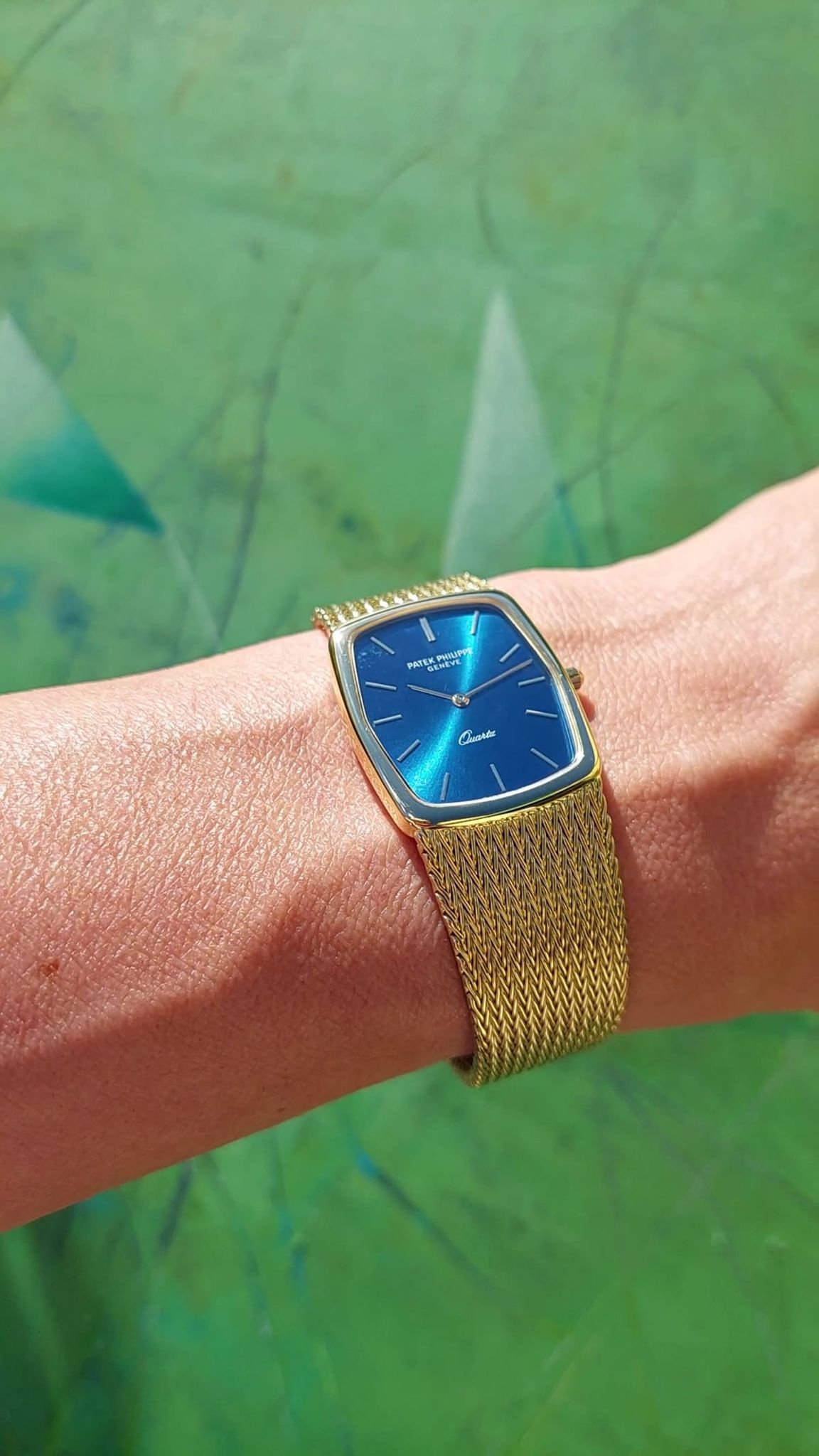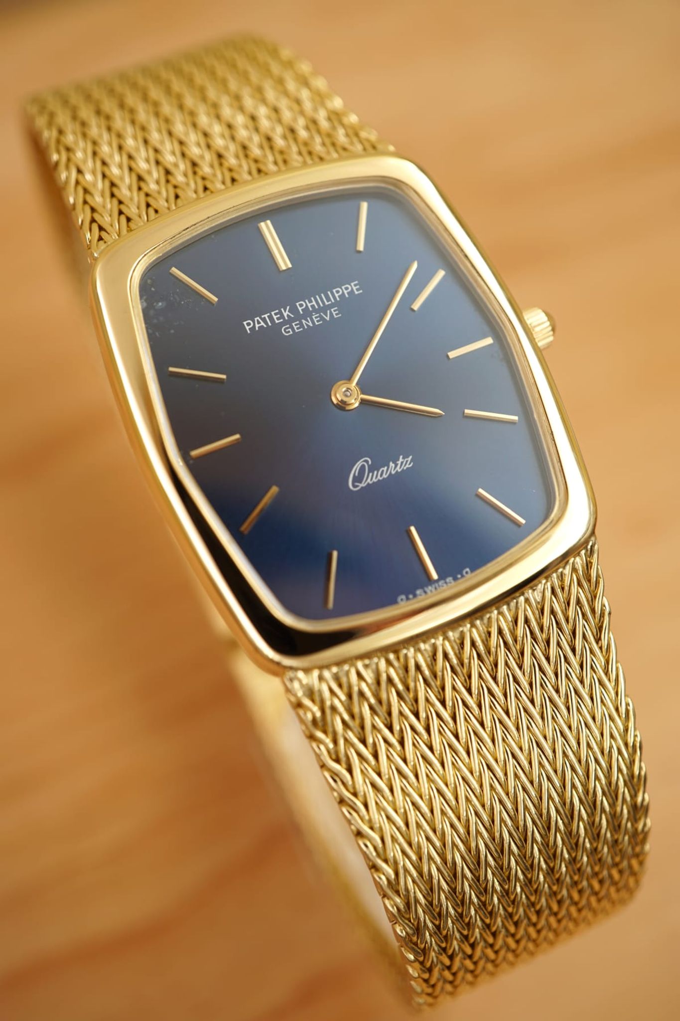 Elegant vintage '80s Patek Ellipse: hexagonal and with the finest integrated bracelet (fitting a >190mm-wrist). And it is QUARTZ, yes. And it says so boldly on the dial, yes. And why not? At the moment after Watches & Wonders 2024 there is simply nothing more avant-garde than Patek-Quartz: We were surprised to see the presentation of the new ref5269 this year coming with a quartz-movement -- but yes, it is a surprising but it is a correct and surprisingly good and brave move by the reference brand in horology: to offer a low-maintenance, hassle free, always running and always precise sporty daily wearer for the conservative mind that values punctuality on the spot.