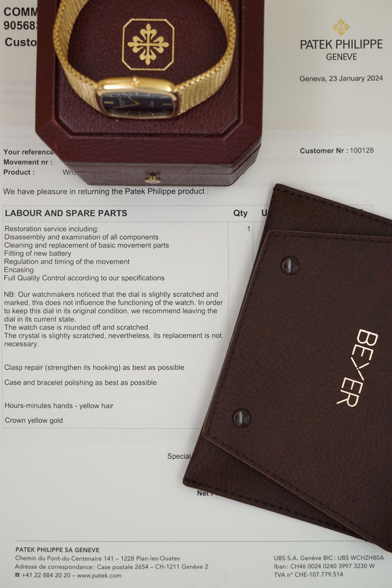 Serviced by Patek, Geneva in 2024 and with a 24 months guarantee by the manufacturer. Overall very elegant and optically and technically in excellent condition, just the dial has some minor oxidations around 11 o'clock -- signs of age and time.