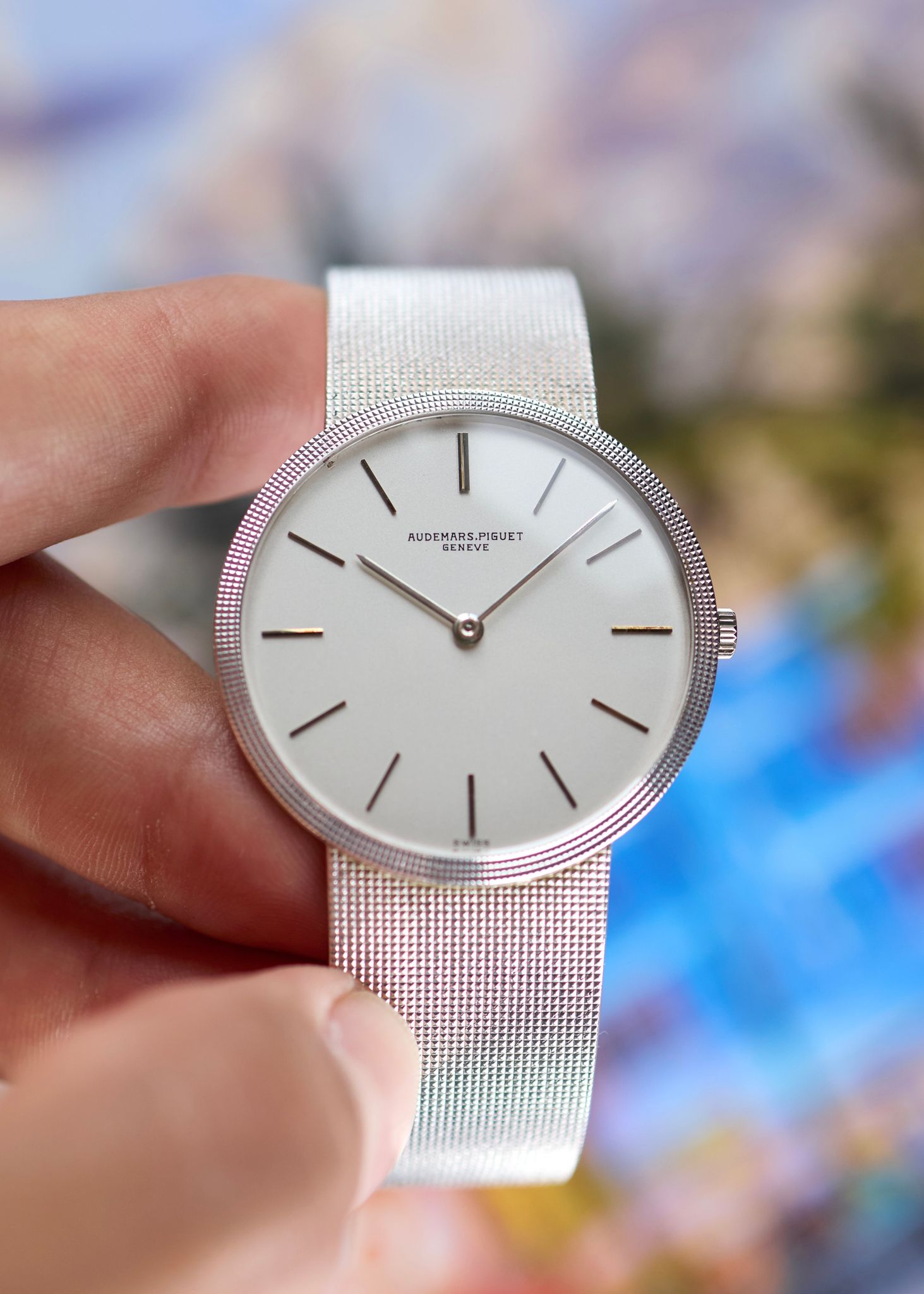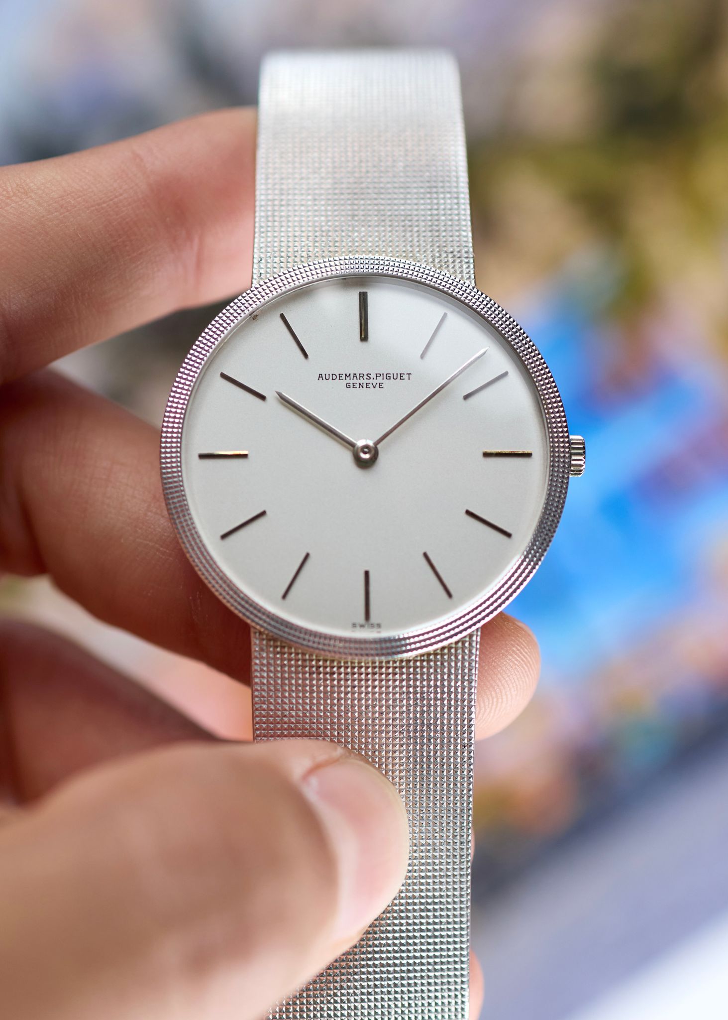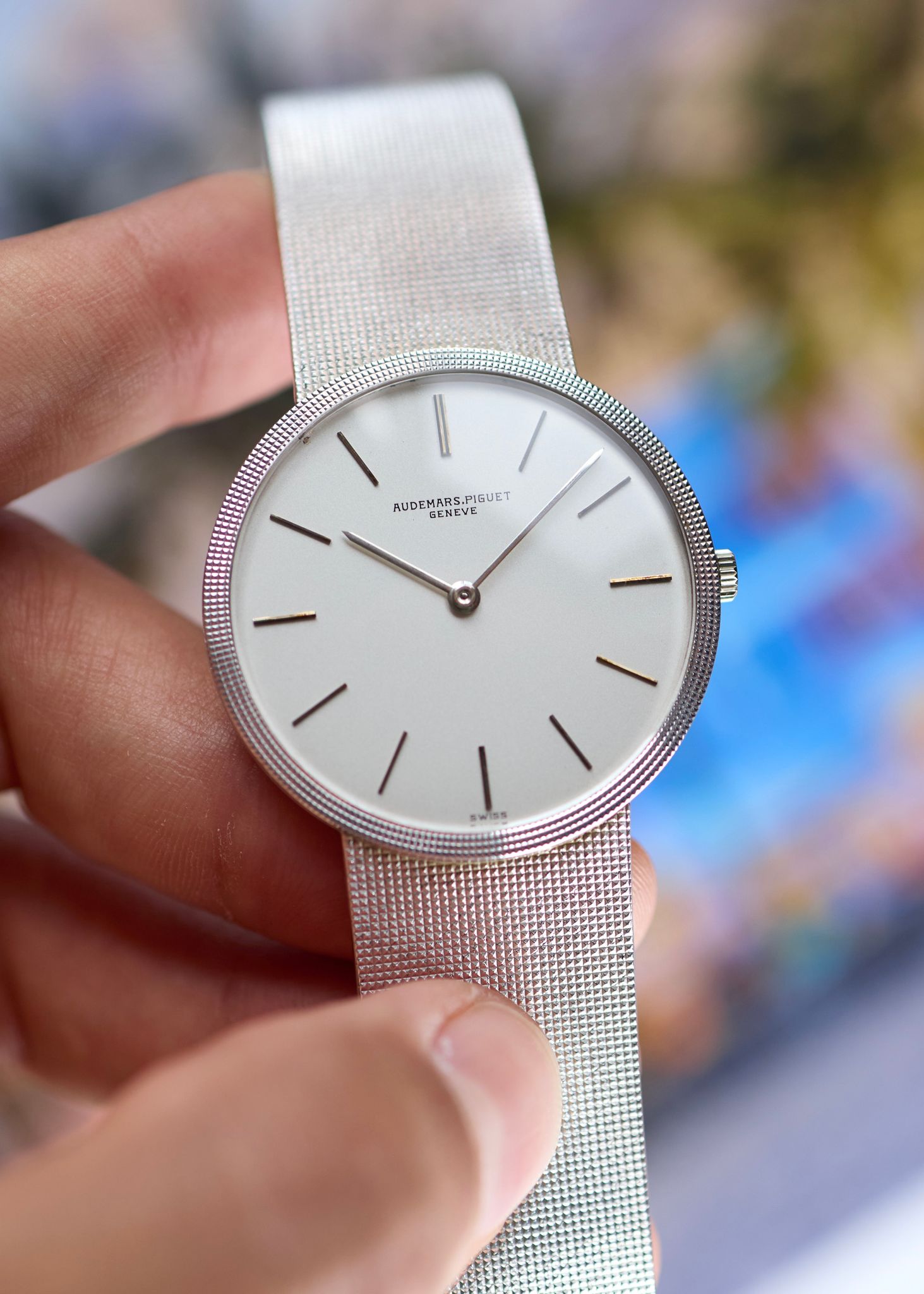 Produced circa 1980s, this reference features a full Clous de Paris (hobnail) finish across the case, bracelet, and clasp - executed with the kind of precision that defined AP’s quiet-era mastery. Features a stunning granular white gold dial that complements the CDP texture.