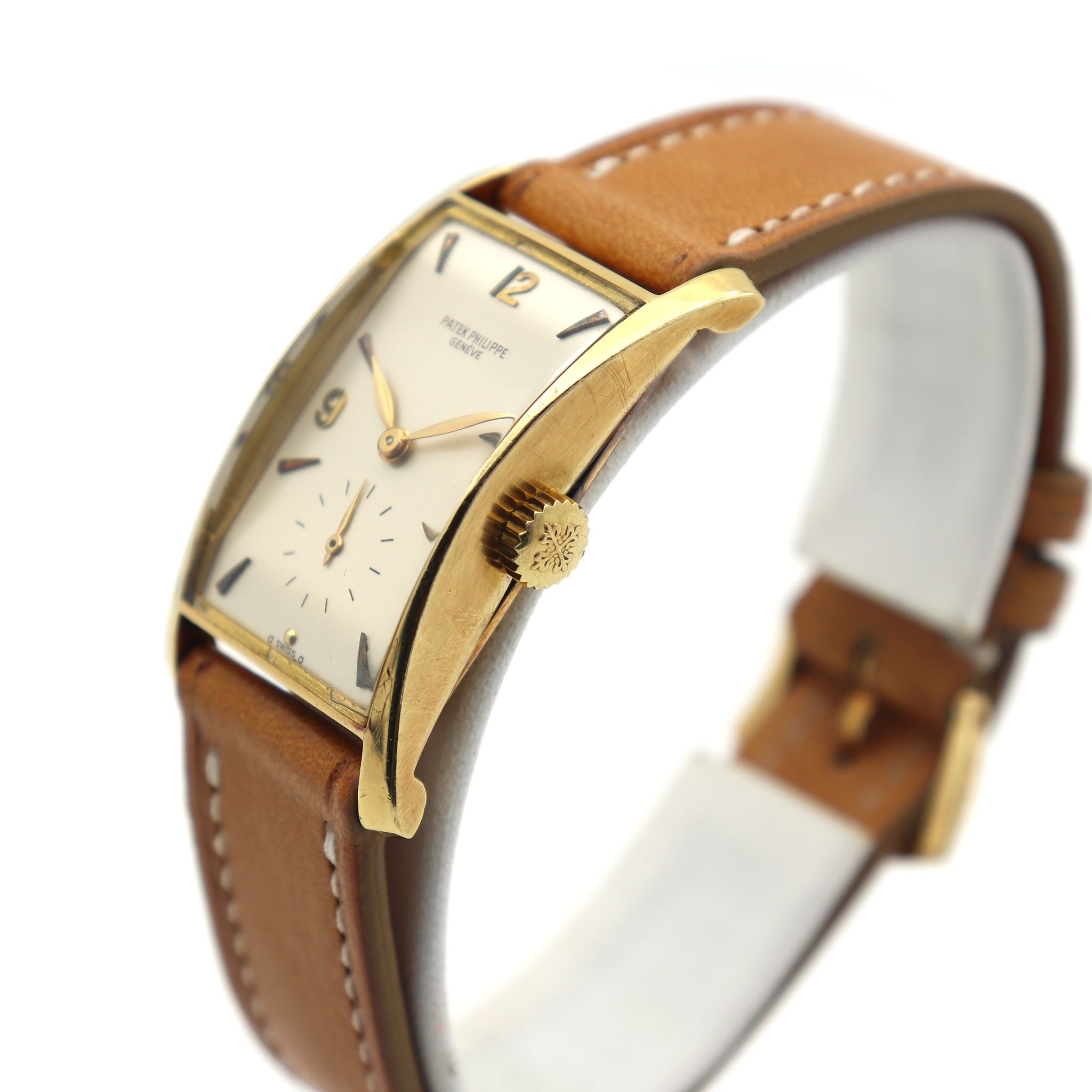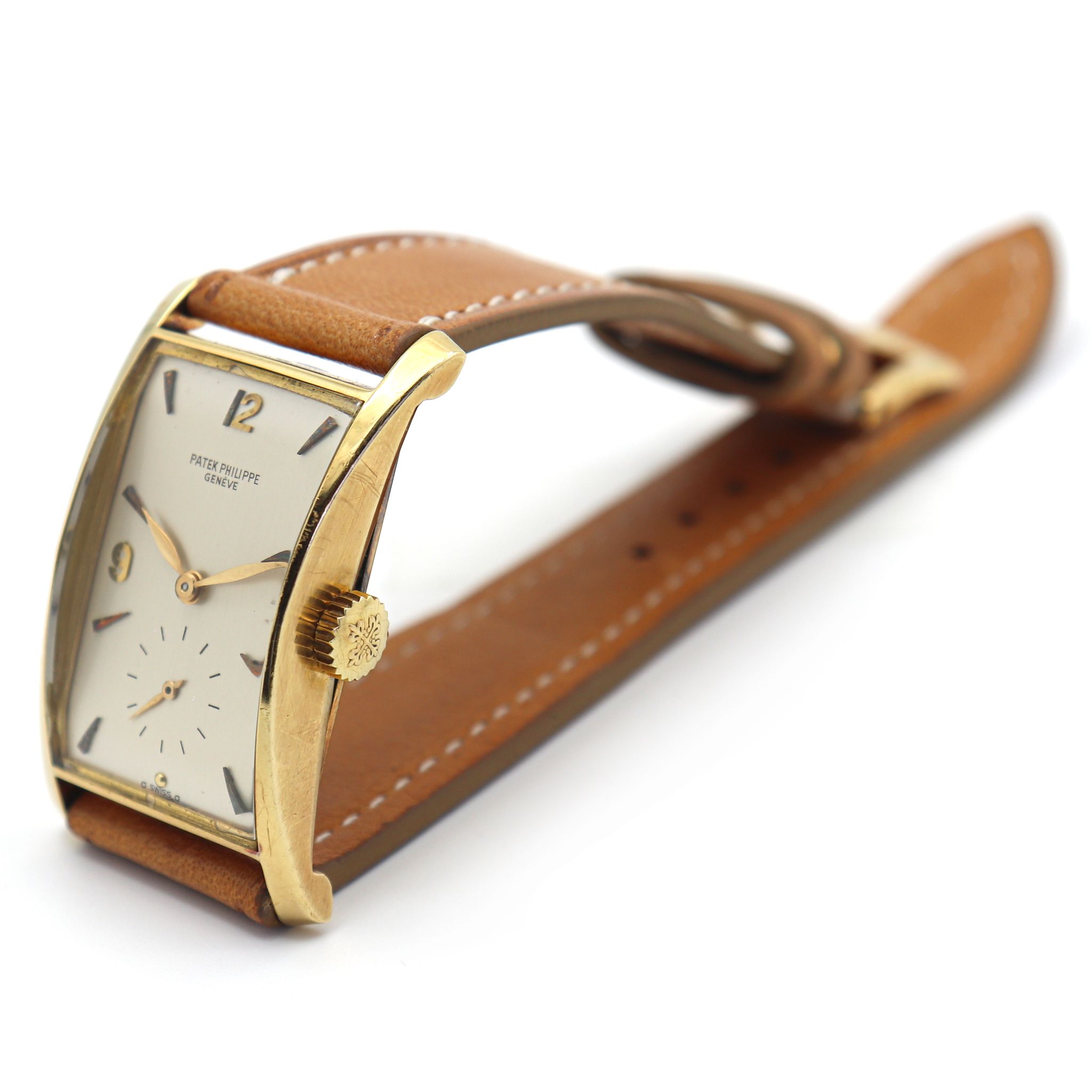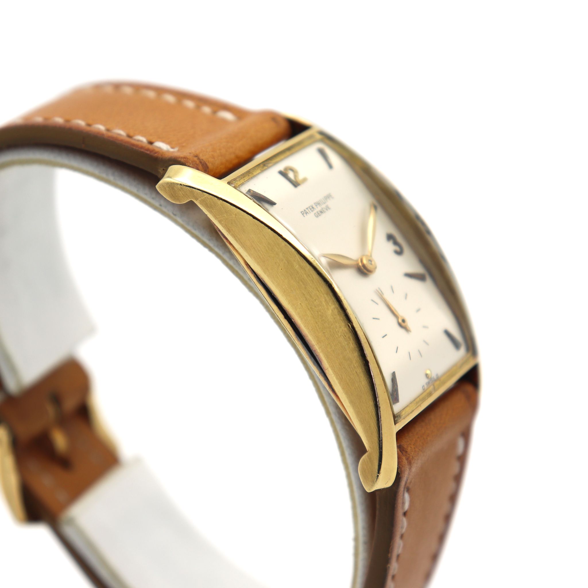 Patek Philippe reference 1593 “Pagoda” in 18kt yellow gold. Introduced in 1944 the reference 1593 is a wonderful expression of post-war exuberance. The oversized rectangular case has a bold clean design foreshadowing a mid-century aesthetic. Known by collectors also as “Hourglass” or “Tegola”, the pillar lugs flare outward from the center, and are delightfully curved, giving the case an architectural appeal, and creating a quarter moon profile. The present piece features a silver enamelled dial with arabic indexes, put together by a made in Italy leather strap and Patek Philippe 18kt yellow gold buckle.