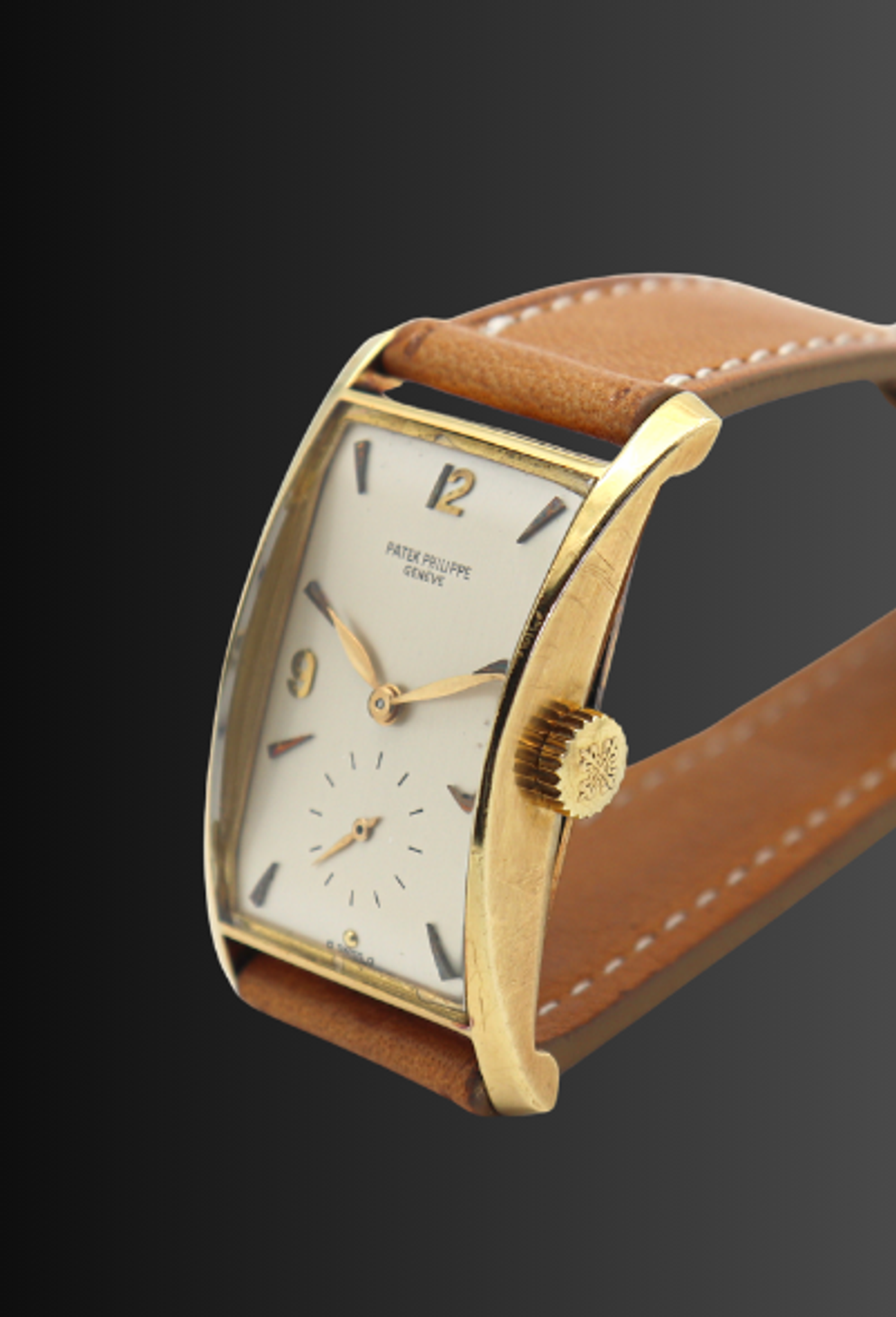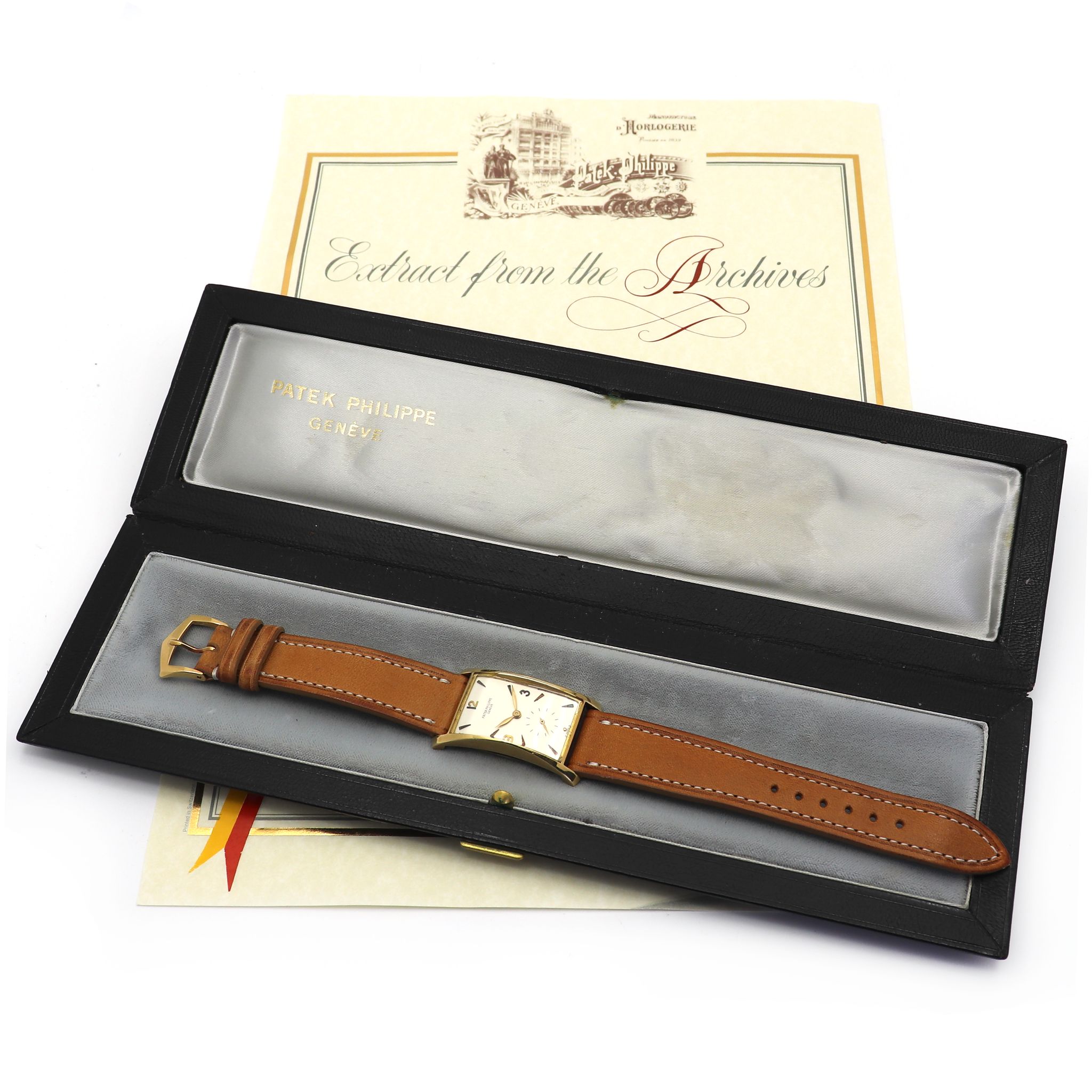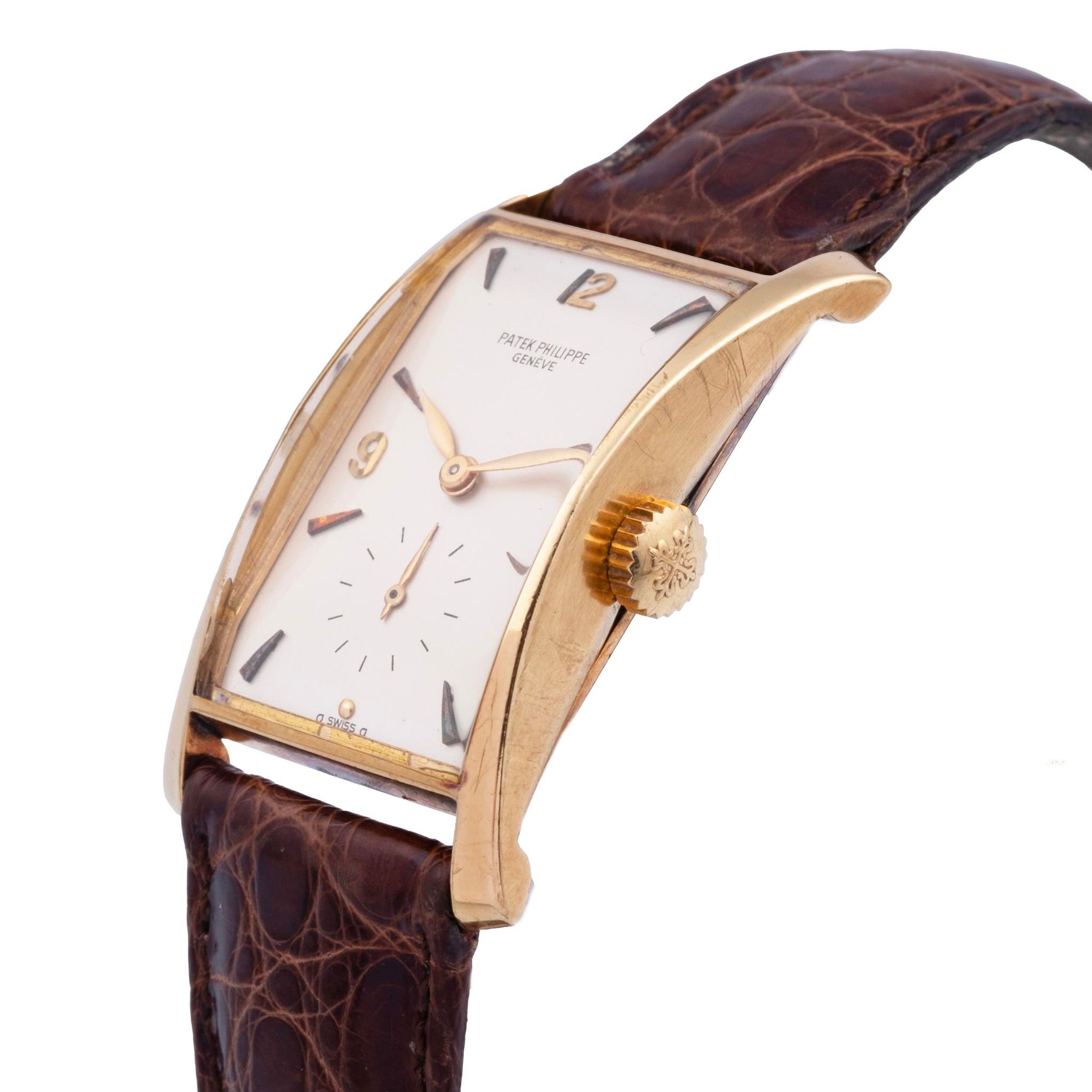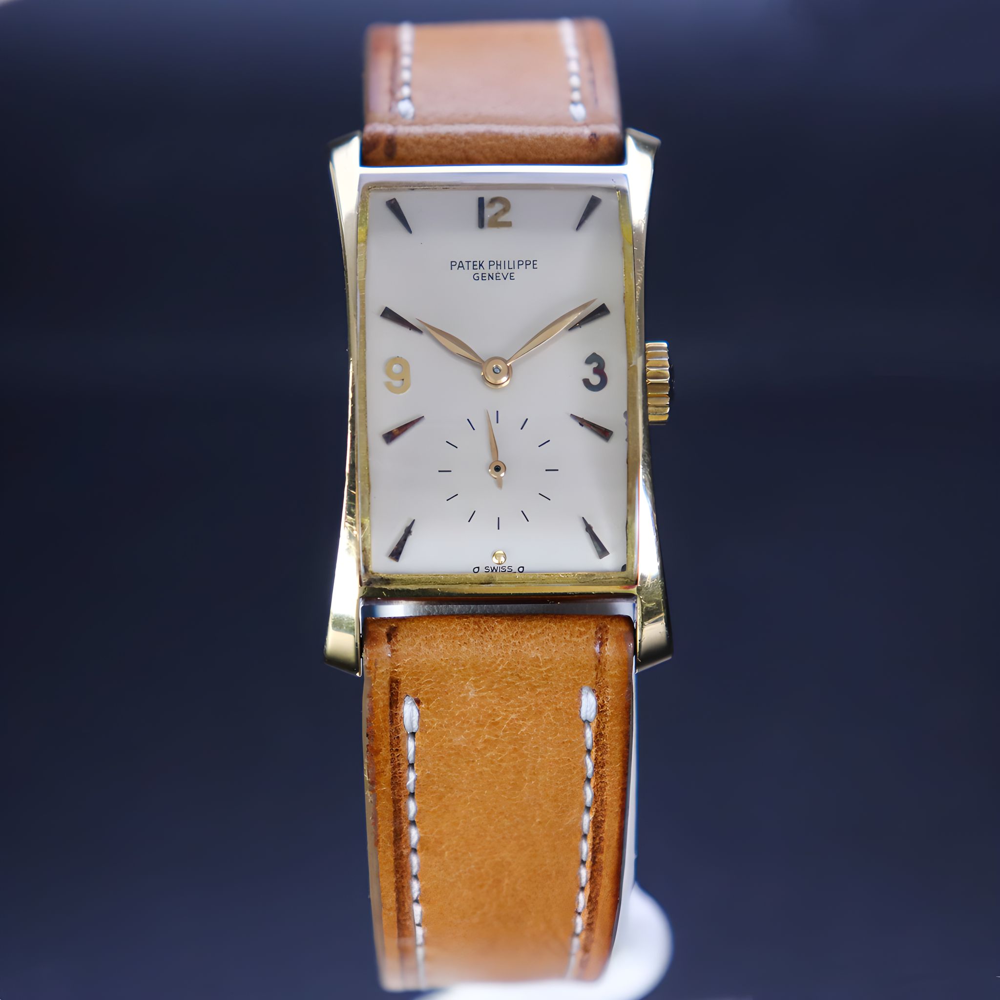 Patek Philippe reference 1593 “Pagoda” in 18kt yellow gold. Introduced in 1944 the reference 1593 is a wonderful expression of post-war exuberance. The oversized rectangular case has a bold clean design foreshadowing a mid-century aesthetic. Known by collectors also as “Hourglass” or “Tegola”, the pillar lugs flare outward from the center, and are delightfully curved, giving the case an architectural appeal, and creating a quarter moon profile. The present piece features a silver enamelled dial with arabic indexes, put together by a made in Italy leather strap and Patek Philippe 18kt yellow gold buckle.