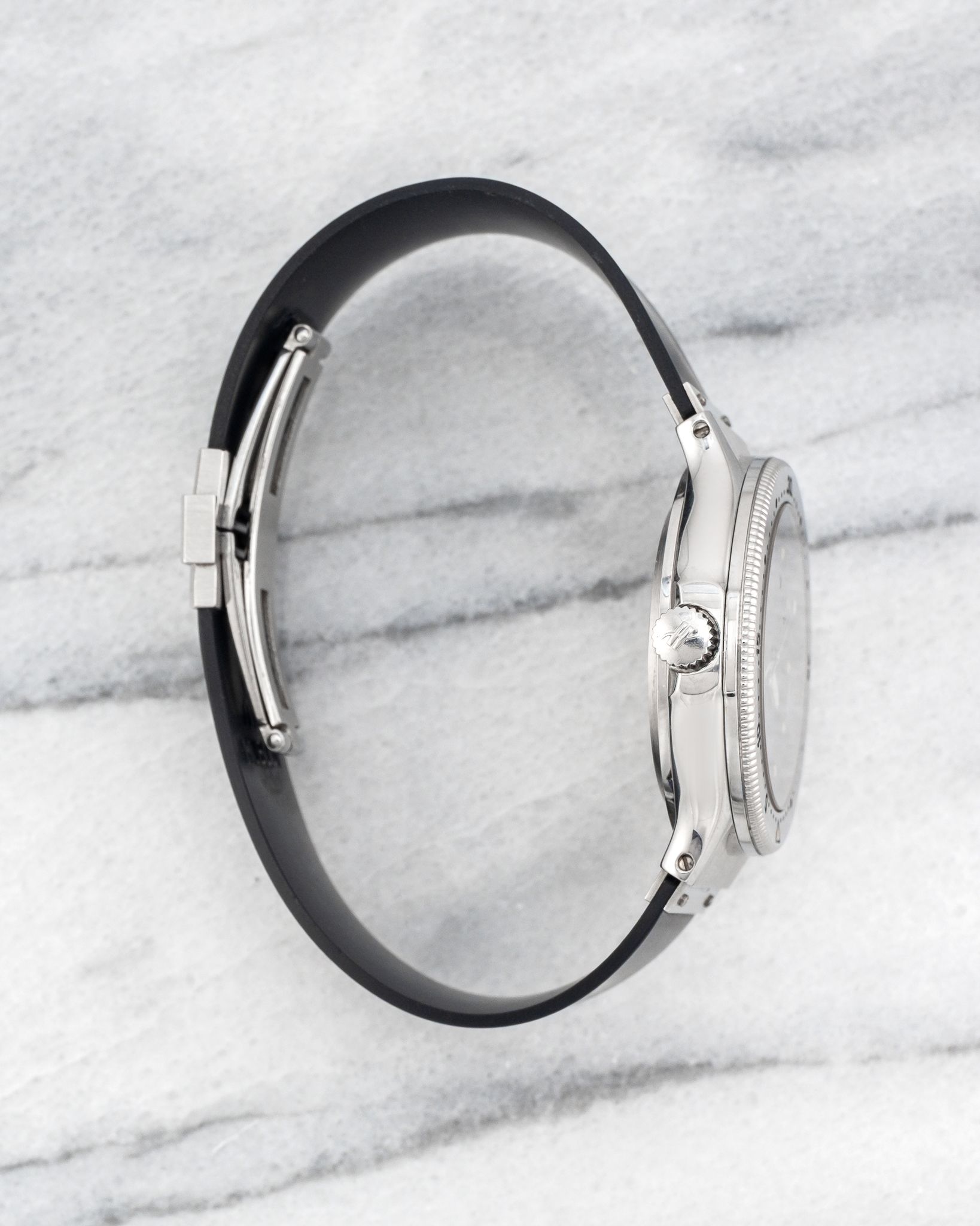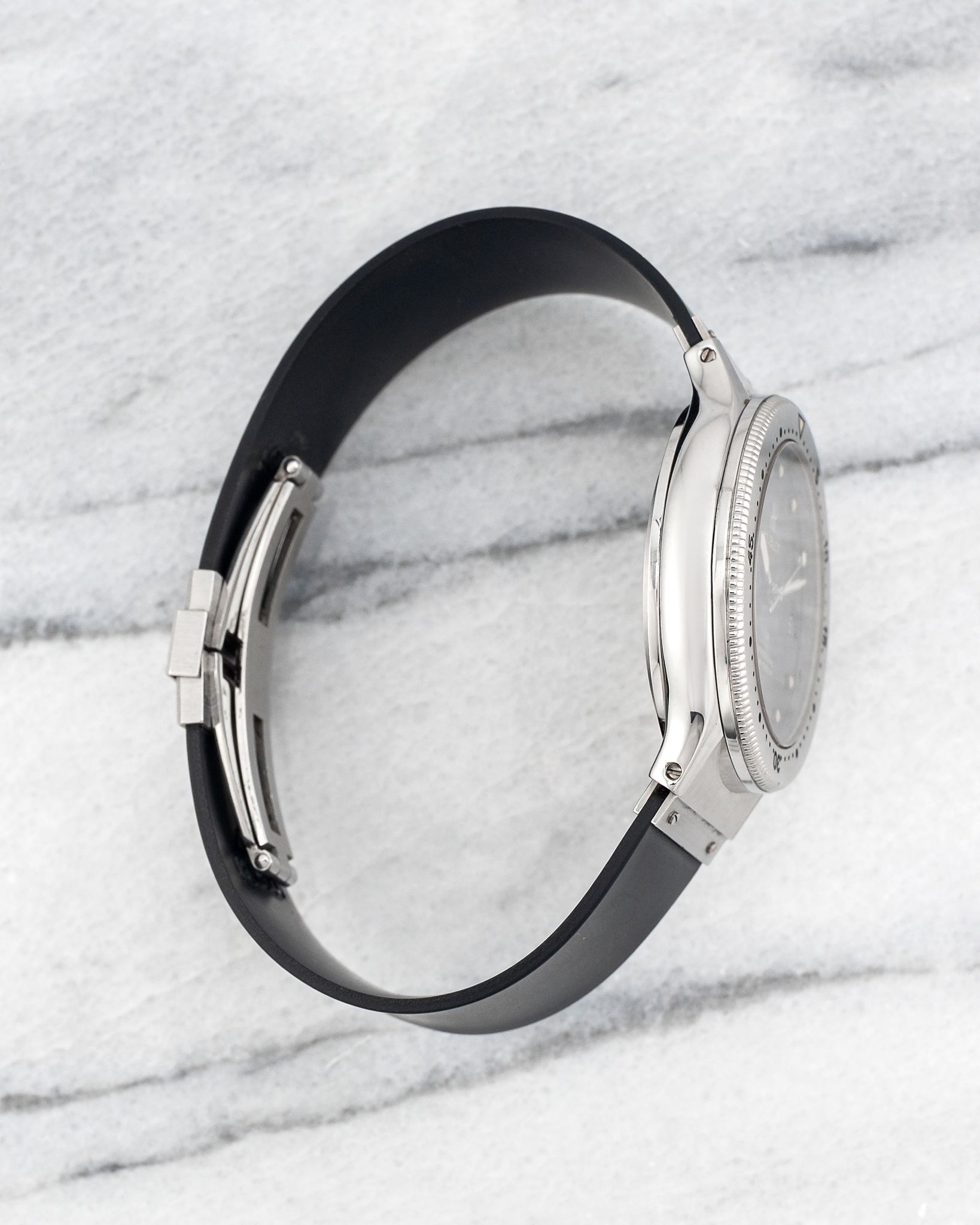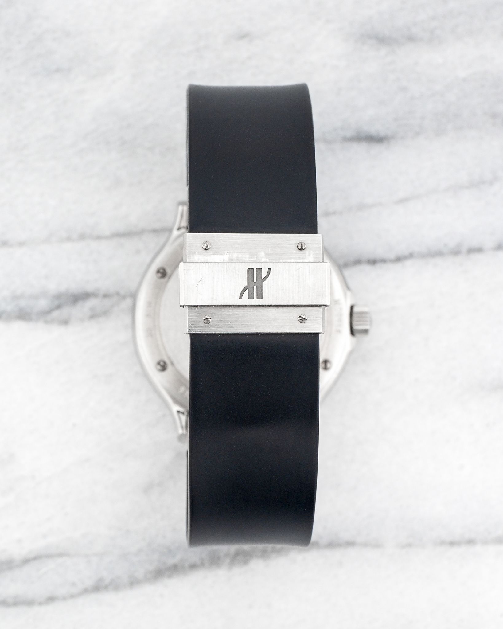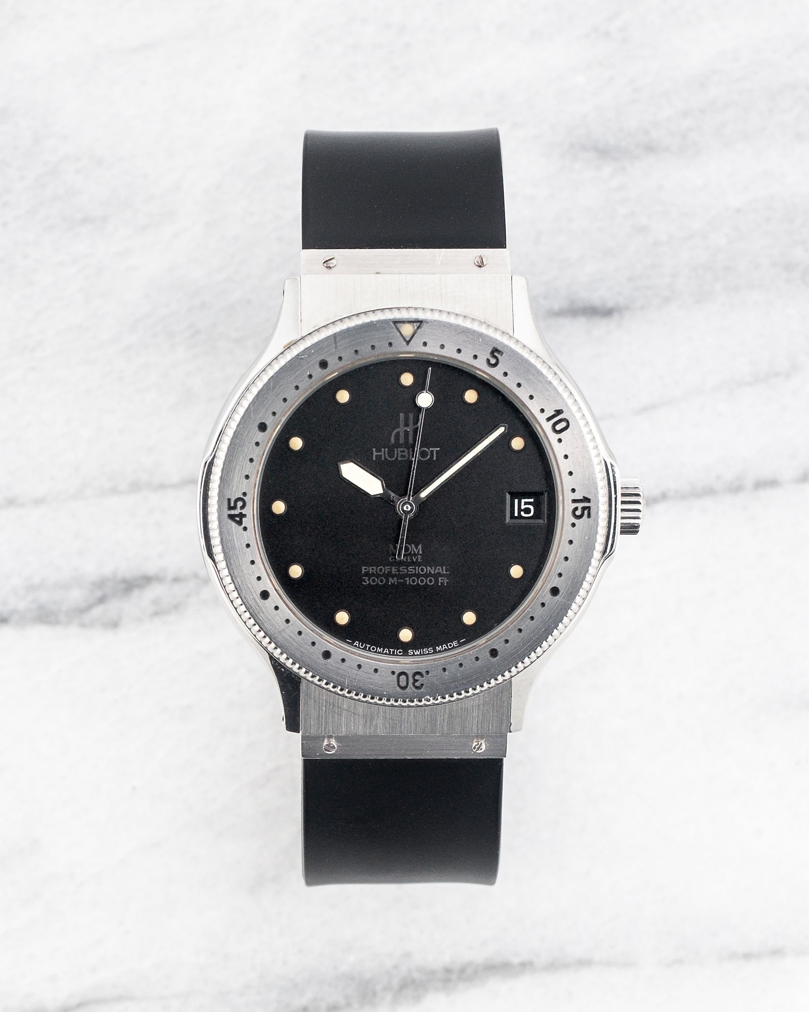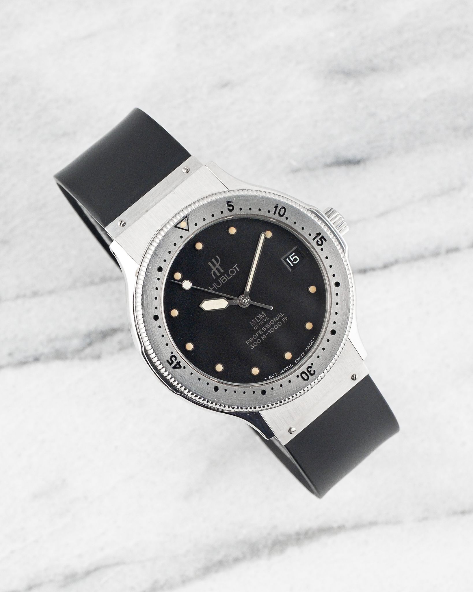 Here's a vintage Hublot MDM Diver automatic with a black dial on a rubber strap from the 1990s. Keeps great time and is fully functional. Measurements include a 40mm steel case. It's on a Hublot rubber strap that fits up to a 7 inch wrist. Black dial with dot indices, bold luminous hands, rotating bezel, and quickset date window at 3 o'clock. Water resistant to 300 meters. Steel case and caseback. All parts are original including the signed Hublot crown, dial, movement, and caseback. Both the dial and case are in great cosmetic, untouched condition.