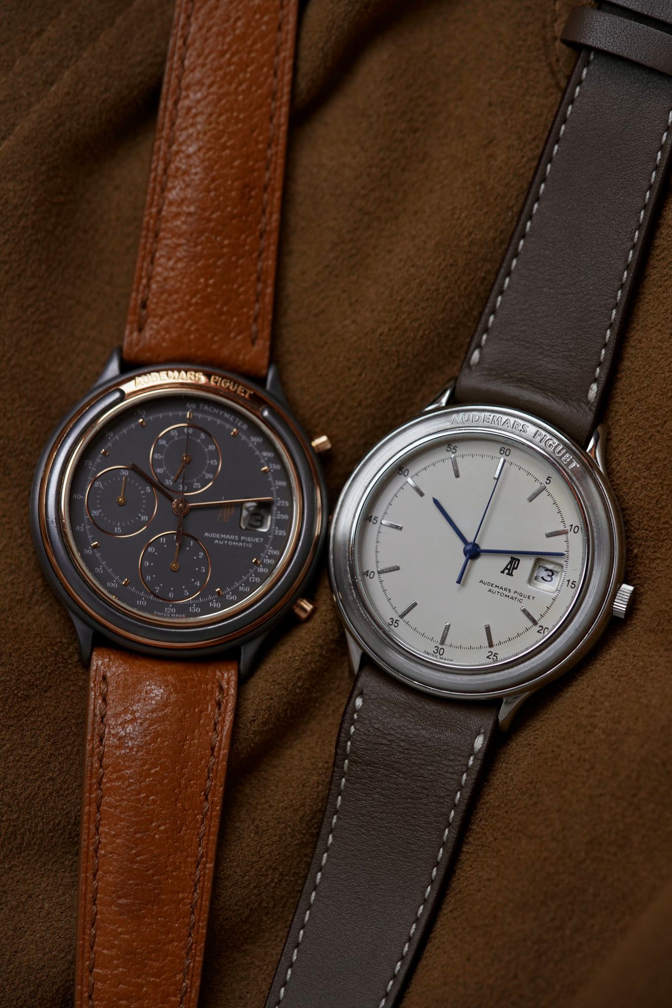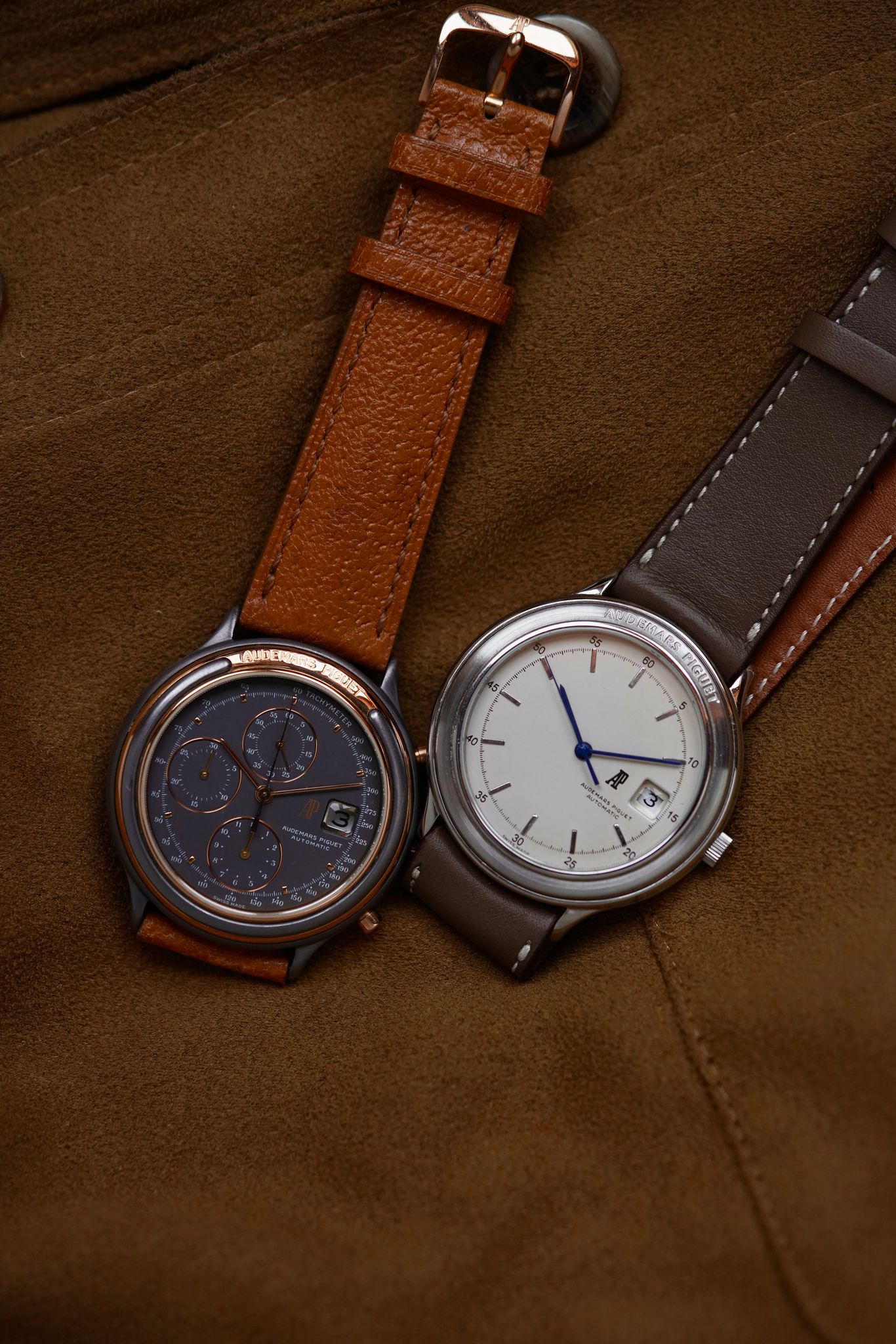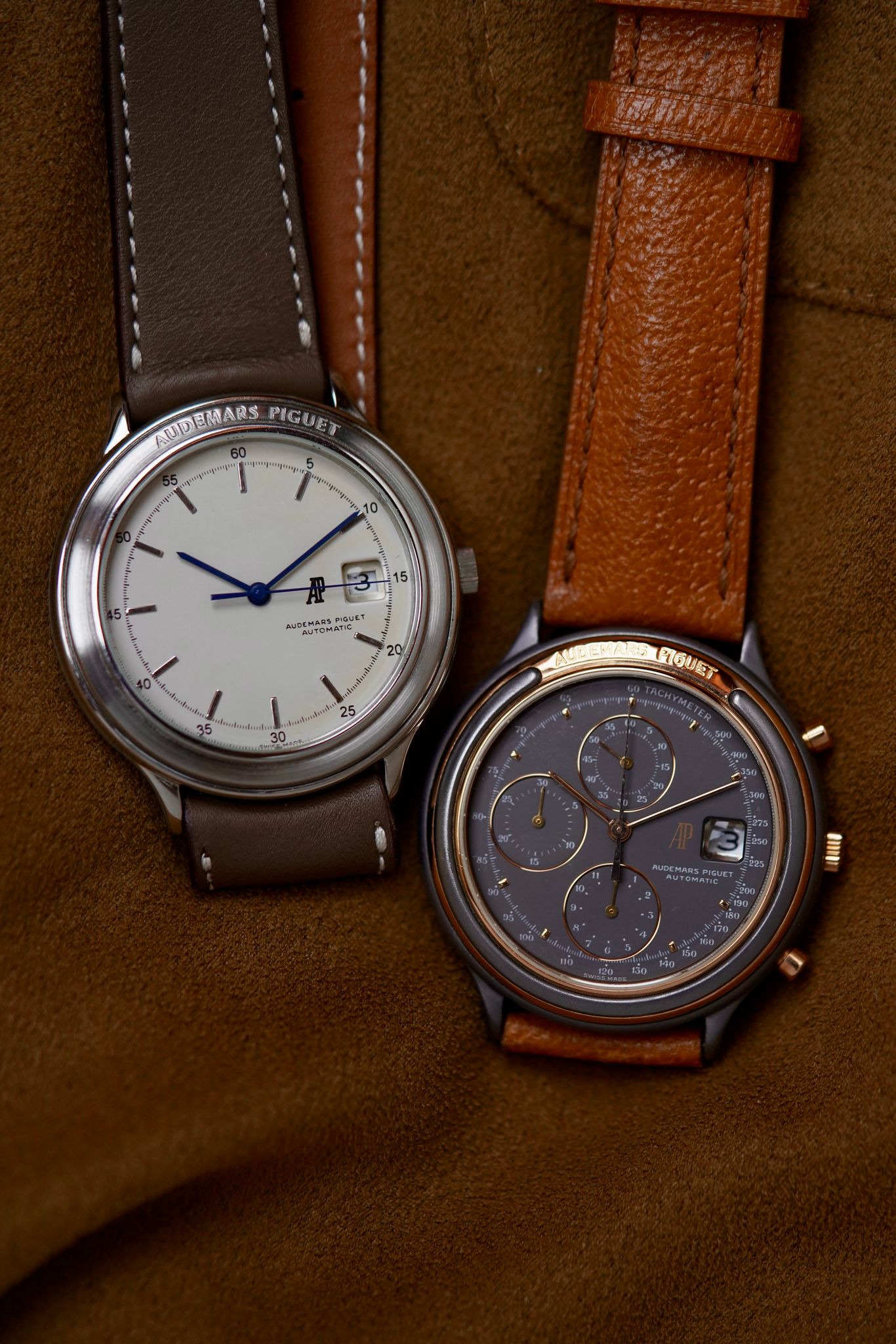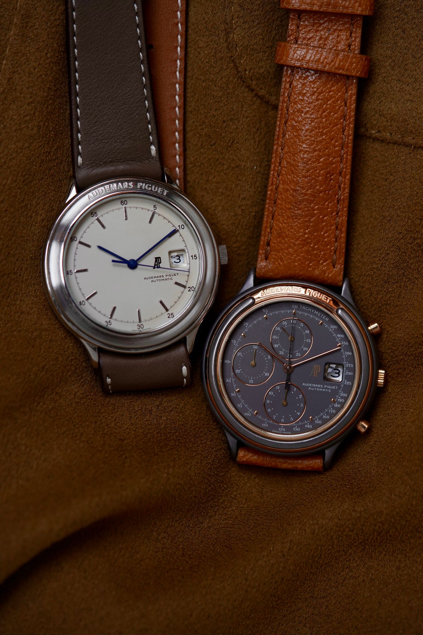 A delightful pair of this very ‘80s Audemars Piguet line: the Huitieme. A simple time only in steel and a complicated chronograph in tantalum and rose gold ! Both around 40mm in size and stunning looks.