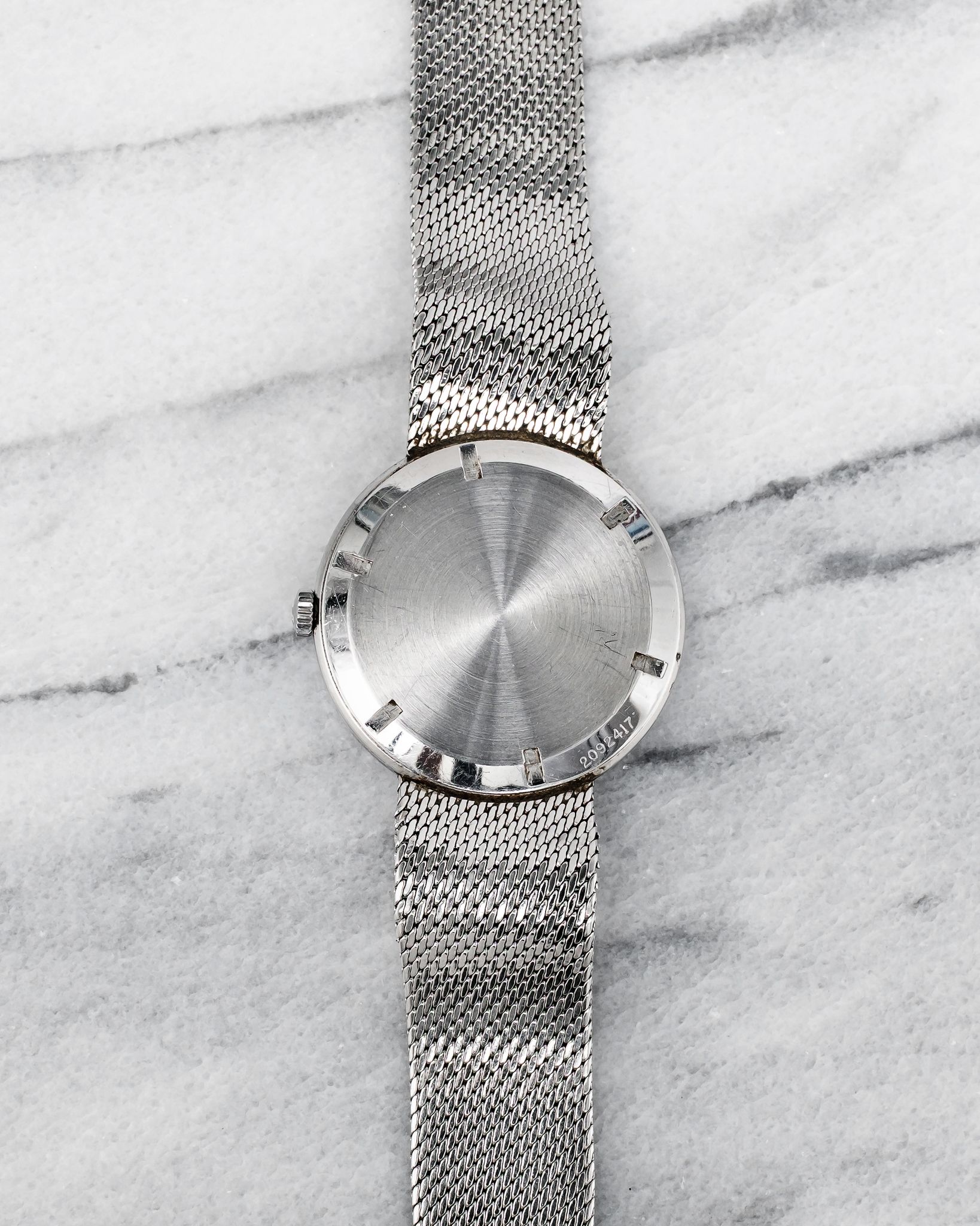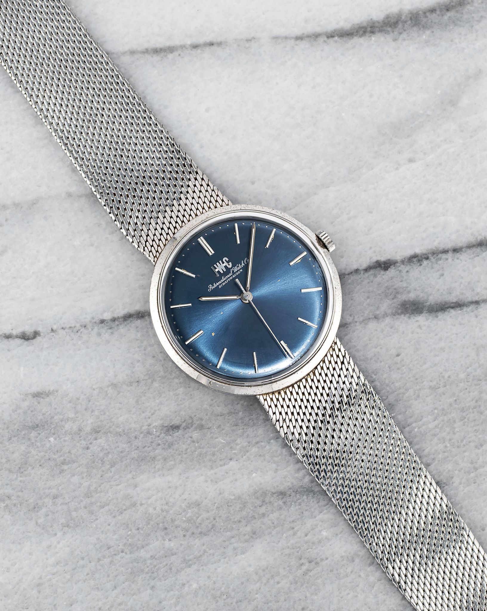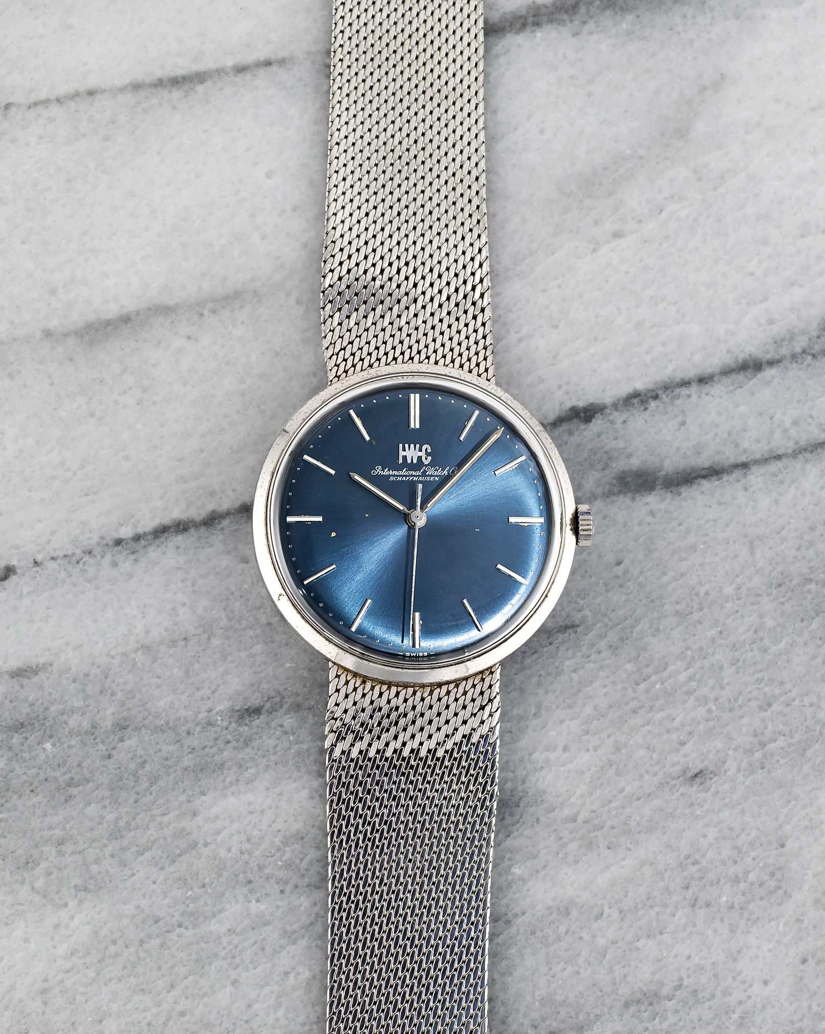 Here's a vintage IWC manual wind with a beautiful blue sunburst dial on a steel mesh bracelet from the 1970s. Keeps great time and is fully functional. Measurements include a 34mm case size and an integrated mesh bracelet that fits up to a 7.25 inch wrist. Snapback caseback. Manual wind caliber 403. Stainless steel case. Dotted minute track throughout the dial. A few marks on the dial as seen in photos. Blue dials from IWC in this era are not common so it's interesting to see. Makes for a great dress watch or for casual wear. Both the dial and crystal are free of any scratches or marks. All parts are original including the crown, dial, movement, and case back. Both the dial and case are in great cosmetic, untouched condition.