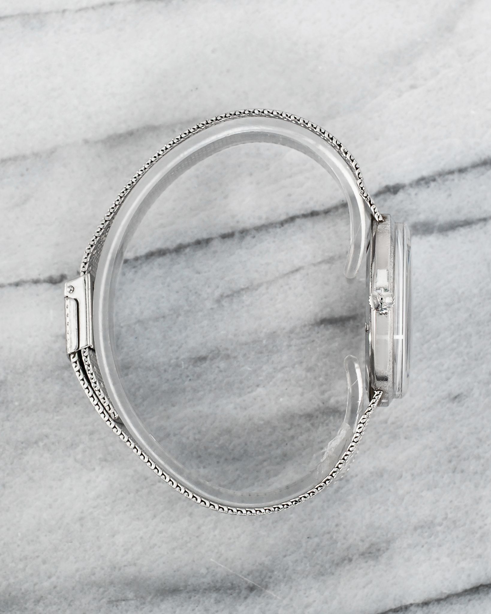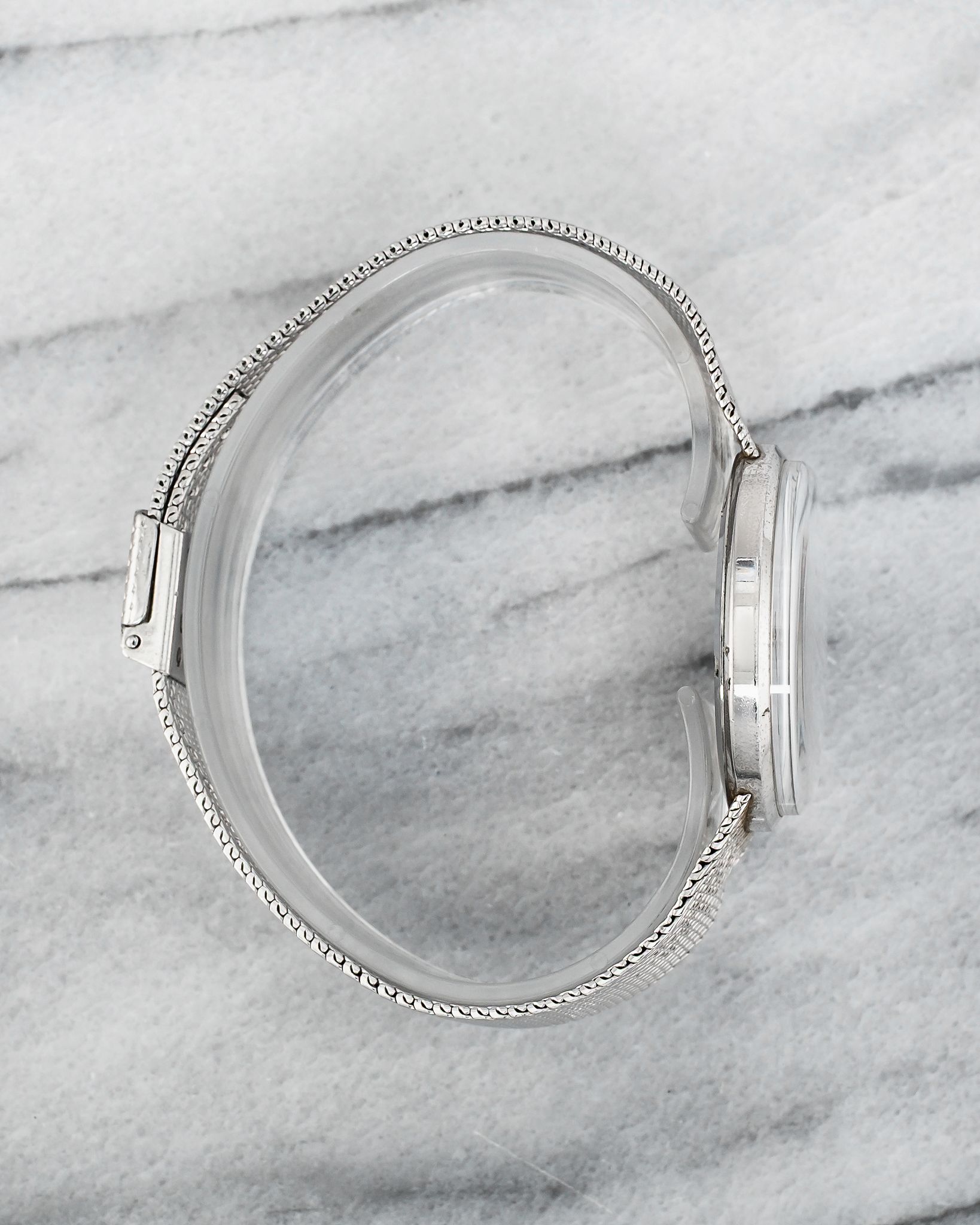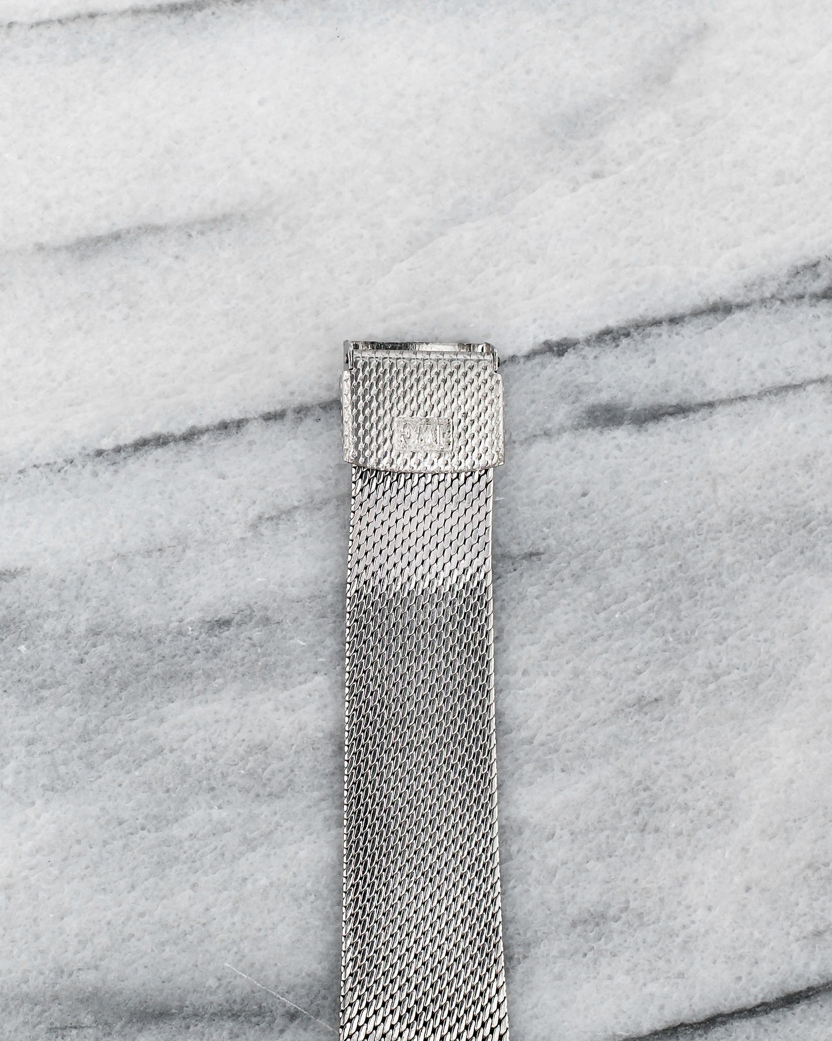 Here's a vintage IWC manual wind with a beautiful blue sunburst dial on a steel mesh bracelet from the 1970s. Keeps great time and is fully functional. Measurements include a 34mm case size and an integrated mesh bracelet that fits up to a 7.25 inch wrist. Snapback caseback. Manual wind caliber 403. Stainless steel case. Dotted minute track throughout the dial. A few marks on the dial as seen in photos. Blue dials from IWC in this era are not common so it's interesting to see. Makes for a great dress watch or for casual wear. Both the dial and crystal are free of any scratches or marks. All parts are original including the crown, dial, movement, and case back. Both the dial and case are in great cosmetic, untouched condition.