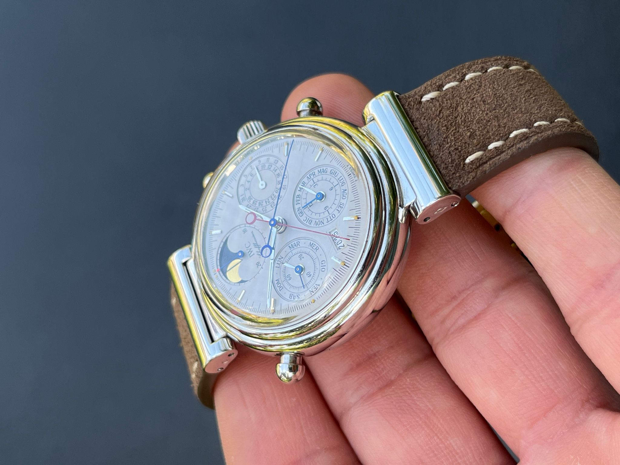 The IWC Da Vinci Perpetual Calendar Moonphase, reference IW3751, is an extraordinary horological masterpiece, presented here in its most exclusive form — crafted in solid platinum and produced in a limited edition of only 500 pieces worldwide, with this example numbered 230/500. This watch embodies IWC’s technical genius, featuring a fully integrated perpetual calendar that automatically accounts for the varying lengths of months and leap years, along with an exquisitely detailed moonphase display. Powered by the legendary IWC 79061 automatic movement, the complications are elegantly arranged on a rich silvered dial with contrasting sub-dials, applied markers, and blued hands, offering both clarity and sophistication. The iconic Da Vinci case design, with its articulated lugs, ensures exceptional comfort despite its substantial presence, while the platinum construction adds a weighty sense of prestige and rarity. Complete with its original limited-edition markings, this IW3751 represents not only a pinnacle of IWC’s engineering but also a highly collectible piece of watchmaking art for the connoisseur who appreciates exclusivity, innovation, and timeless elegance.