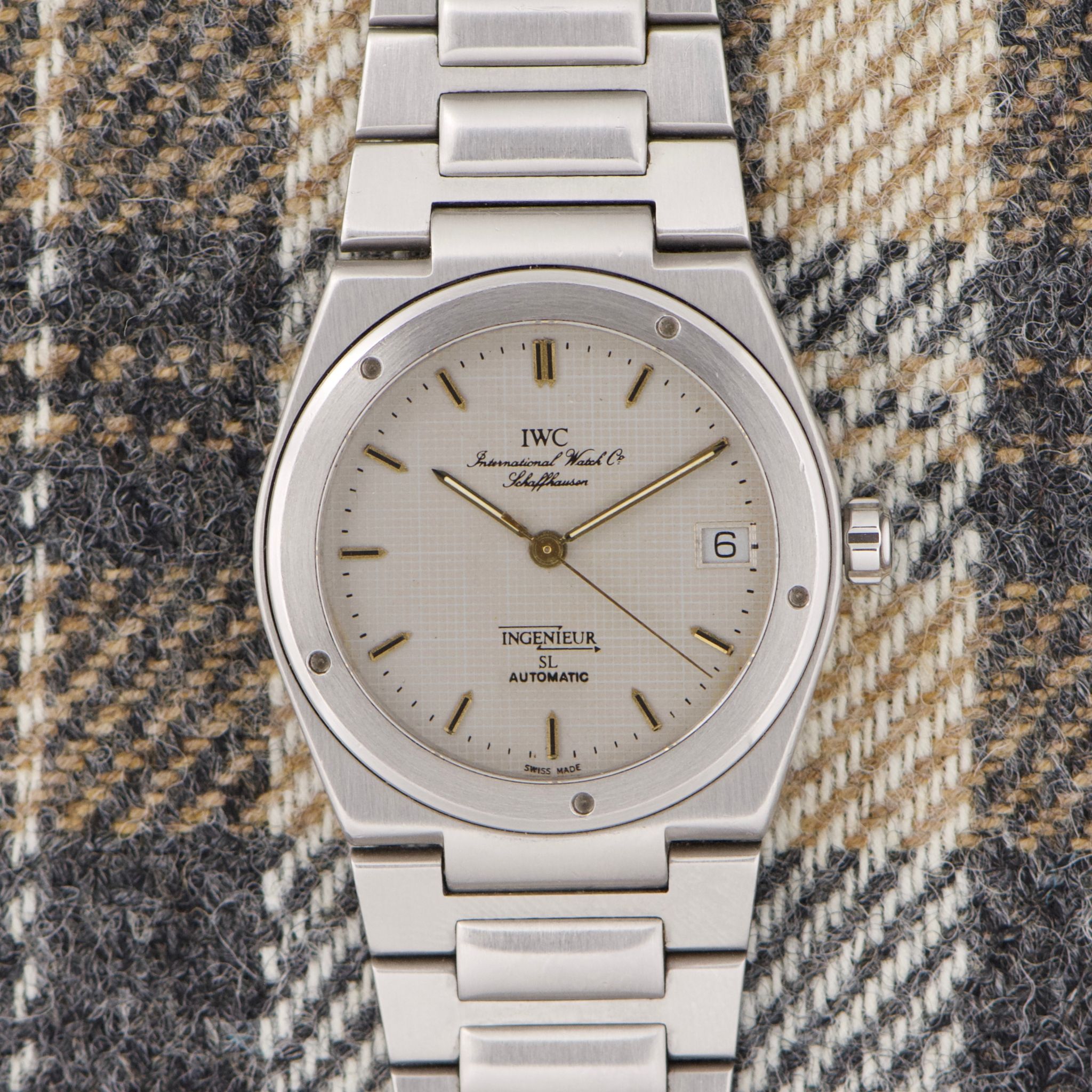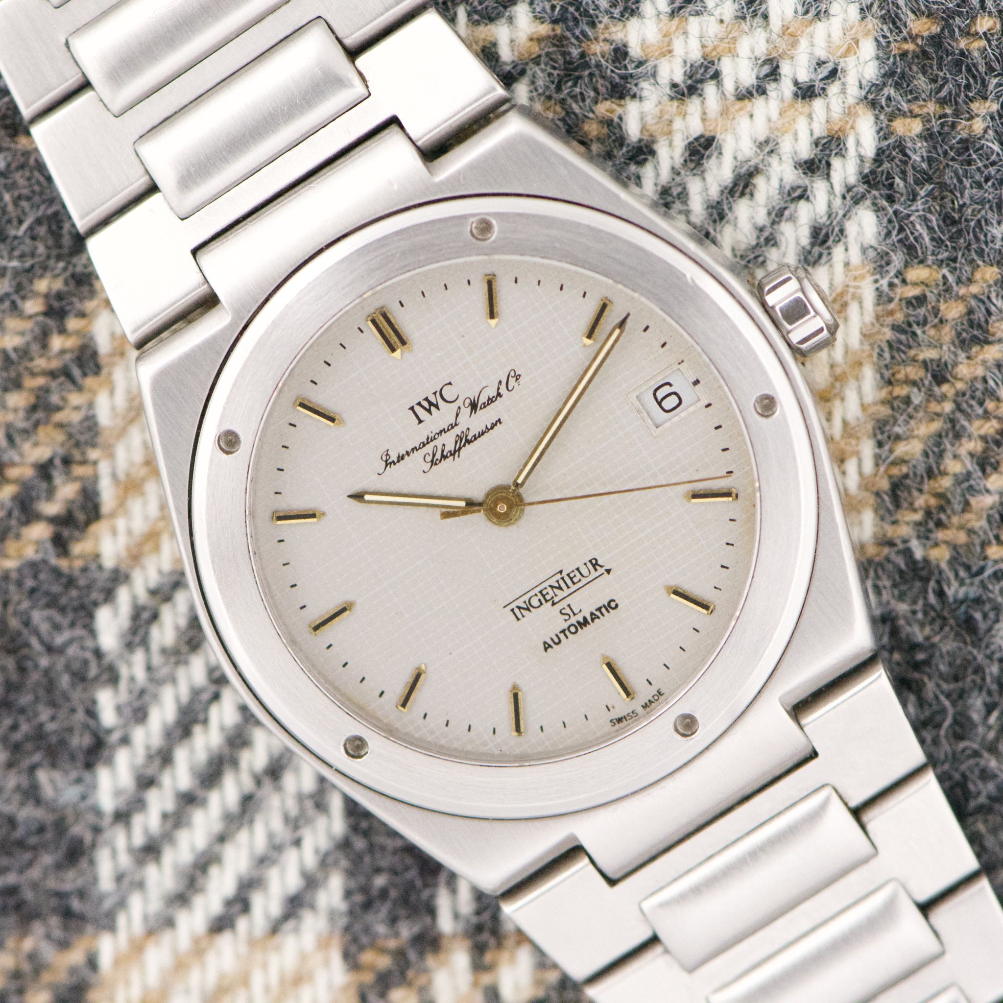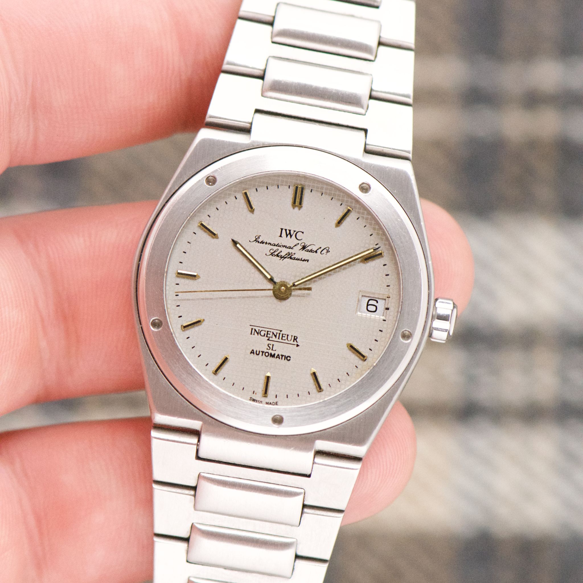 Case: The 34mm case is perfect. The SL was designed in the 80s because of the unpopularity of the larger-sized Ingenieur. However, it doesn't wear like a 34mm. It wears larger thanks to the integrated bracelet. The case is in great shape with normal signs of wear.