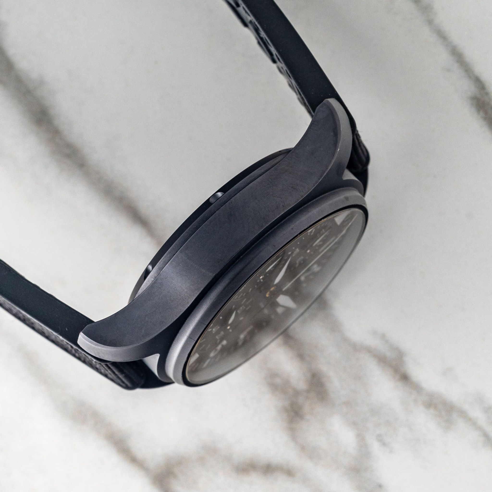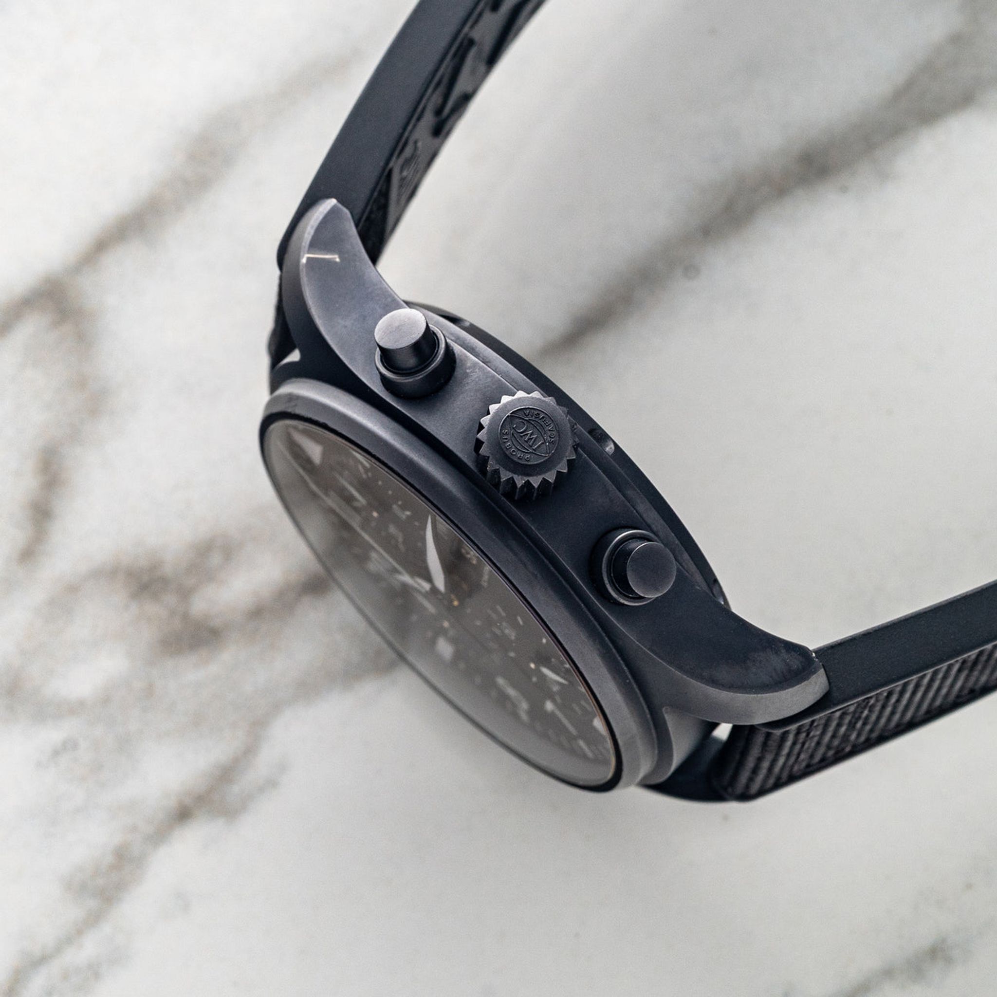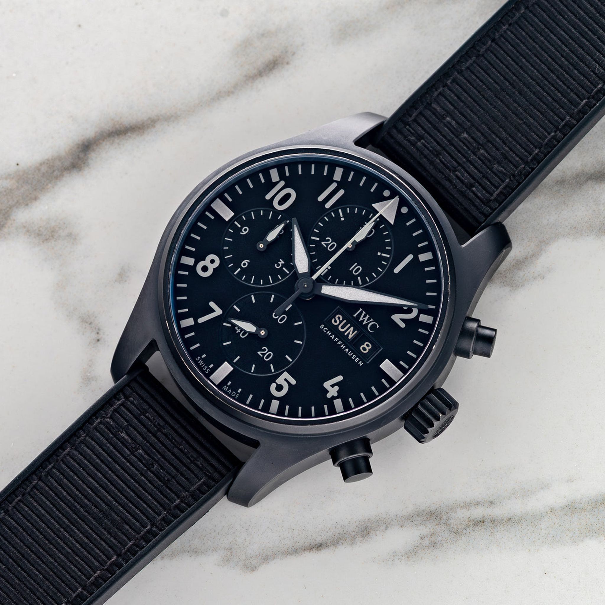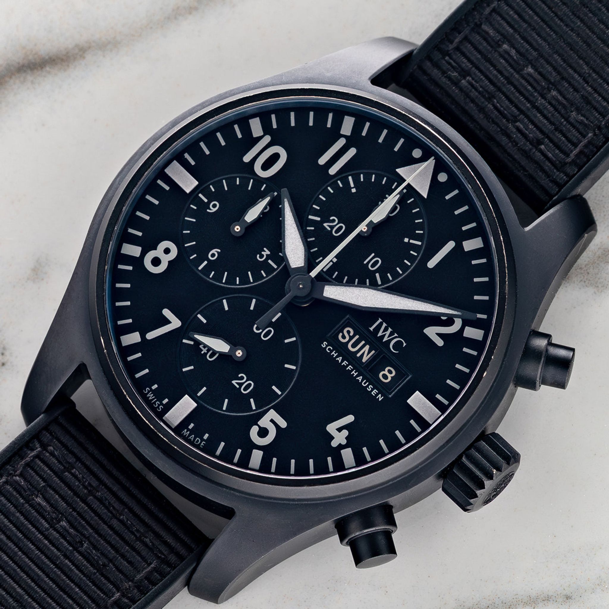 The IWC Pilot’s Watch Chronograph 41 Top Gun Ceratanium (Ref. IW388106) is a striking fusion of cutting-edge material science and aviation heritage. Crafted from Ceratanium, a proprietary IWC alloy that combines the lightweight, durable properties of titanium with the scratch resistance of ceramic, this timepiece is engineered for performance under pressure. Its stealthy matte-black finish, 41mm case, and monochromatic aesthetic give it a tactical and modern appeal. The watch is powered by the in-house IWC Calibre 69385, a robust automatic chronograph movement with a 46-hour power reserve and column wheel mechanism. Its functional design is enhanced with a sapphire crystal, luminous markers, and 100 meters of water resistance, making it a resilient companion for pilots and adventurers alike. The IW388106 exemplifies IWC’s mastery in combining precision engineering with avant-garde materials, all while honoring its deep-rooted aviation legacy.