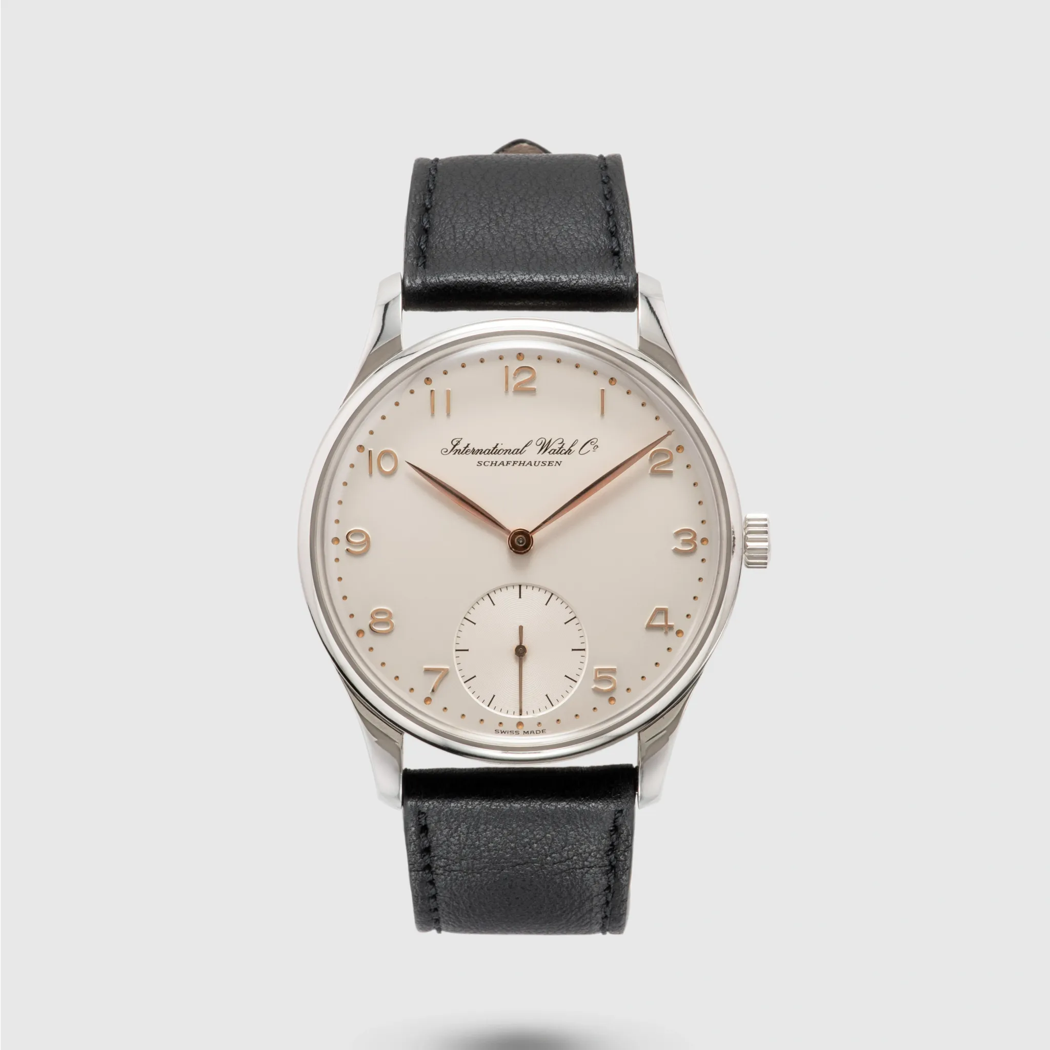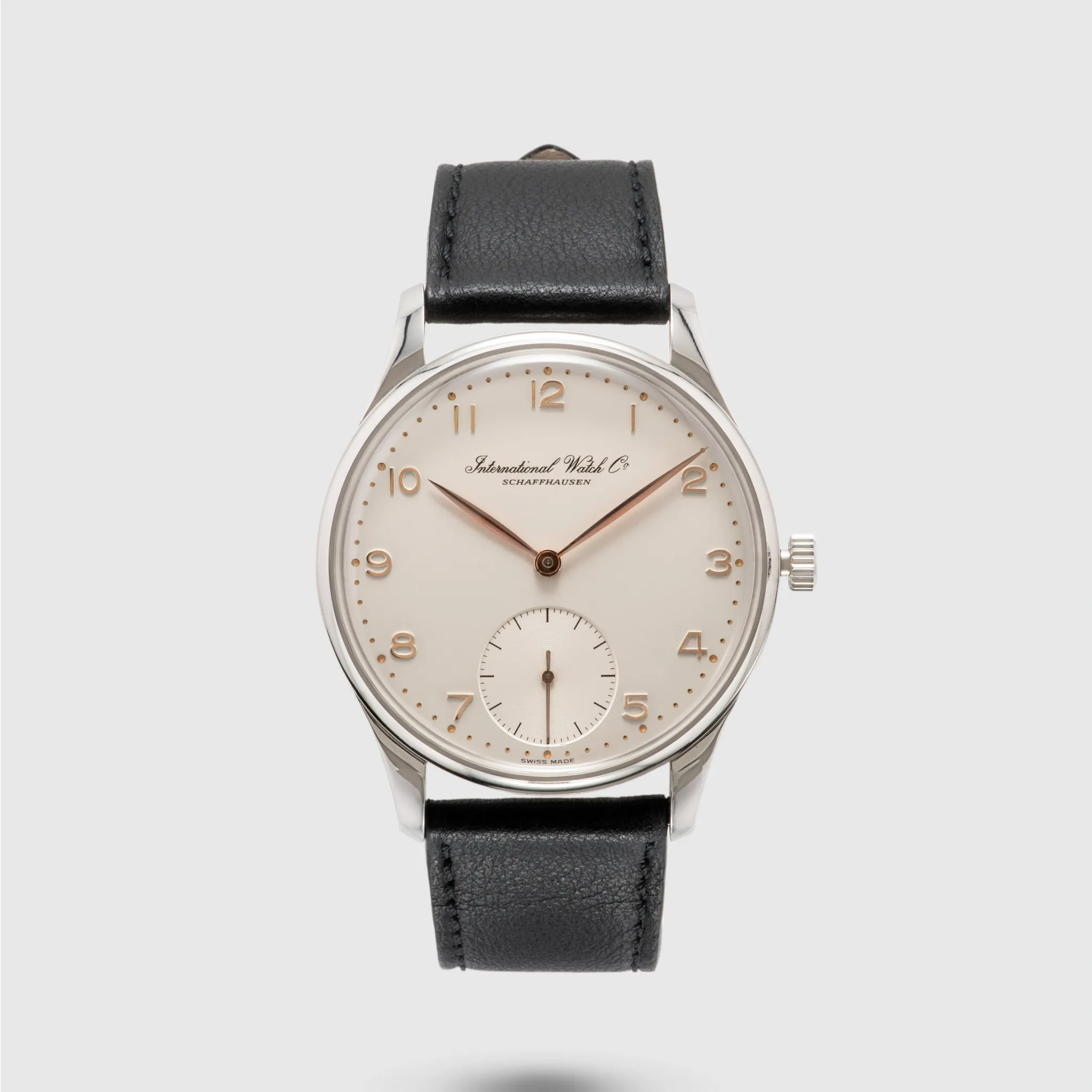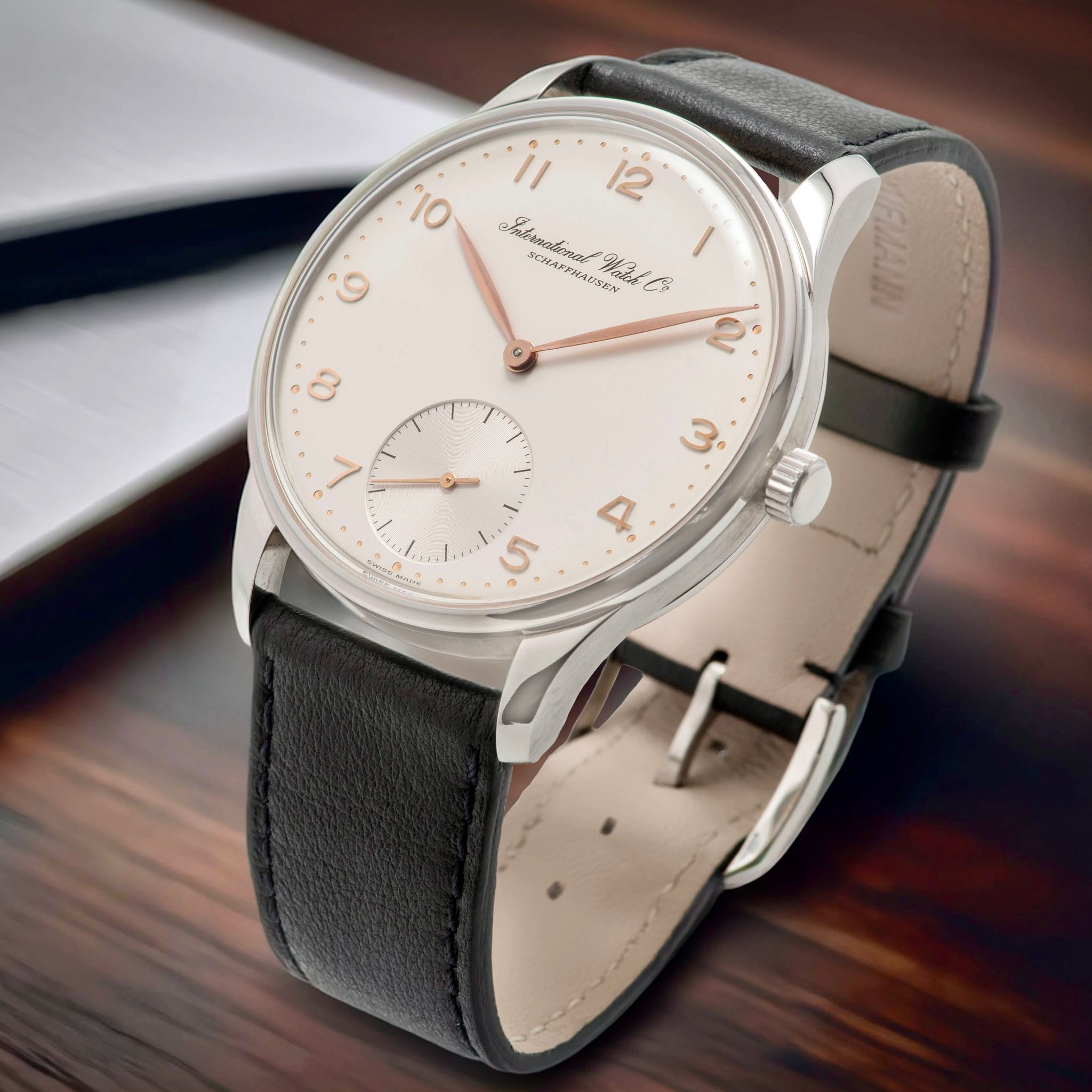 The silvered dial features very subtle pink gold Arabic numerals and pink leaf hands. To commemorate the original Portugierser it has a domed plexi glass, the case back on the other side allows to admire the beautifully finished Cal 9828 manual winding movement.