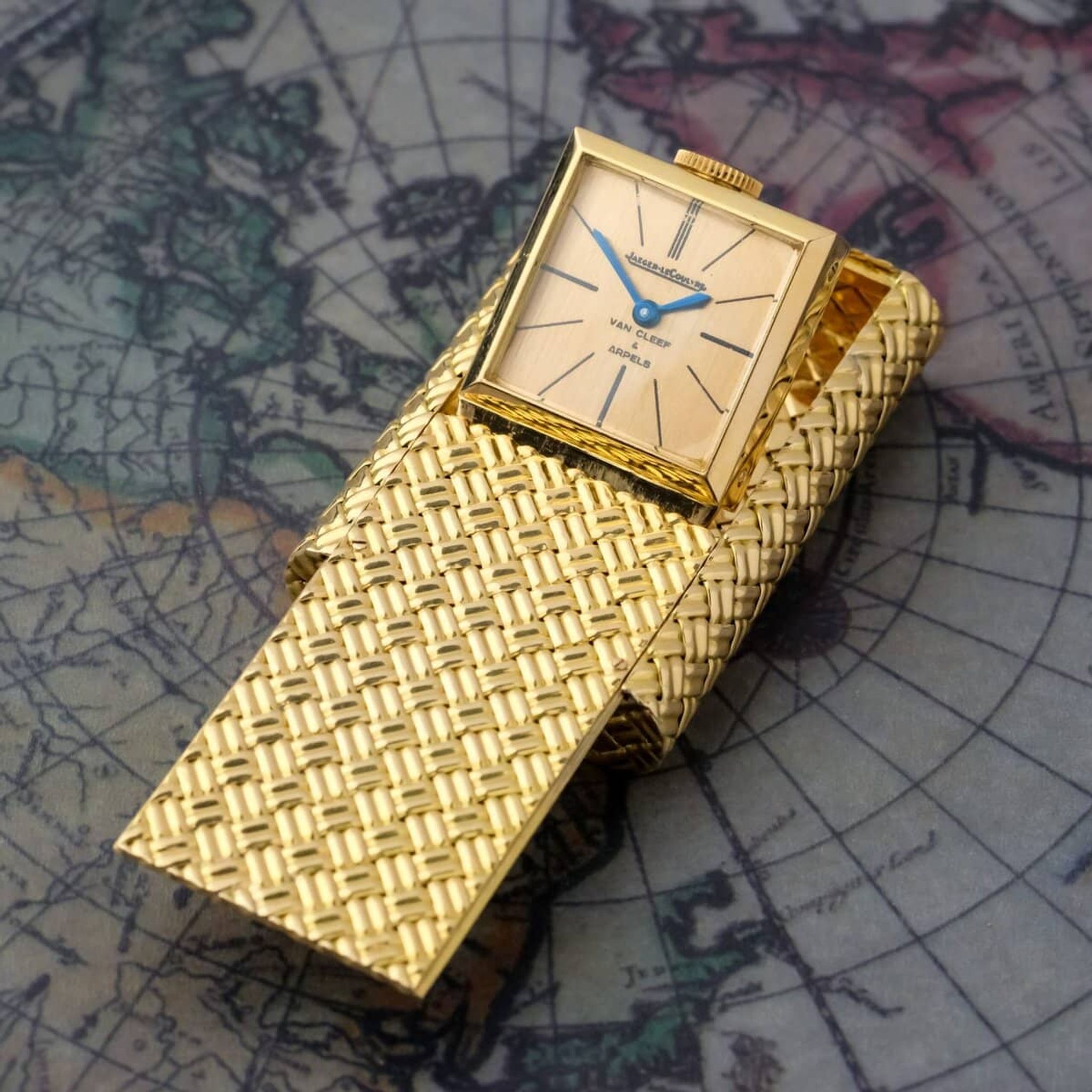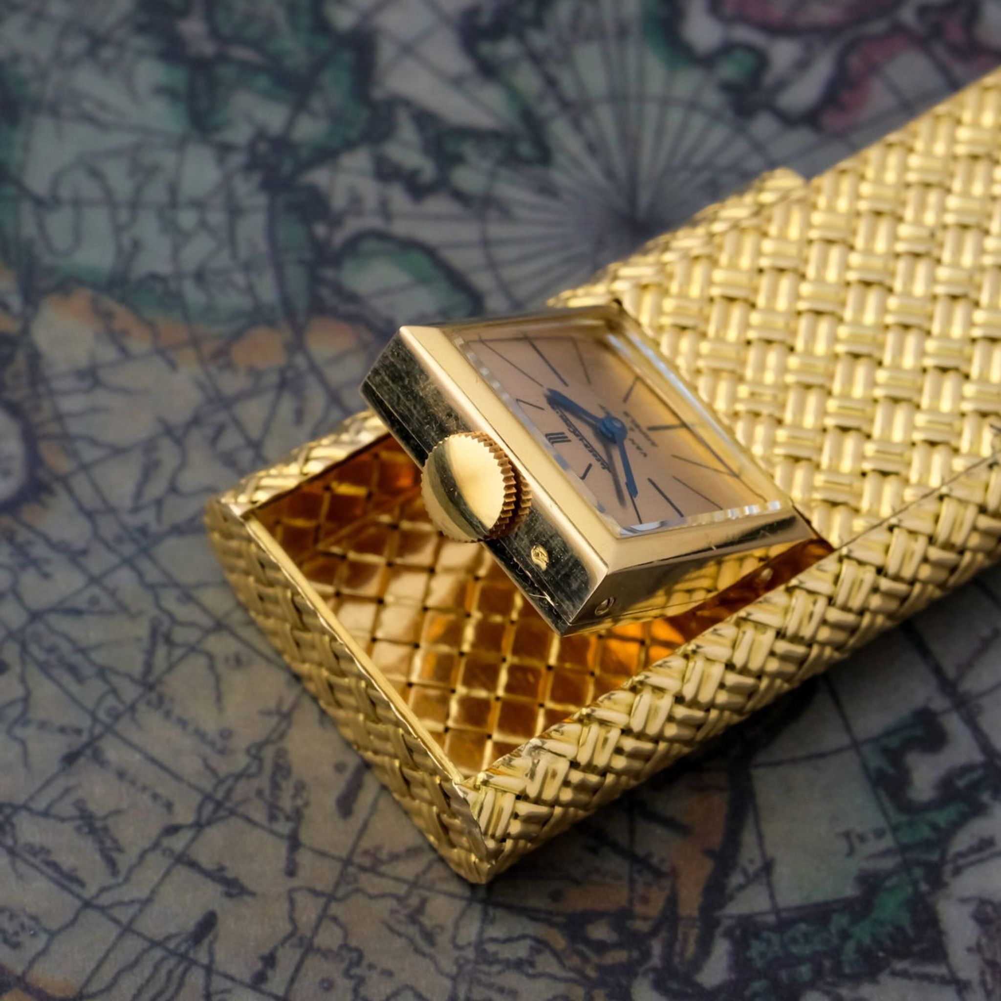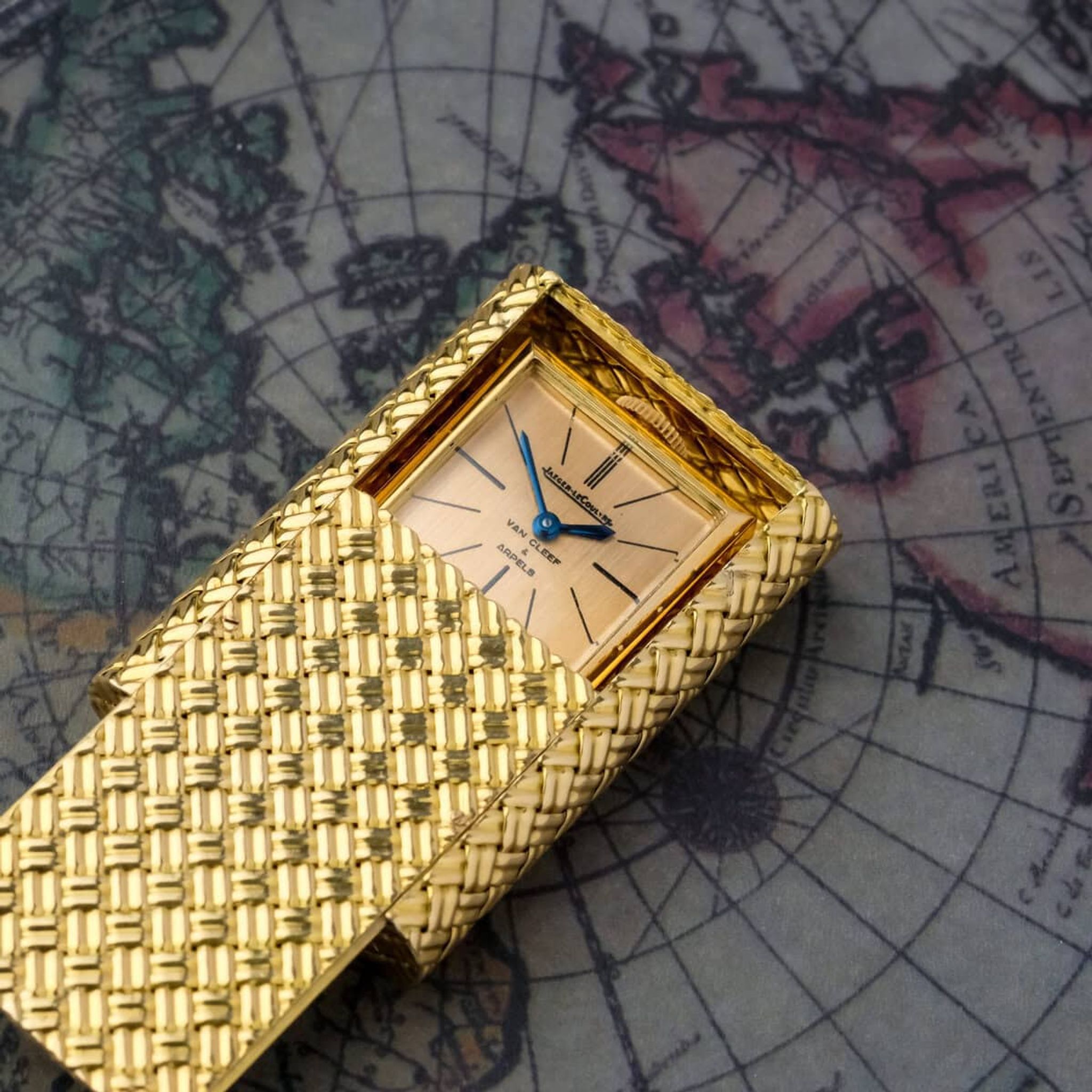 The design captures the discreet luxury and technical creativity that defined mid-century collaborations between Jaeger LeCoultre and Van Cleef & Arpels. The case is preserved in very good overall condition, showing sharp lines, beautifully finished surfaces, and crisp hallmarks that attest to its originality and quality.