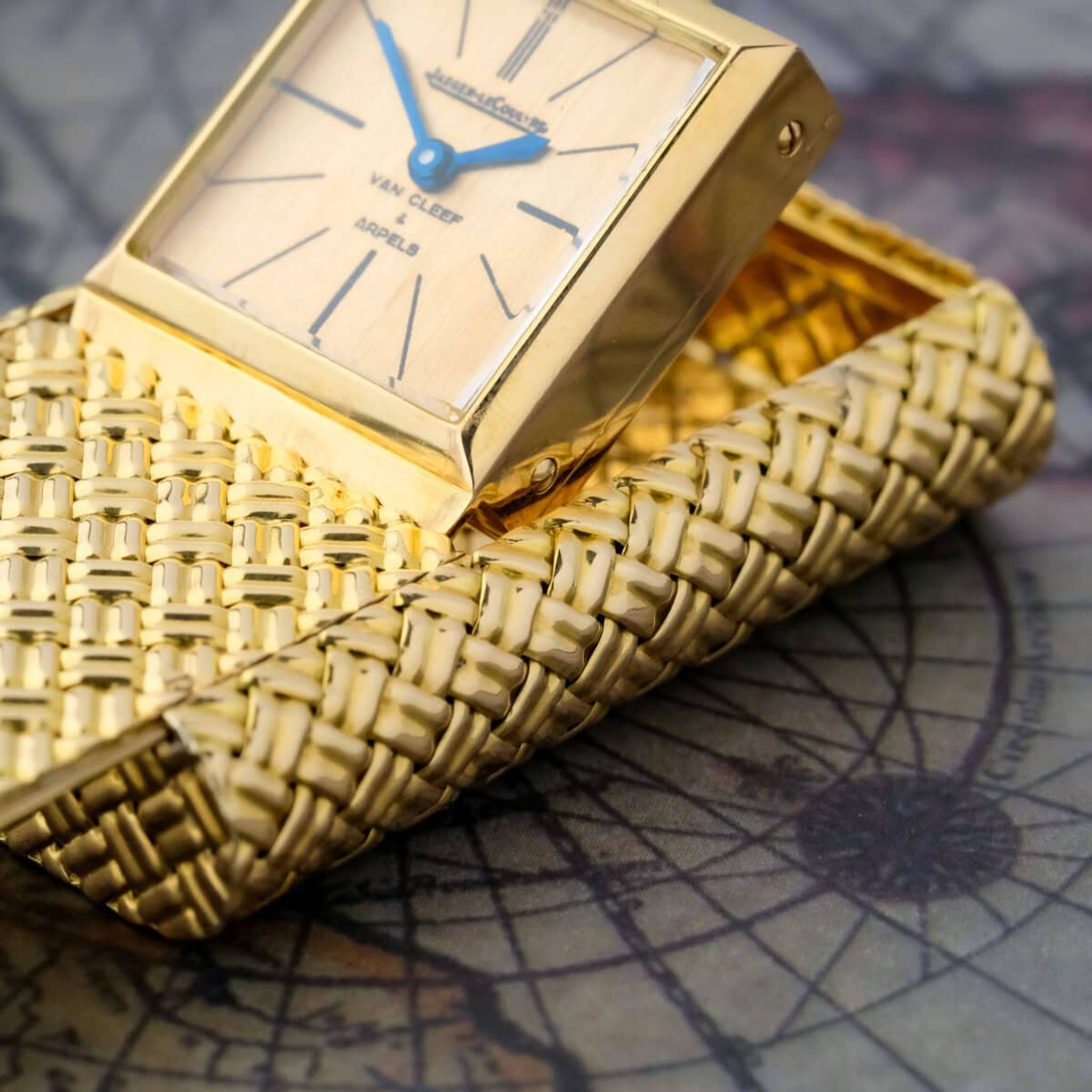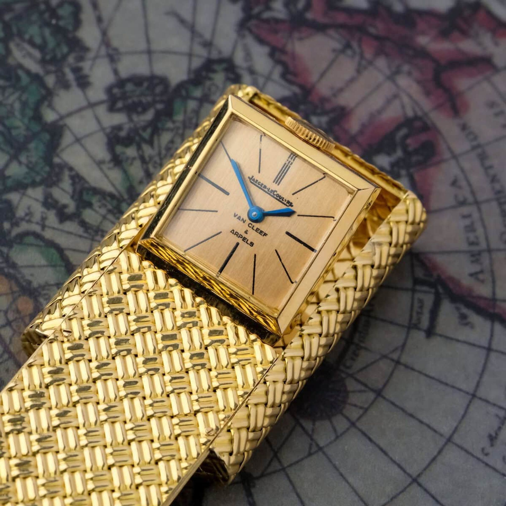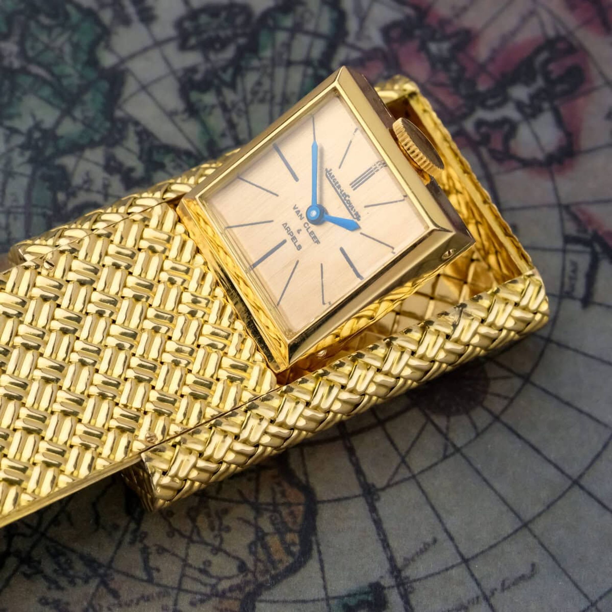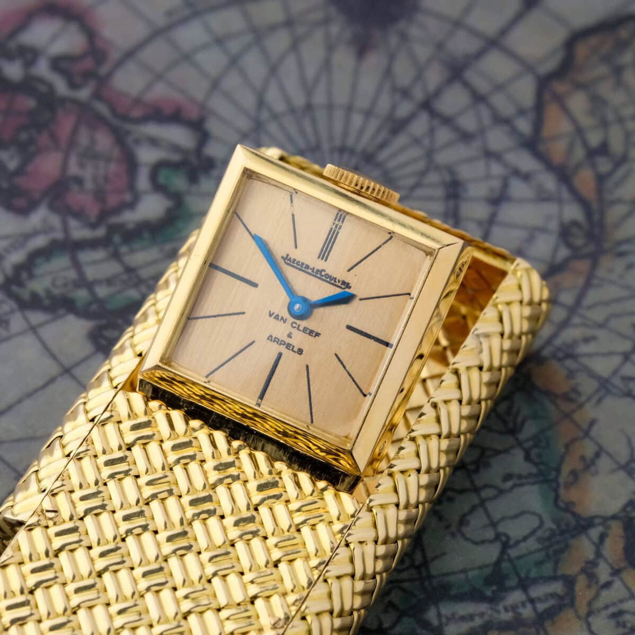 The design captures the discreet luxury and technical creativity that defined mid-century collaborations between Jaeger LeCoultre and Van Cleef & Arpels. The case is preserved in very good overall condition, showing sharp lines, beautifully finished surfaces, and crisp hallmarks that attest to its originality and quality.