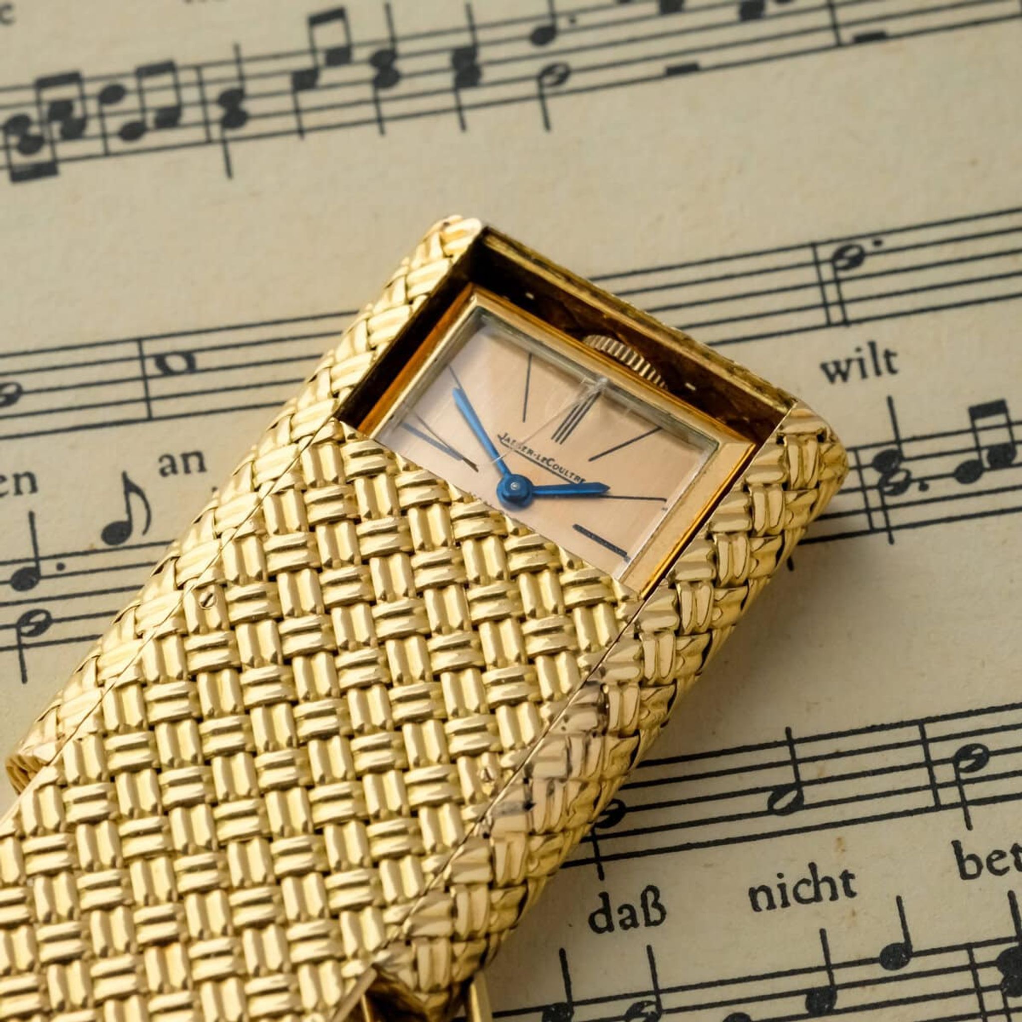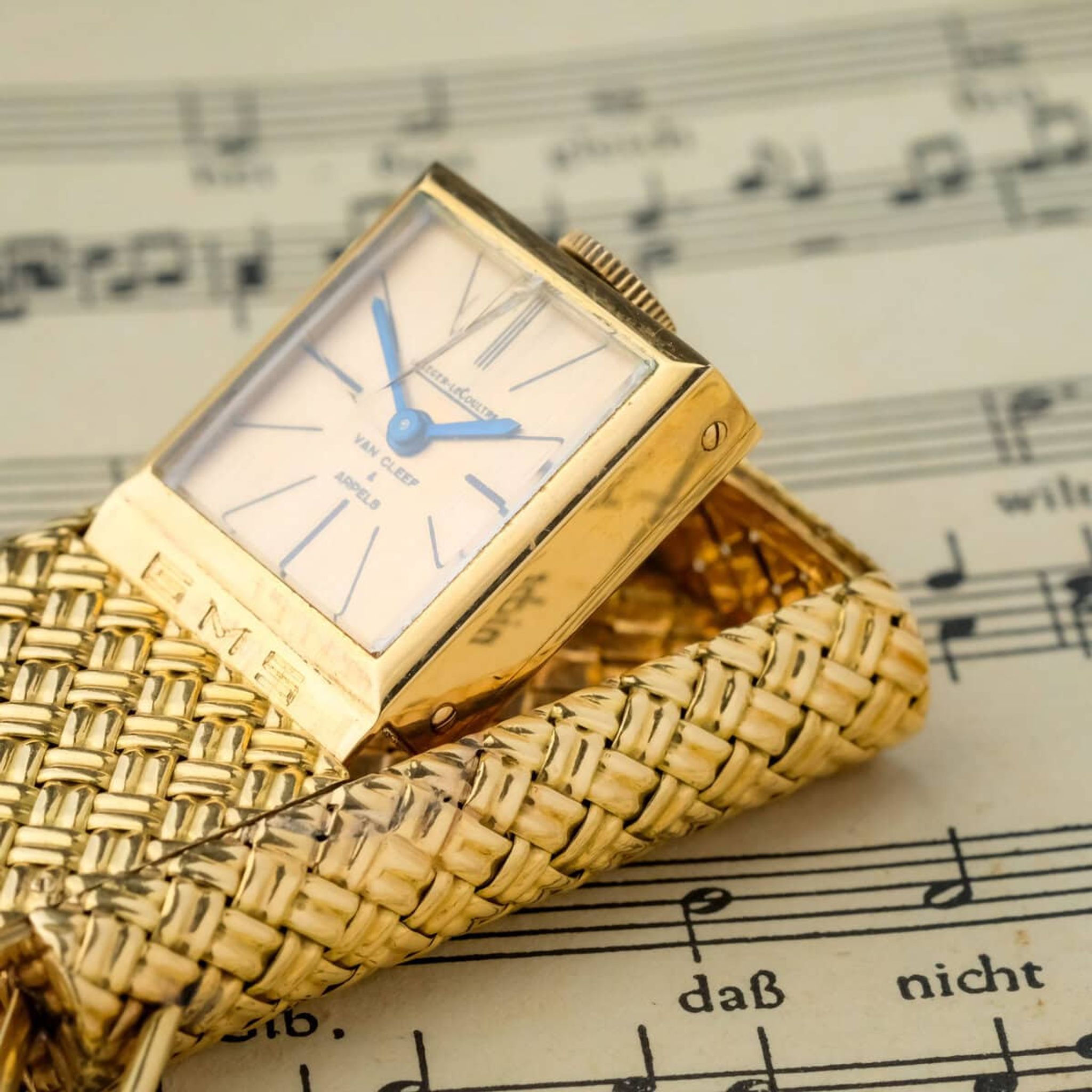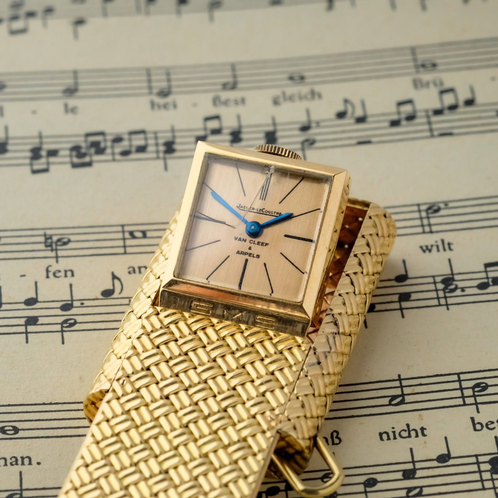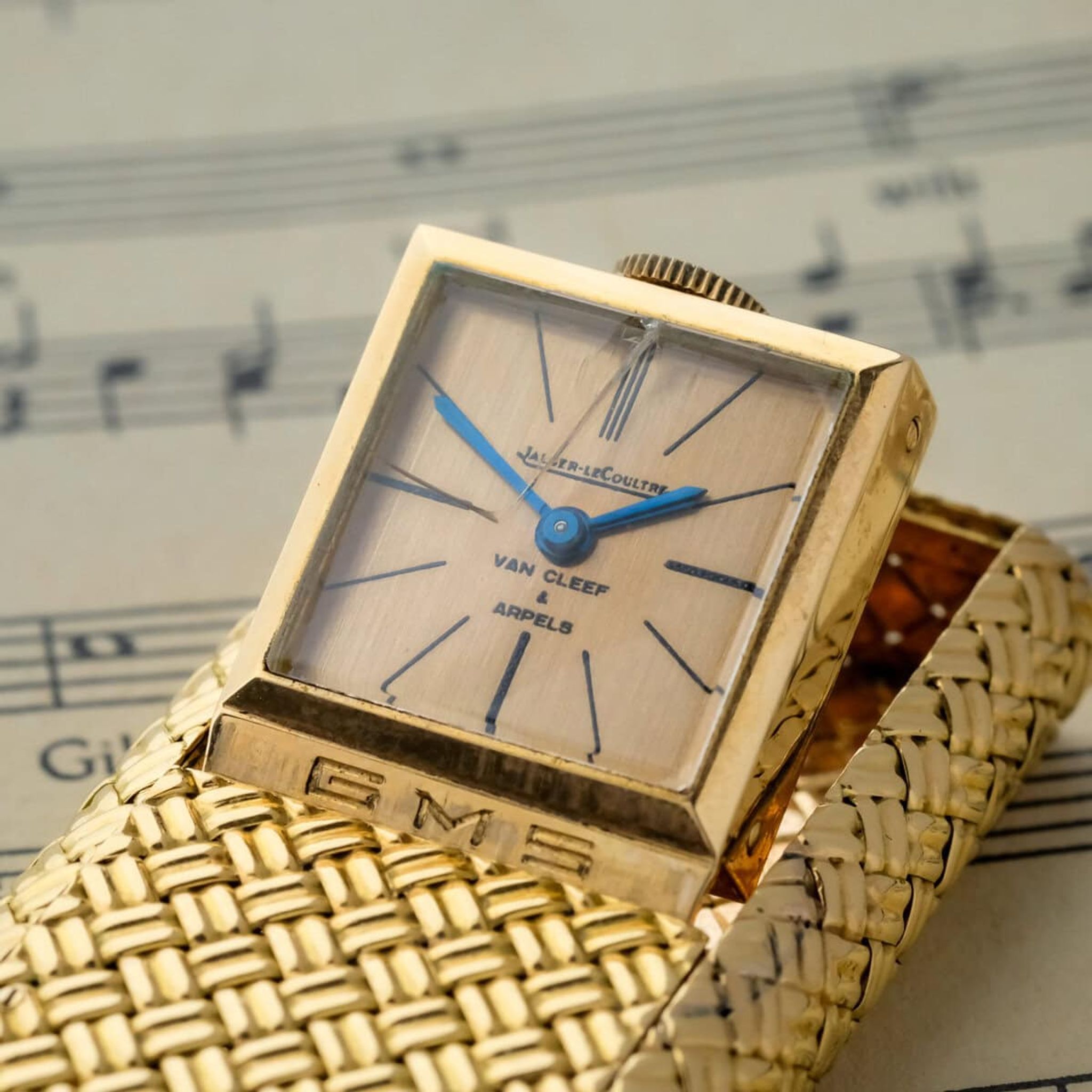 The champagne toned dial is signed by both Jaeger LeCoultre and Van Cleef & Arpels, underscoring the prestigious collaboration between two of the most respected names in fine watchmaking and high jewelry. The blued hands and minimalist markers reflect a refined aesthetic that balances functionality with pure design elegance.