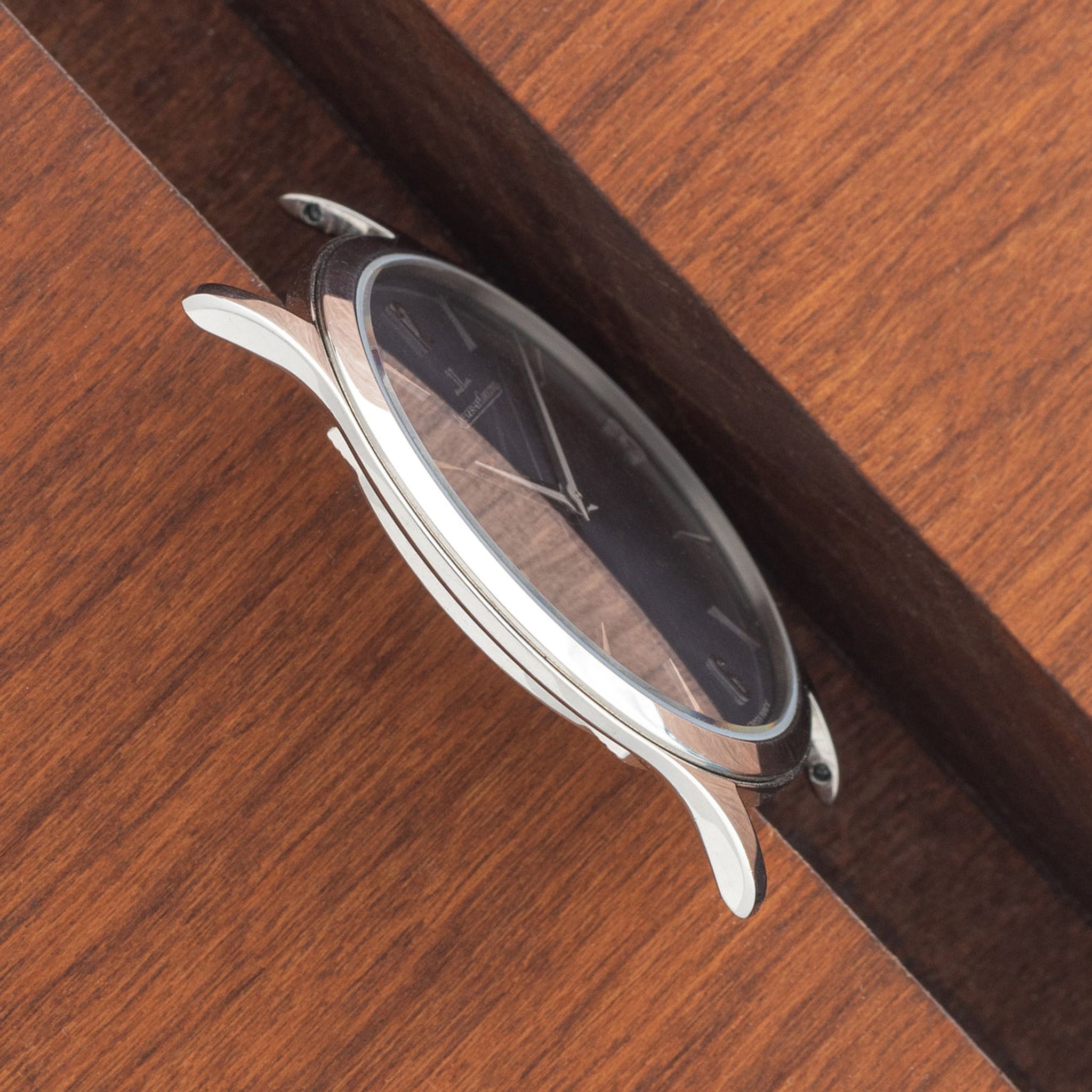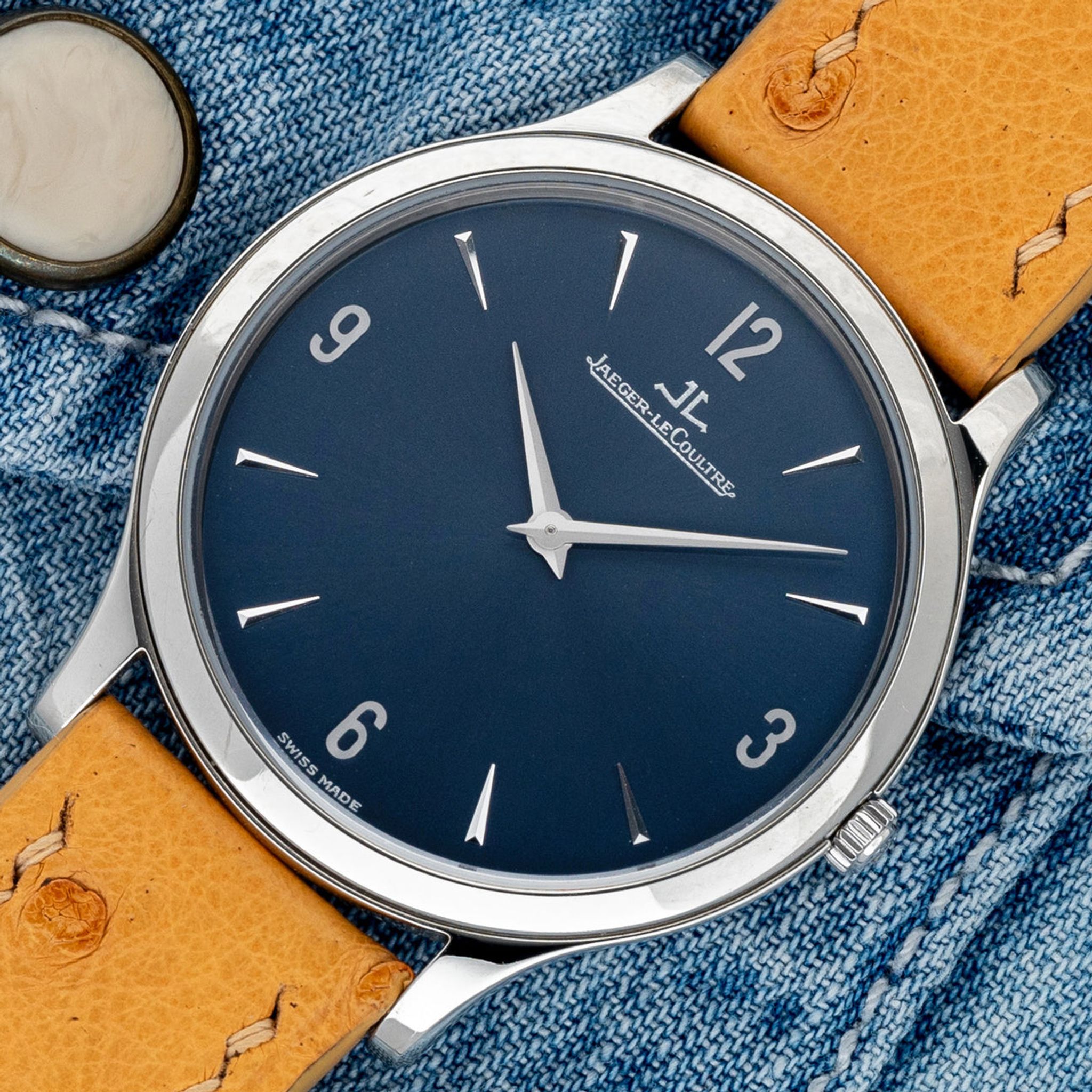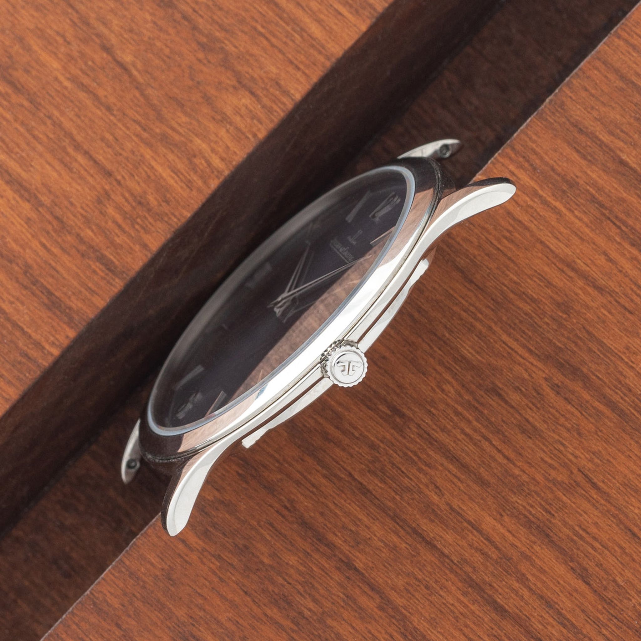 Without question, this ref. 145.6.79.S is our favorite Master Ultra Thin model for its gorgeous and minimalist dial layout. We'd even go as far as calling this "the 1016 of dress watches." These models housed the cal. 849 manual-winding JLC caliber which measures an impressive 1.85mm thick. This reliable and ultra-thin movement allowed for an impressively thin case of just 5.4mm, adding to the elegance of this piece. To boot, these were also rated to 5 atmospheres, making them practical to wear on rainy days. This particular example is a limited edition of just 250 pieces, circa early 2000s. It is housed in the most noble of metals - platinum and features a stunning blue/grey sunburst dial. The watch remains in fantastic and unpolished condition, includes its original platinum buckle/strap. If you've been looking for an interesting neo-vintage dress watch this piece is truly breathtaking and one we believe deserves much more attention in the coming years.
