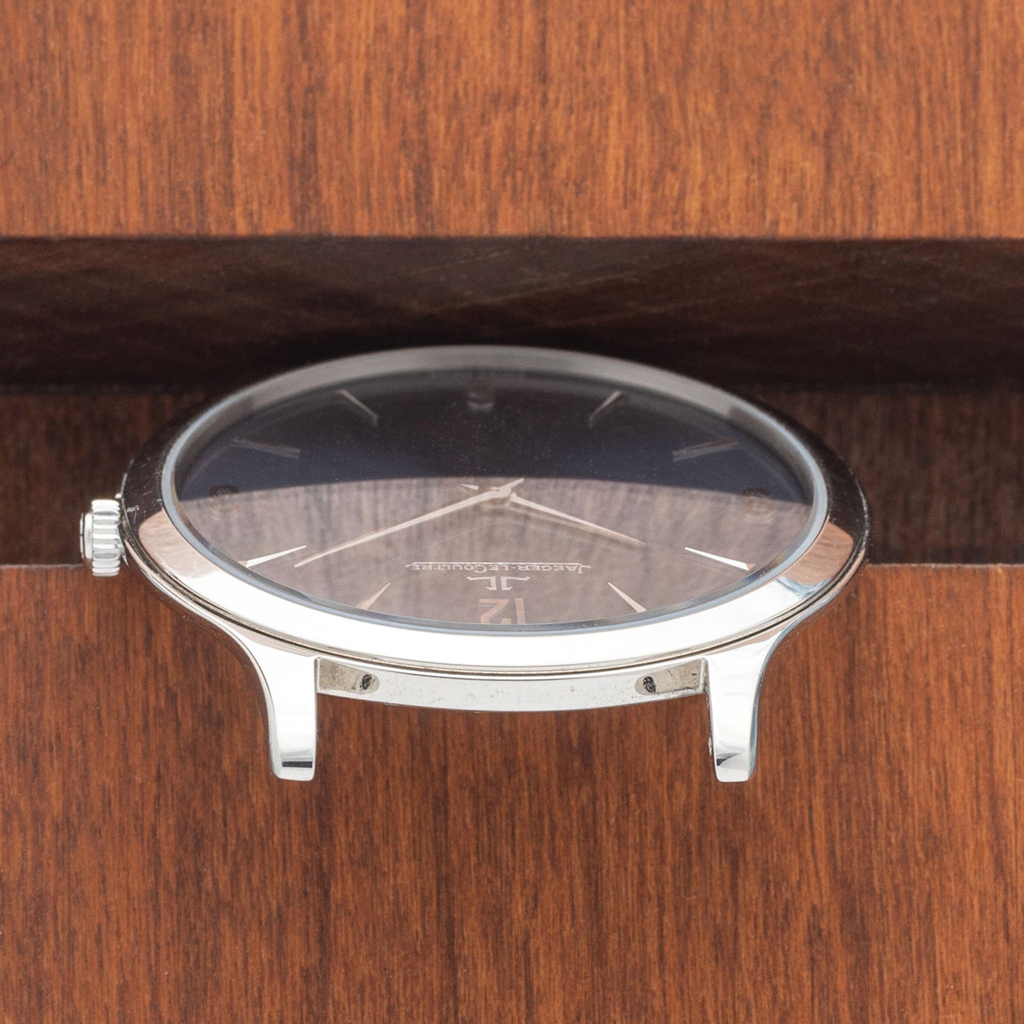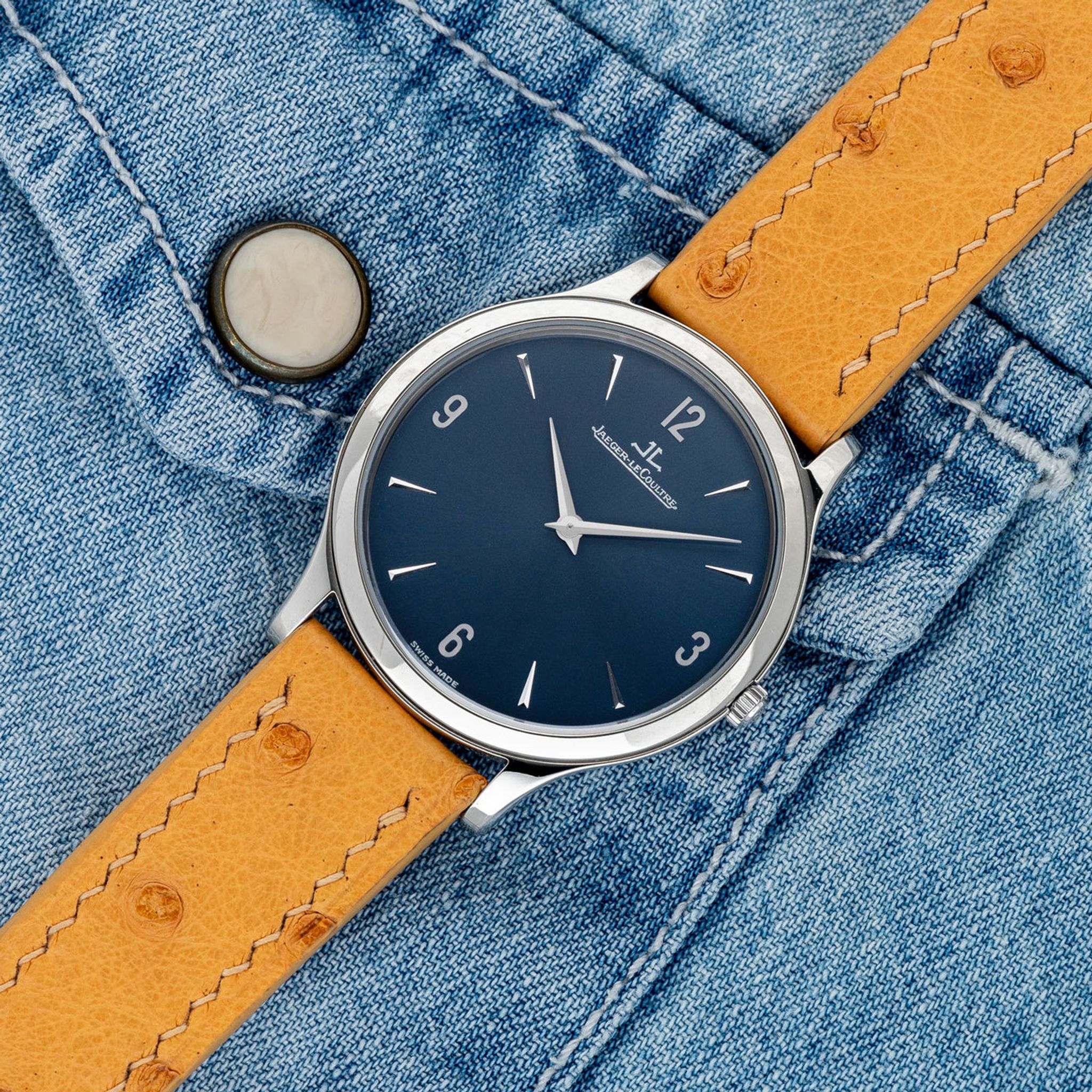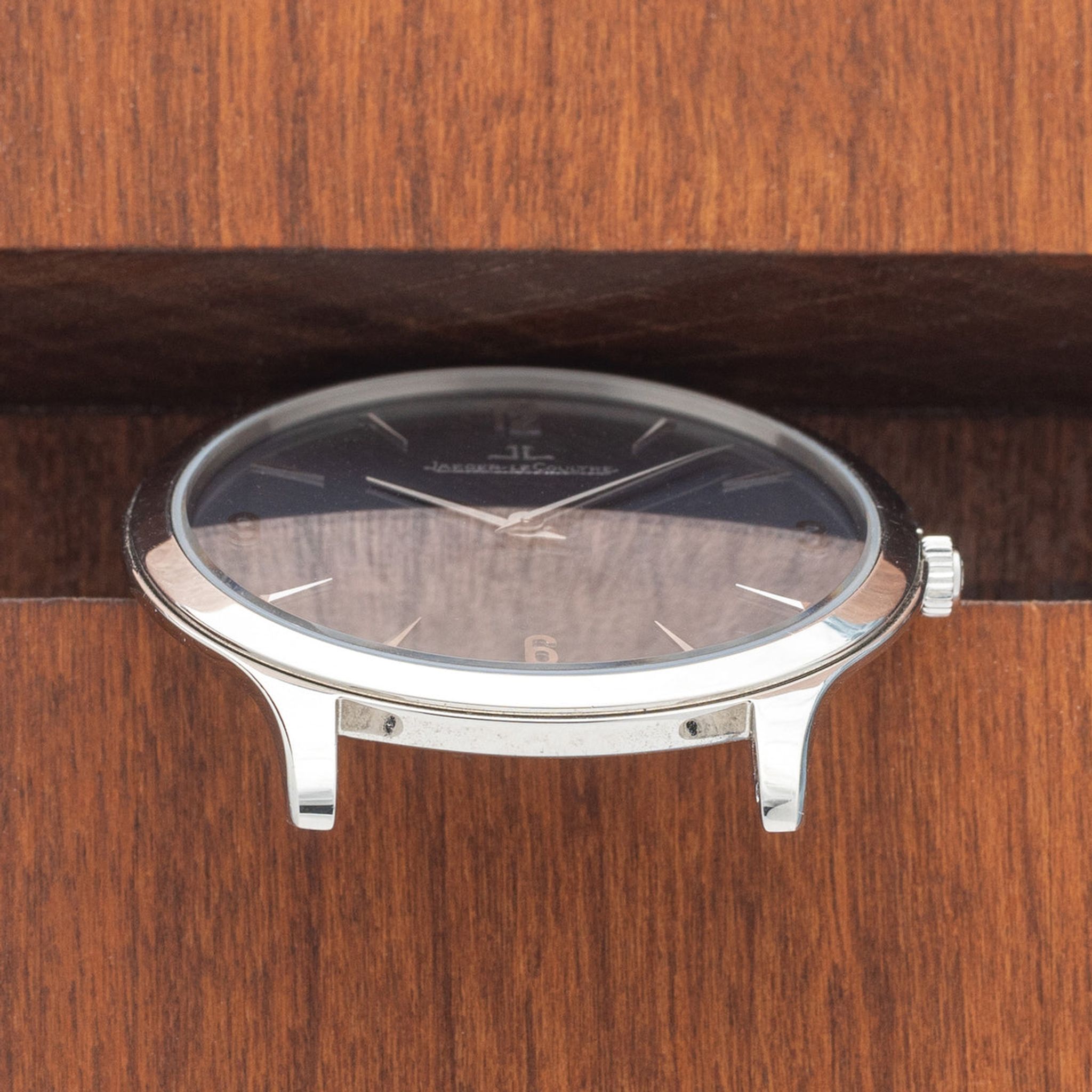 Without question, this ref. 145.6.79.S is our favorite Master Ultra Thin model for its gorgeous and minimalist dial layout. We'd even go as far as calling this "the 1016 of dress watches." These models housed the cal. 849 manual-winding JLC caliber which measures an impressive 1.85mm thick. This reliable and ultra-thin movement allowed for an impressively thin case of just 5.4mm, adding to the elegance of this piece. To boot, these were also rated to 5 atmospheres, making them practical to wear on rainy days. This particular example is a limited edition of just 250 pieces, circa early 2000s. It is housed in the most noble of metals - platinum and features a stunning blue/grey sunburst dial. The watch remains in fantastic and unpolished condition, includes its original platinum buckle/strap. If you've been looking for an interesting neo-vintage dress watch this piece is truly breathtaking and one we believe deserves much more attention in the coming years.