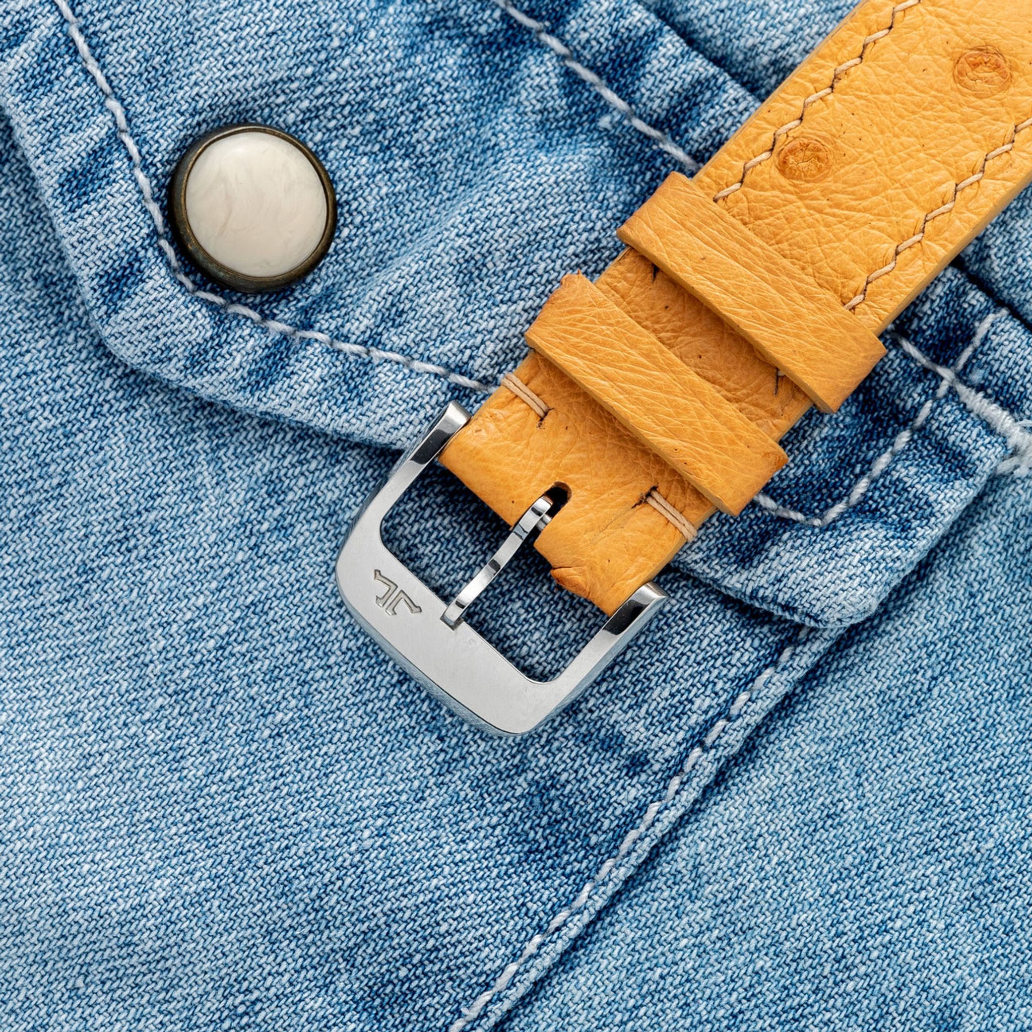 Bracelet: Platinum JLC signed buckle, original strap and custom made supple ostrich strap in orange. Crystal: Clear.