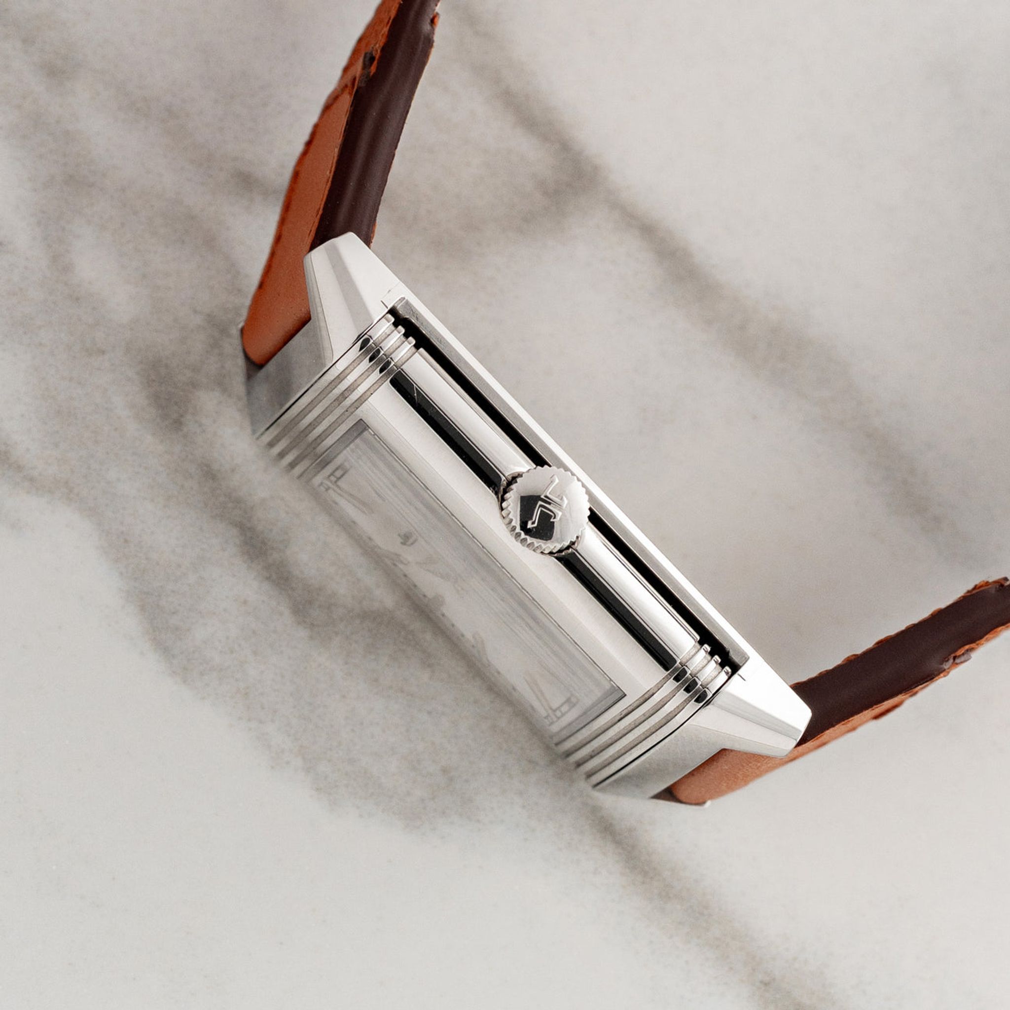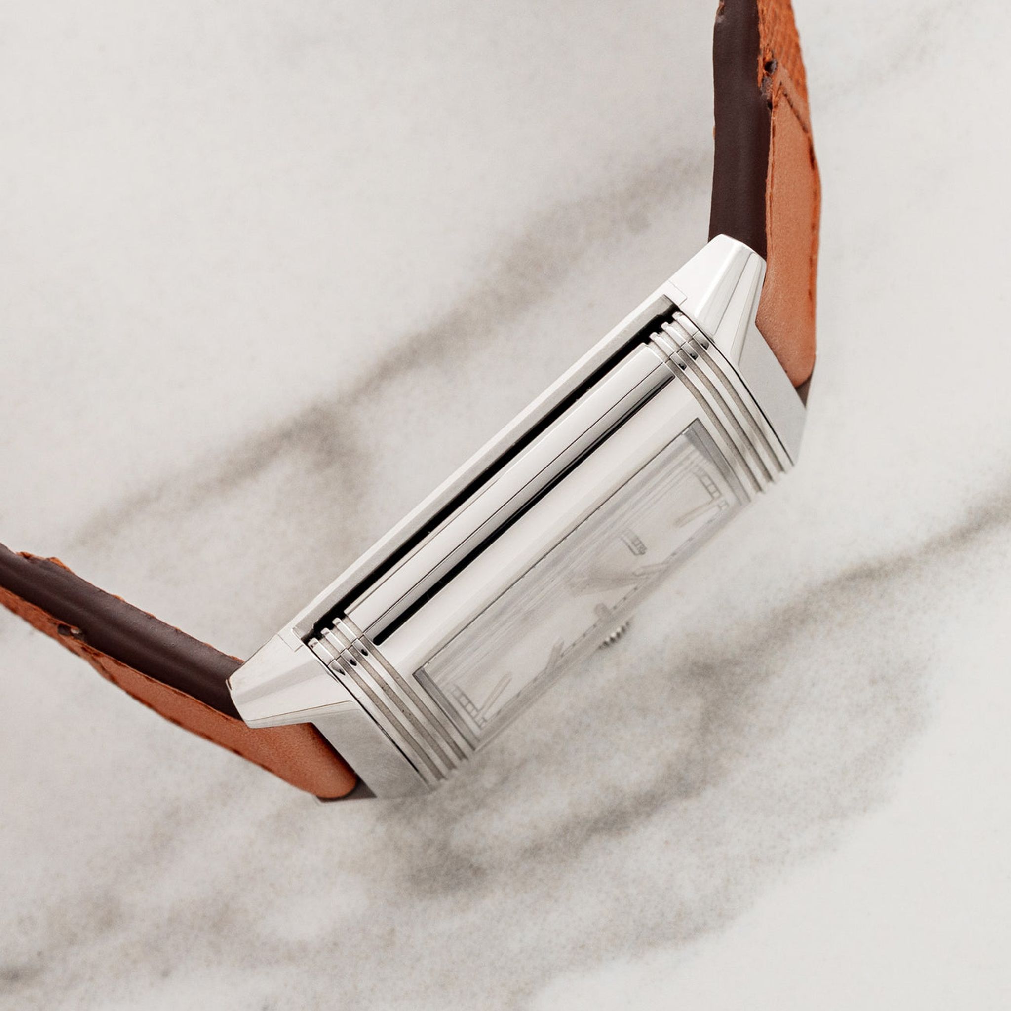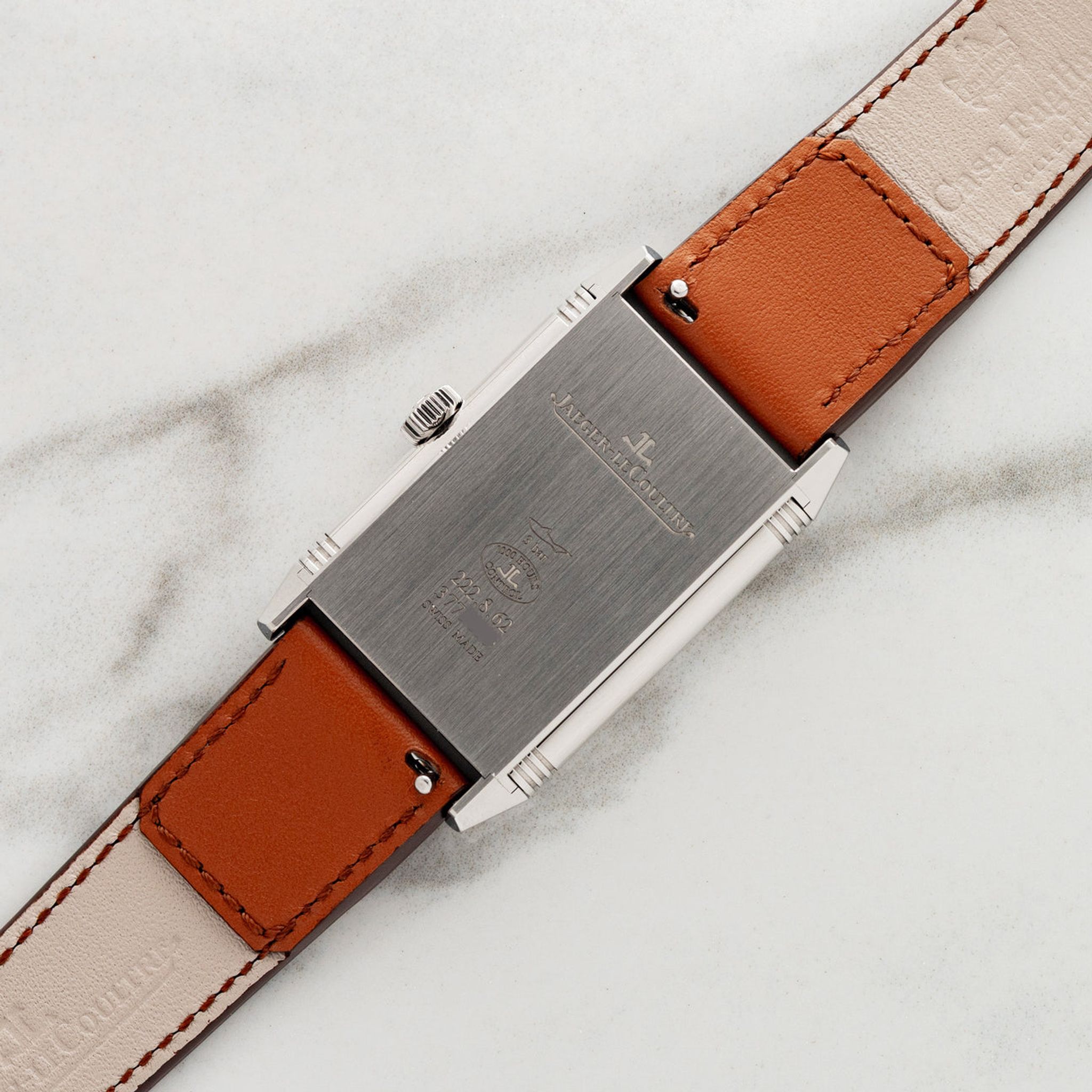 The Reverso Tribute Monoface is a refined reinterpretation of the iconic 1931 Reverso, blending timeless elegance with contemporary versatility. Measuring 24.5 x 40mm and just 7.5mm thick, its stainless steel case offers a comfortable for a good range of wrist sizes. The dial features classic Art Deco elements, including trapezoidal indexes, Dauphine hands, and a railway-track minute scale. Powered by the manual-winding Calibre 822, this movement is specifically designed to complement the Reverso's rectangular case, providing a 42-hour power reserve . A standout feature is the blank metal case-back, which invites personal engraving to imbue the watch with individual significance. The white dial makes this piece highly versatile and a good opportunity to rotate other quick release options such as the one provided. This piece on offer comes as a near mint and complete set with very minimal signs of handling.