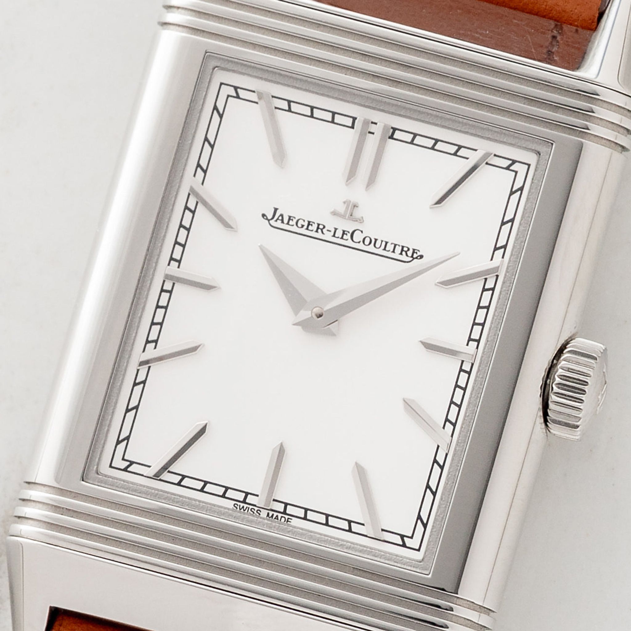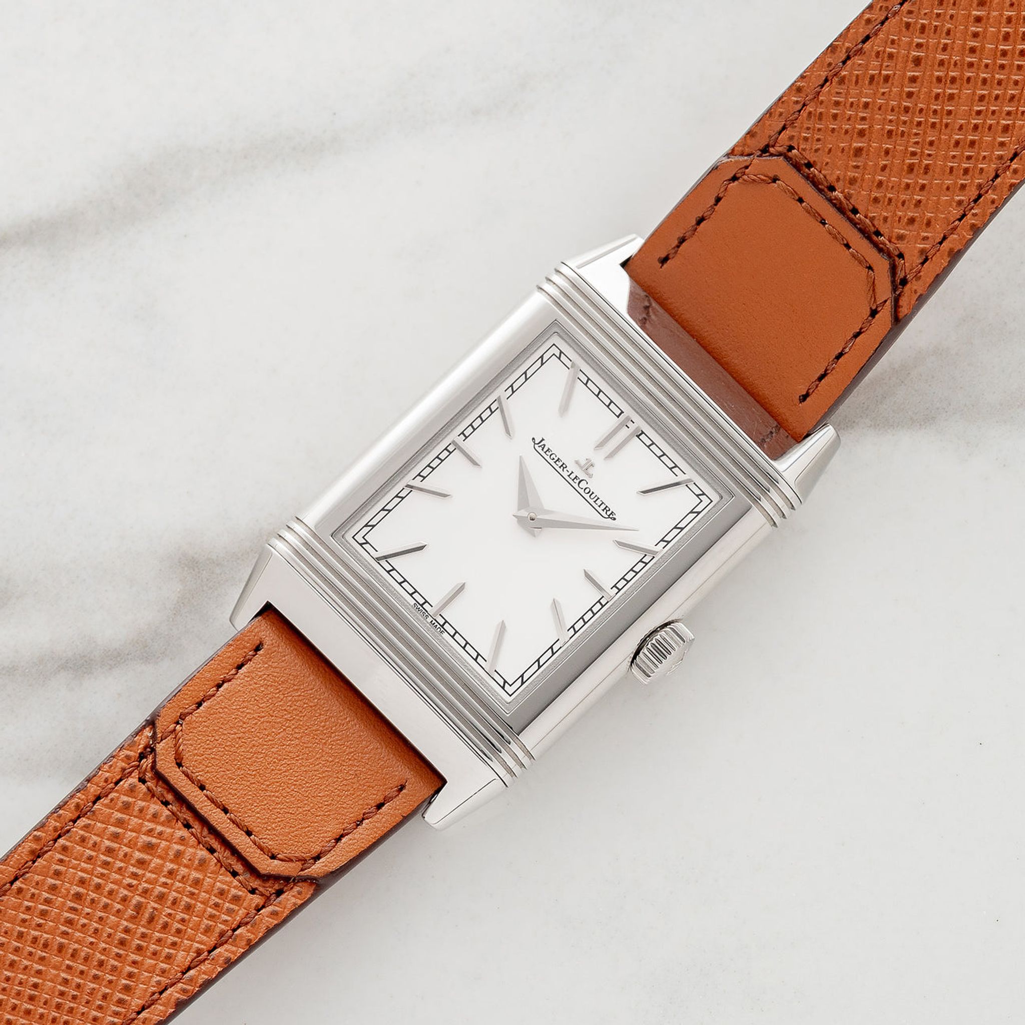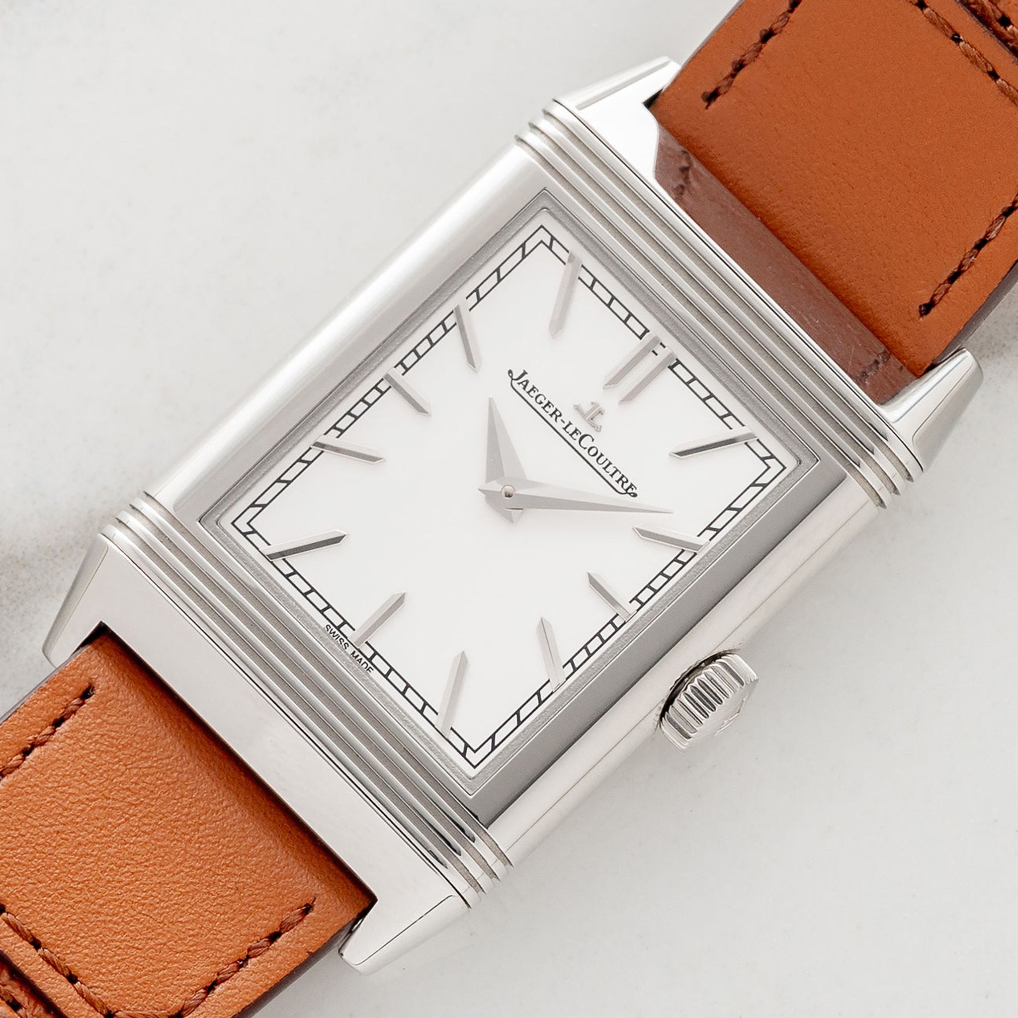 The Reverso Tribute Monoface is a refined reinterpretation of the iconic 1931 Reverso, blending timeless elegance with contemporary versatility. Measuring 24.5 x 40mm and just 7.5mm thick, its stainless steel case offers a comfortable for a good range of wrist sizes. The dial features classic Art Deco elements, including trapezoidal indexes, Dauphine hands, and a railway-track minute scale. Powered by the manual-winding Calibre 822, this movement is specifically designed to complement the Reverso's rectangular case, providing a 42-hour power reserve . A standout feature is the blank metal case-back, which invites personal engraving to imbue the watch with individual significance. The white dial makes this piece highly versatile and a good opportunity to rotate other quick release options such as the one provided. This piece on offer comes as a near mint and complete set with very minimal signs of handling.