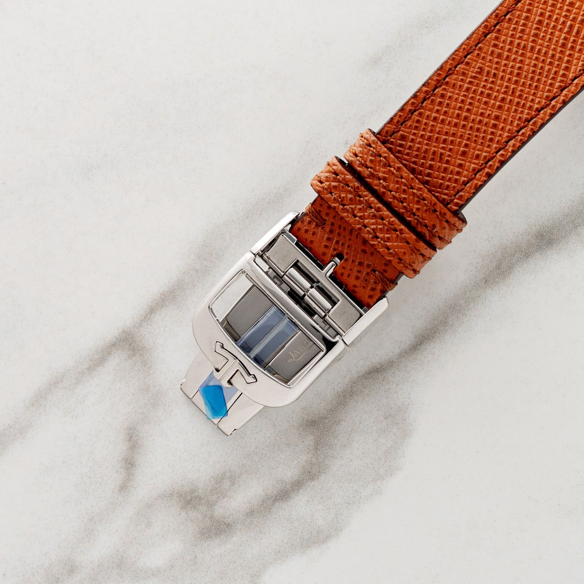 Bracelet: Original two piece grained leather strap in brown with JLC deployant buckle. Crystal: Clear.