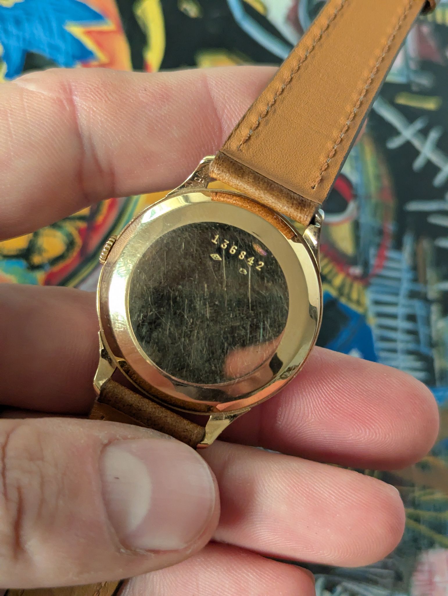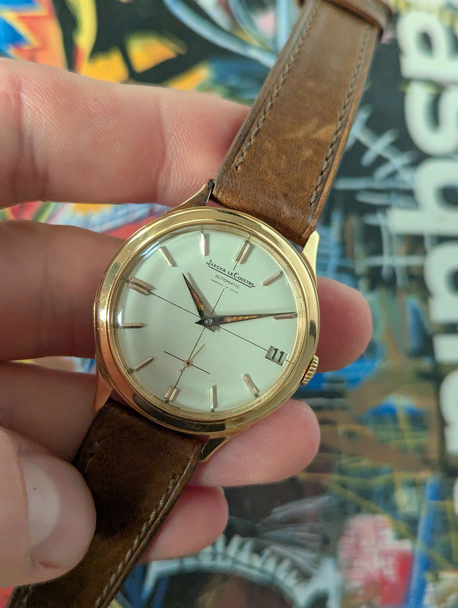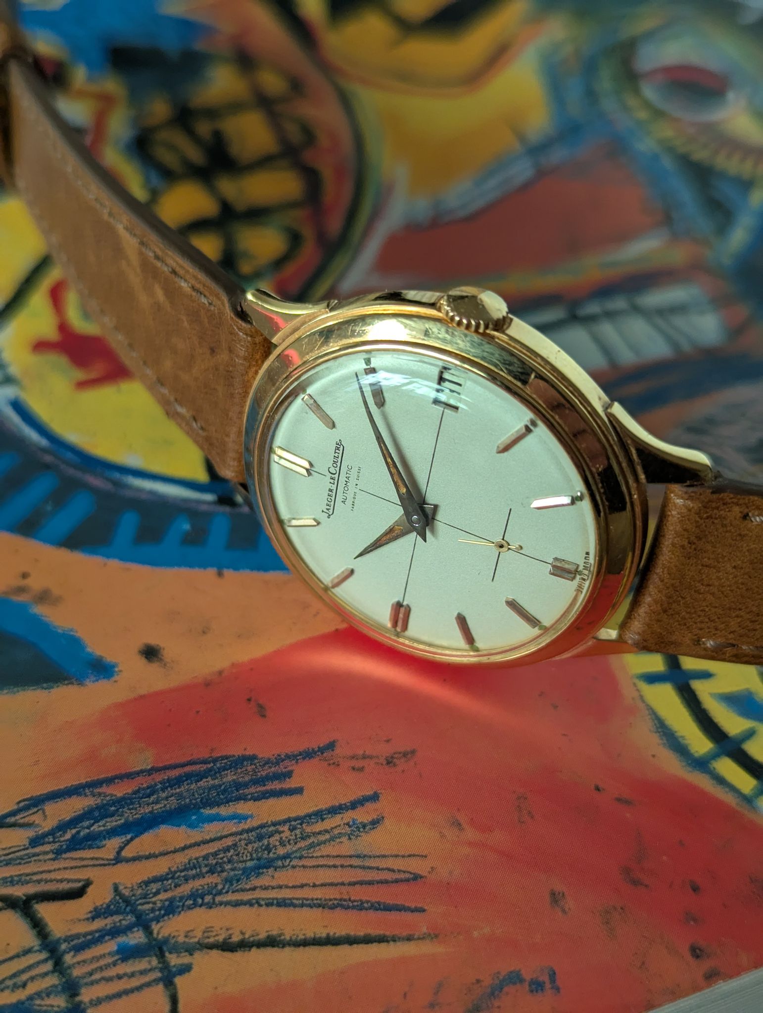 This model was released in 1957 under the reference E329. It is known for its round shape, clean dial and overall, its black and white roulette date disc. The dial is clean and minimalist, with subtle hour markers and finely detailed hands, giving it a timeless, refined look. The case is in 18 karat rose gold, for an additional touch of warmth.