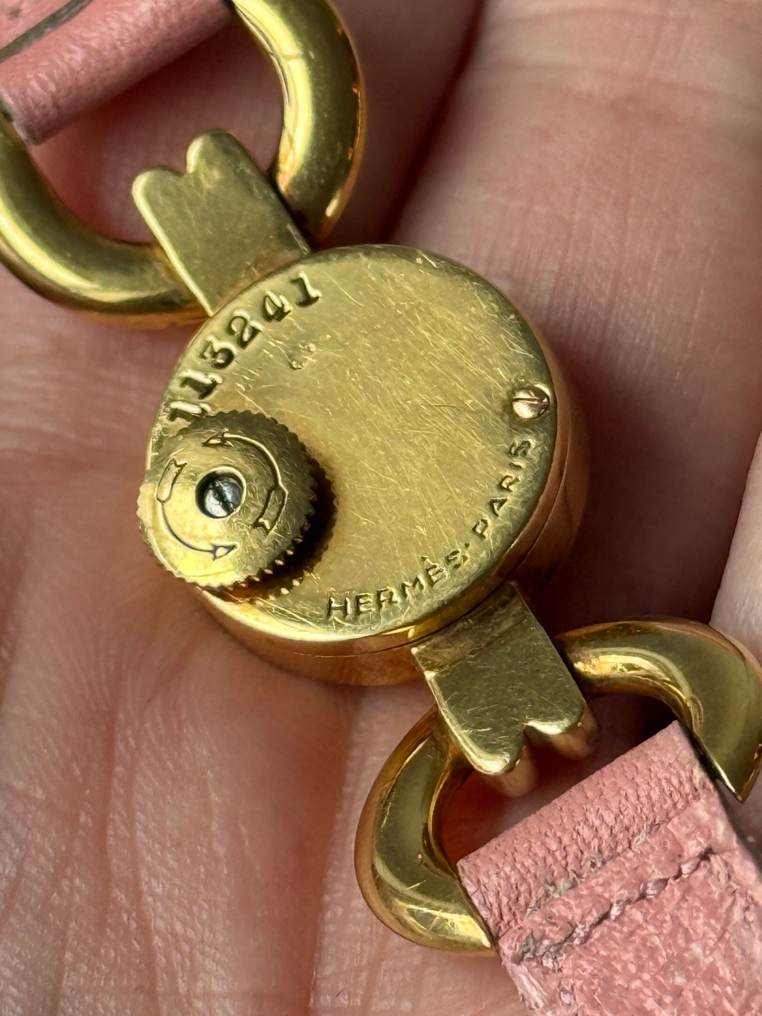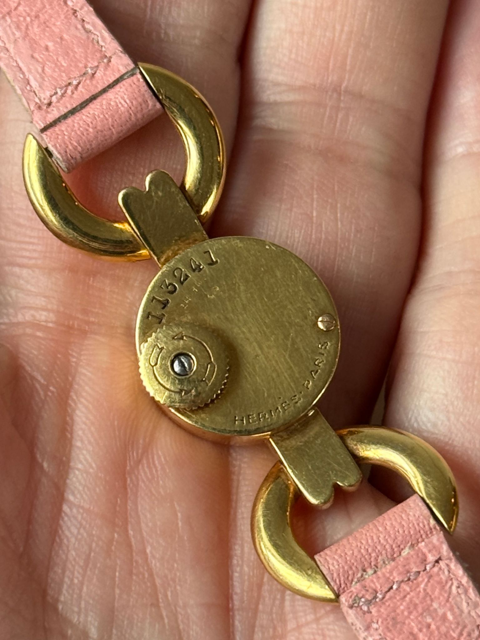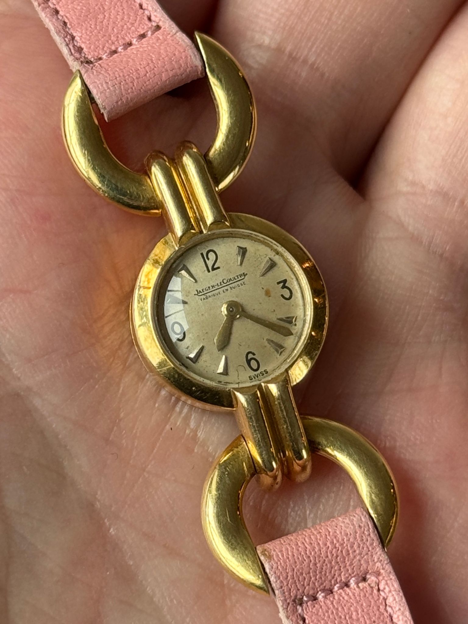 1940s Jaeger LeCoultre for Hermes cocktail watch. Backwind movement, reference 976. 18k made in France dial and case. After market strap which can easily be swapped for the strap of your choice. See vintage JLC catalog photo.