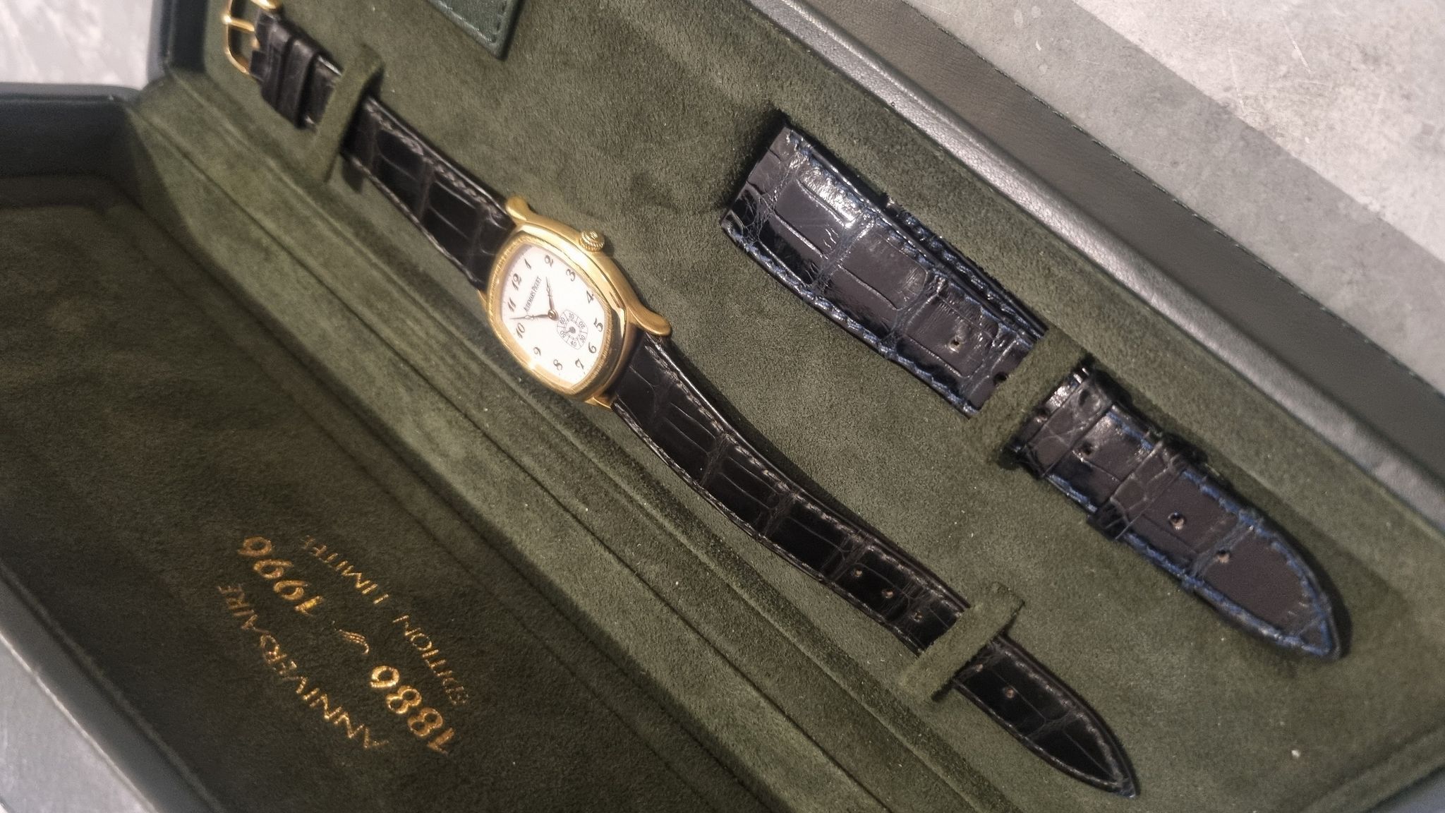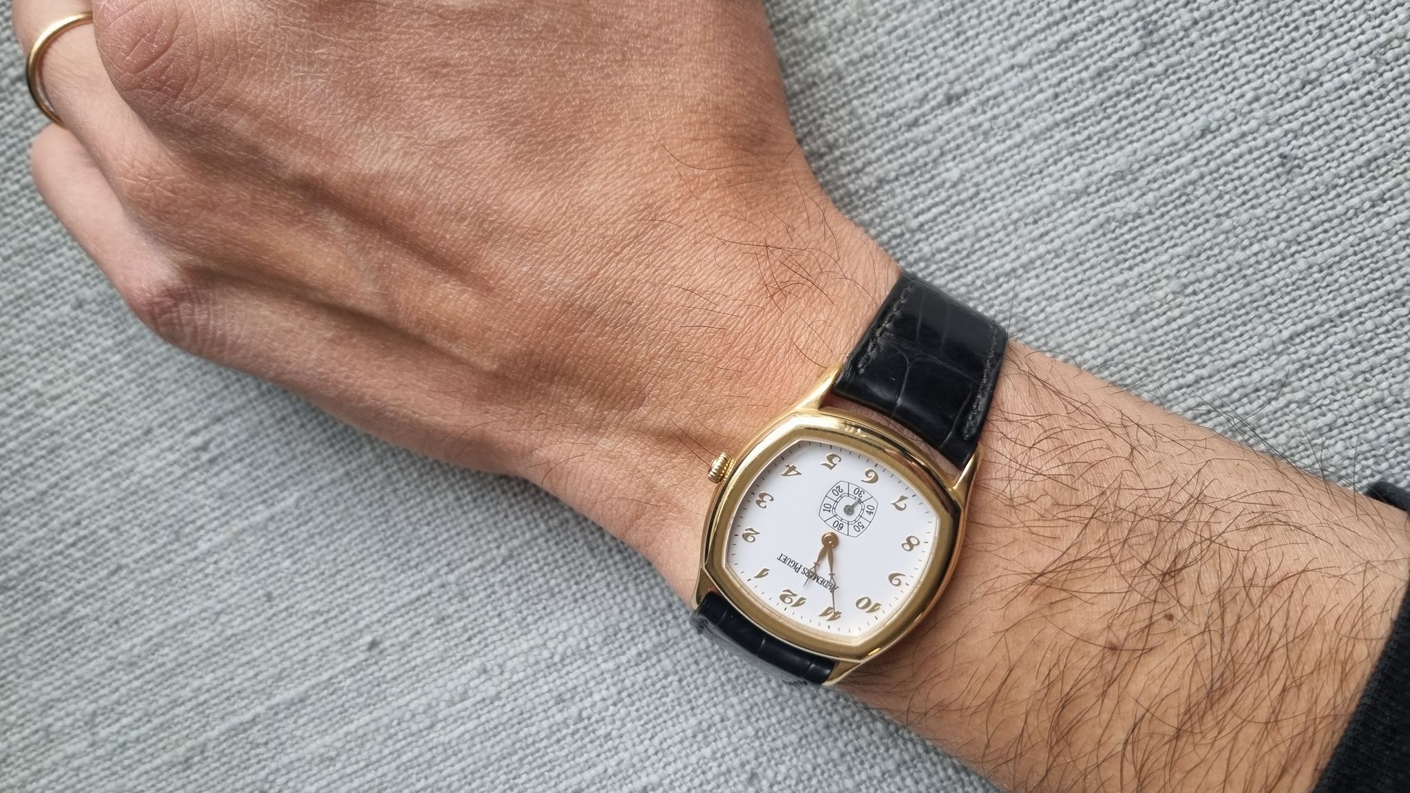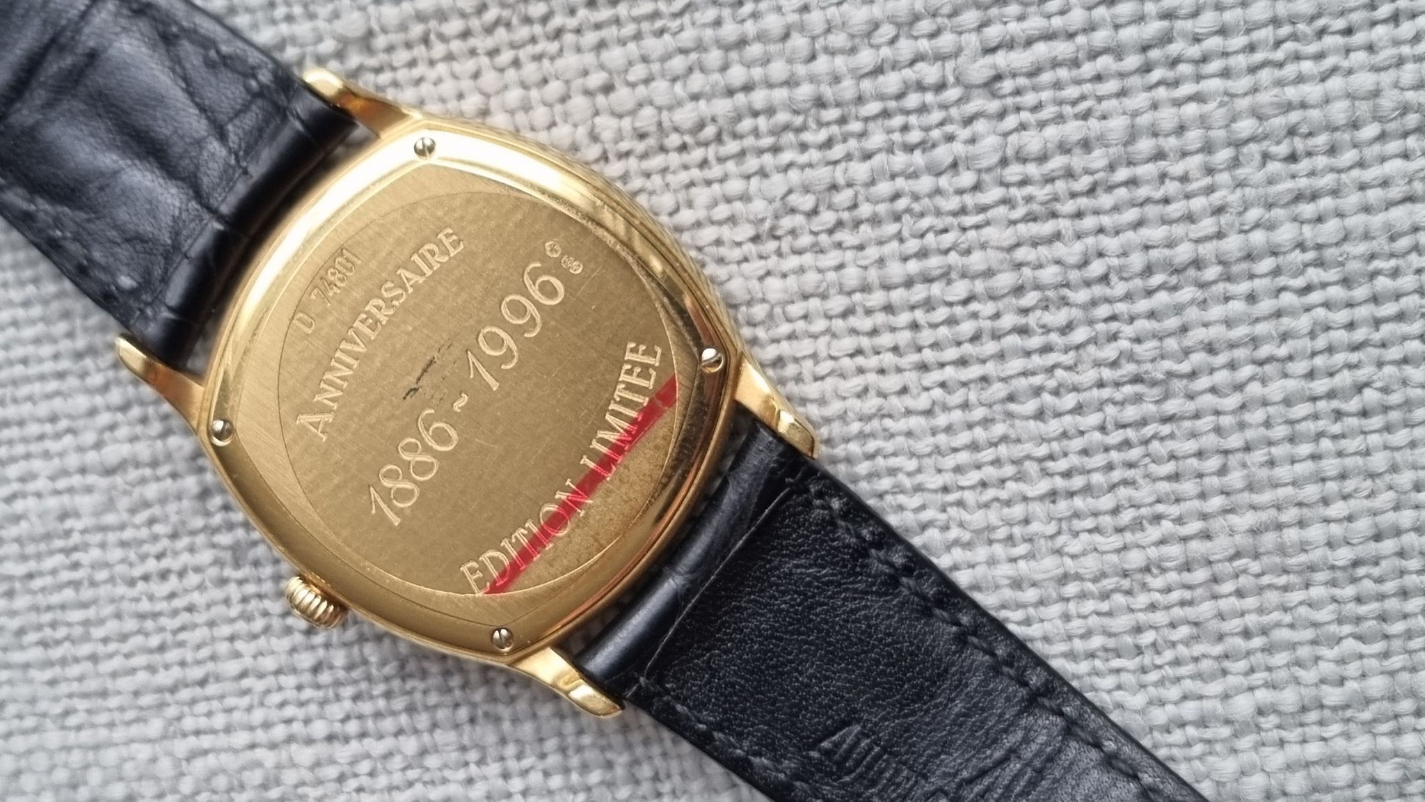 Cushion case John Schaeffer. Nicest variation with the thinner case (manual wind mvmt) and applied breguet numerals). Limited edition model to commemorate the 110th anniversary of John Schaeffer.