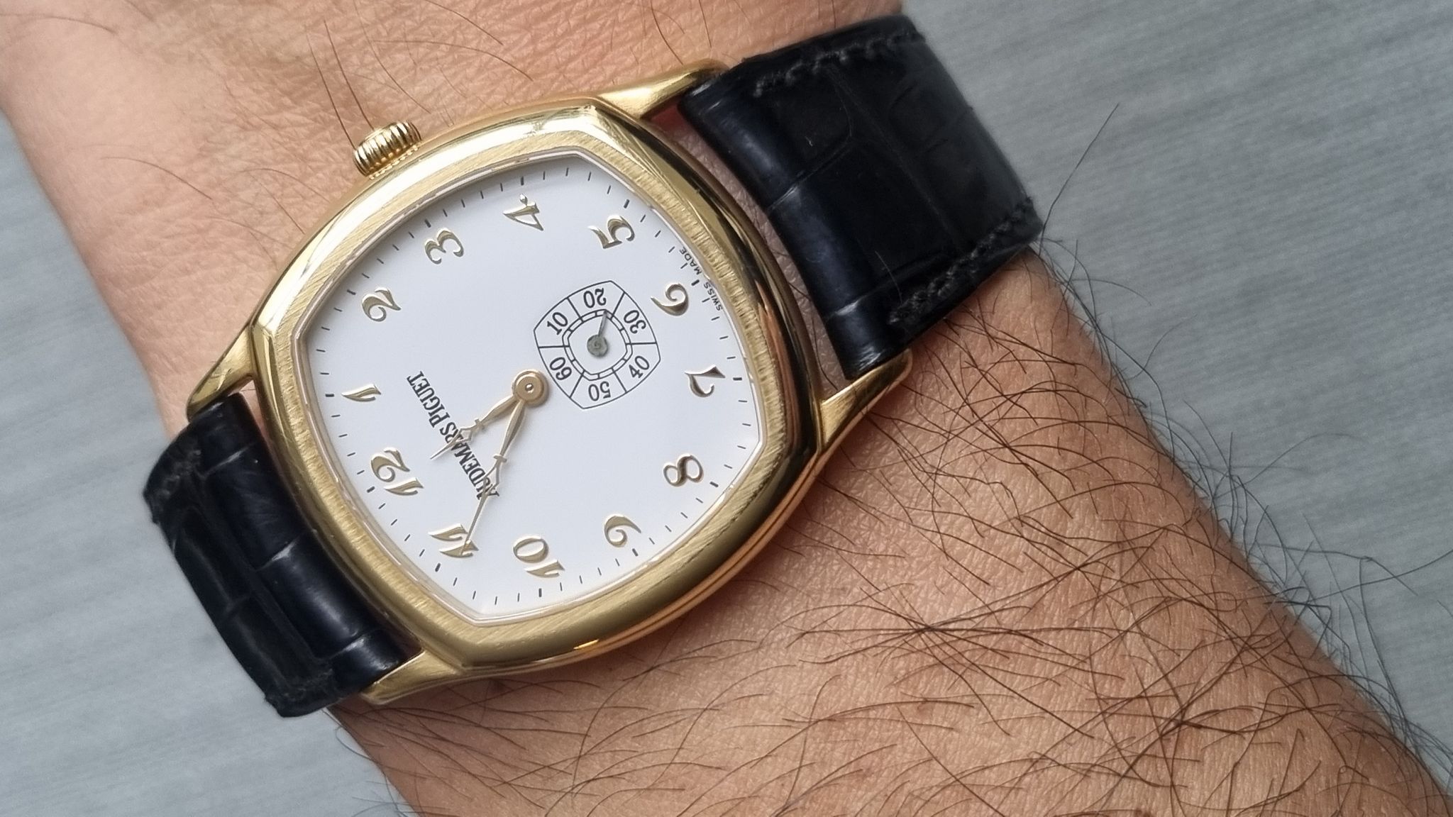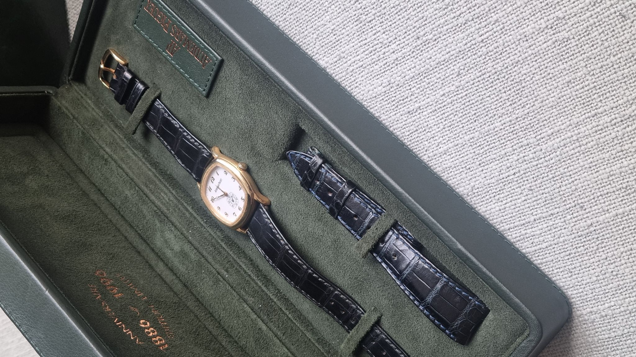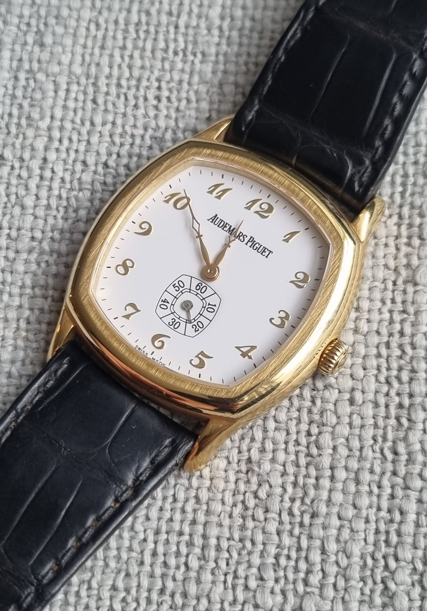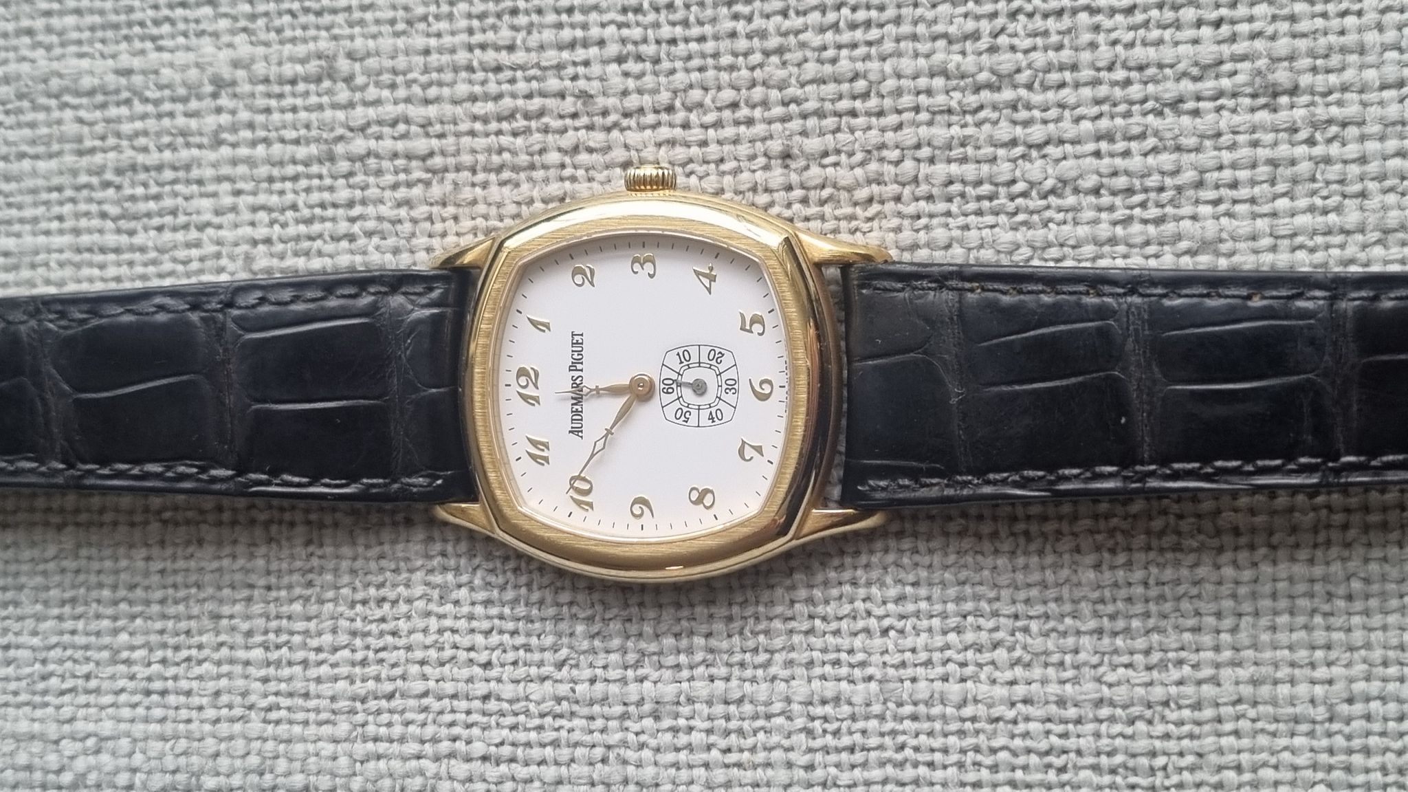 Cushion case John Schaeffer. Nicest variation with the thinner case (manual wind mvmt) and applied breguet numerals). Limited edition model to commemorate the 110th anniversary of John Schaeffer.