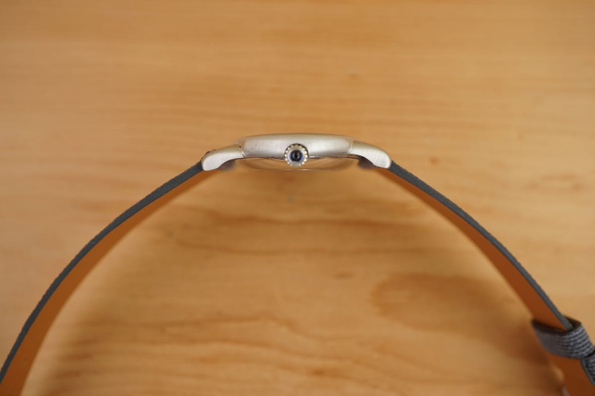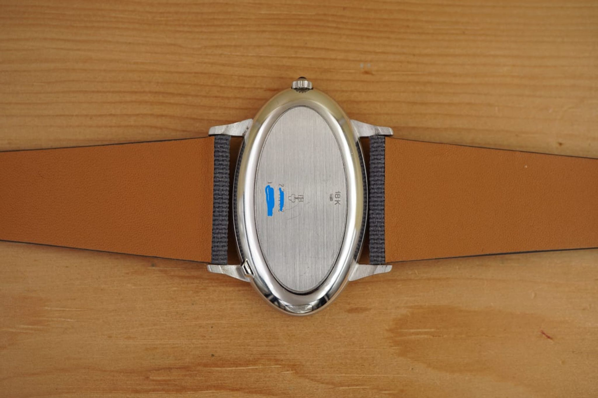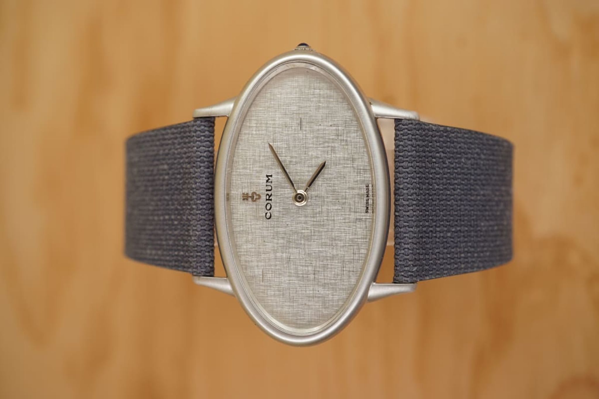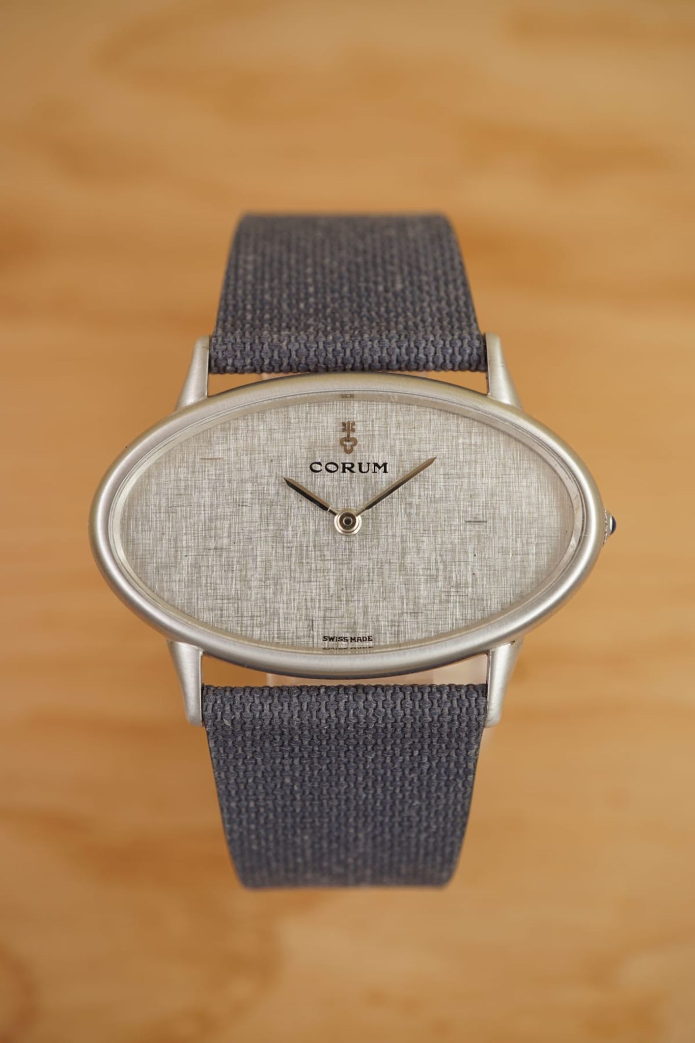 Wide 18K-whitegold Ellipse (39mm without crown) with an ETA-based manual Corum-movement below a grey linen-dial, accented by a blue sapphire-cabochon on the winding-crown.