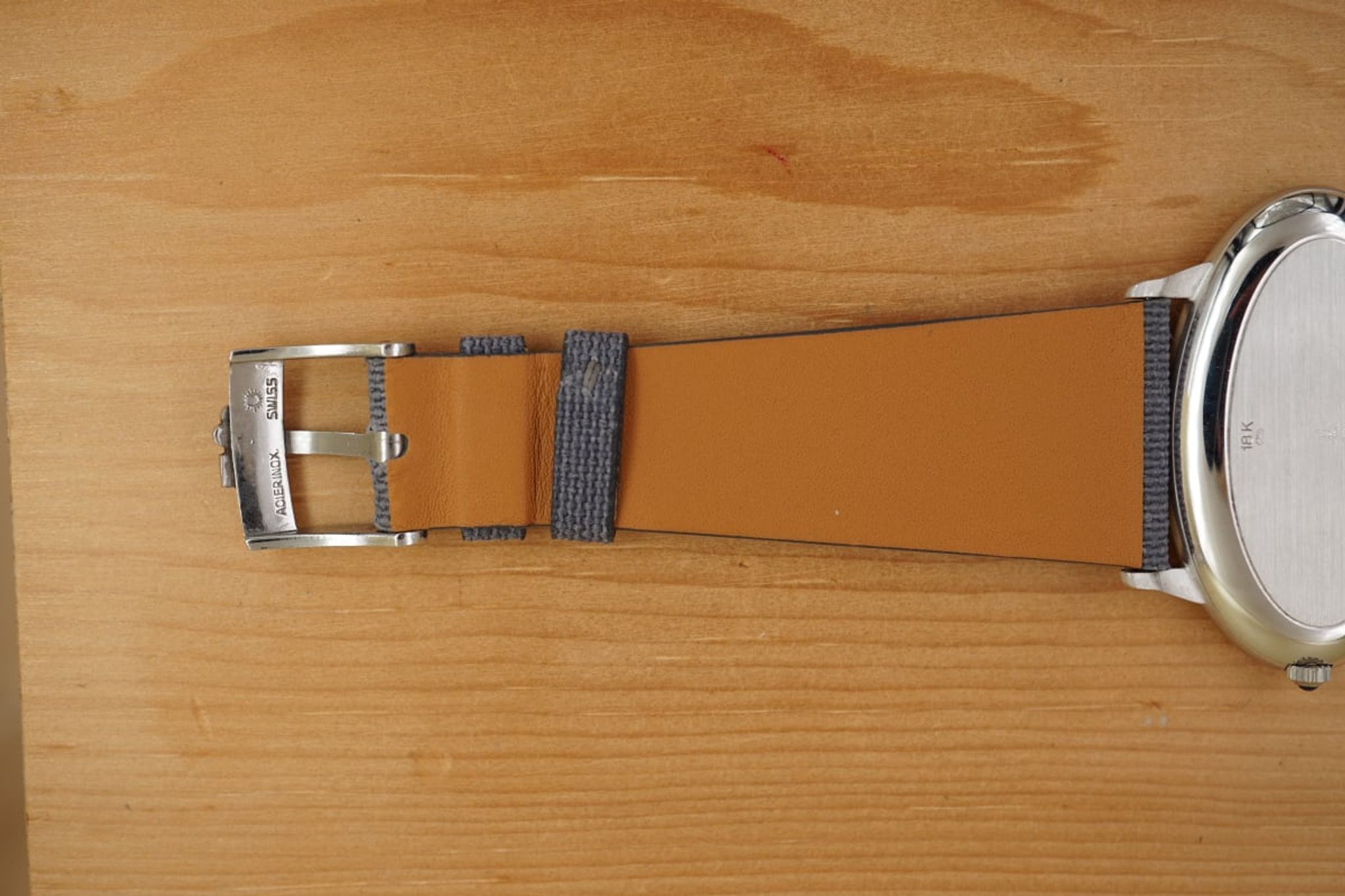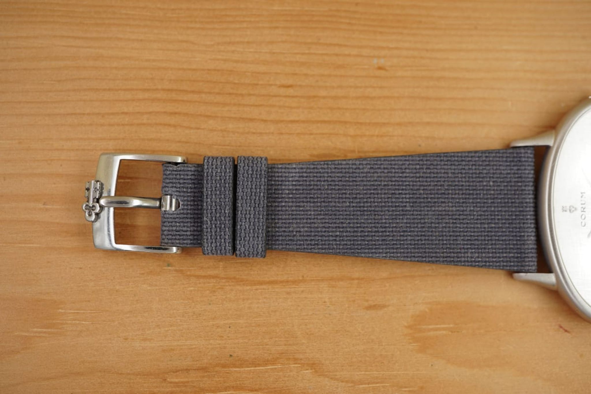 Presented with a grey custom-made high quality linen-strap that connects the solid case to the Corum-buckle -- monochrome.