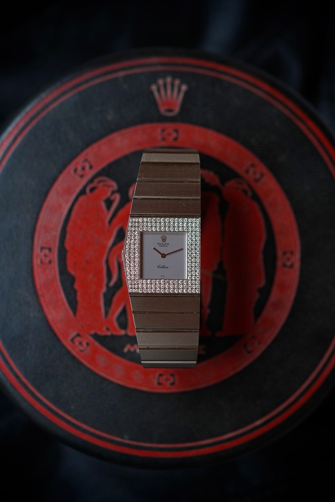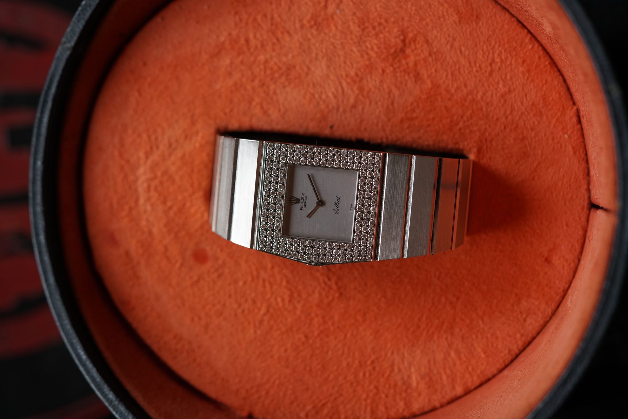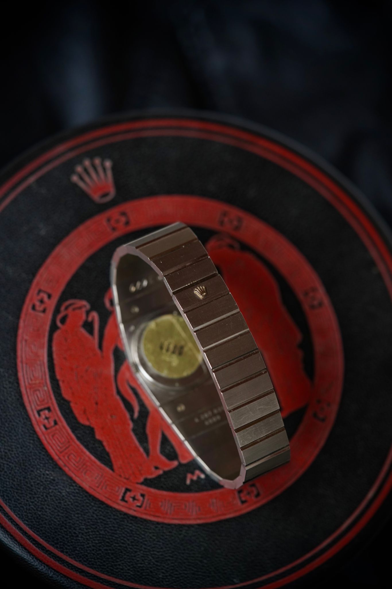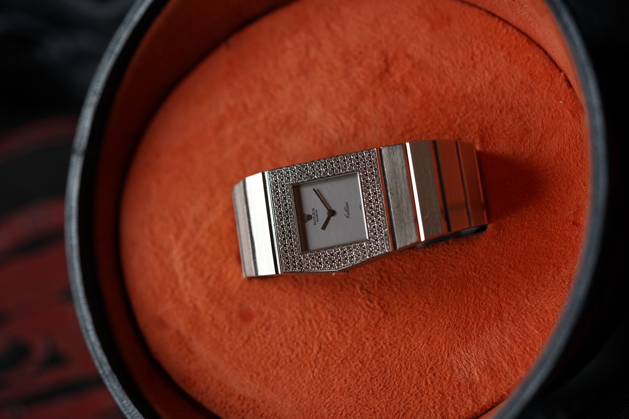 Possibly the most impressive and at the time costly Rolex ever made. A behemoth of a watch in solid 18k white gold featuring a fully pavée front case. A very rare ref. 4609, this absolutely unpolished example still retains the sticker on back and albeit a couple of storage marks, it is in virtually unused conditions. The matte grey dial further enhances this monometallic look which we absolutely are in love with.