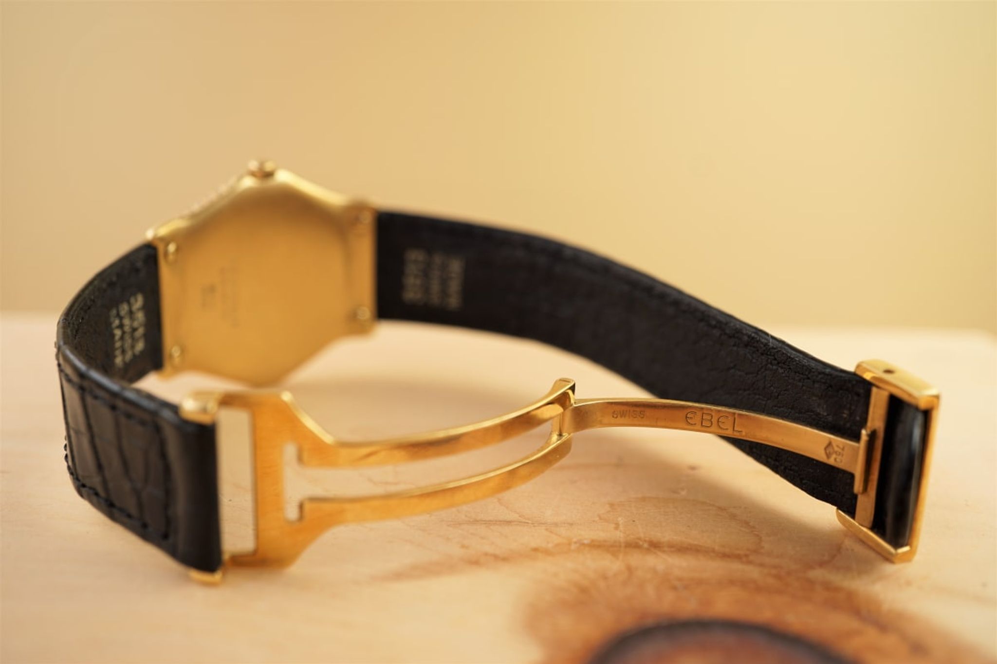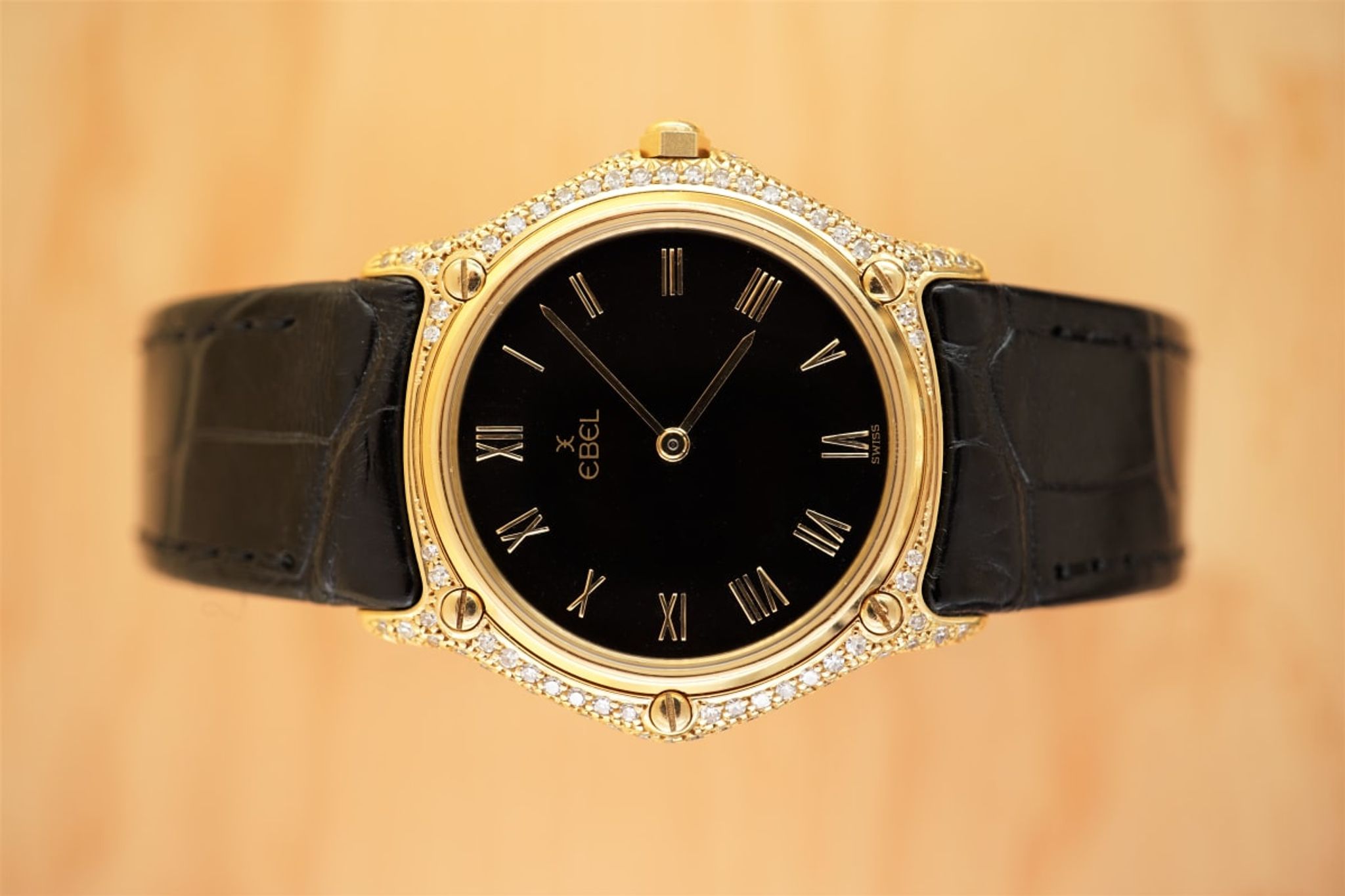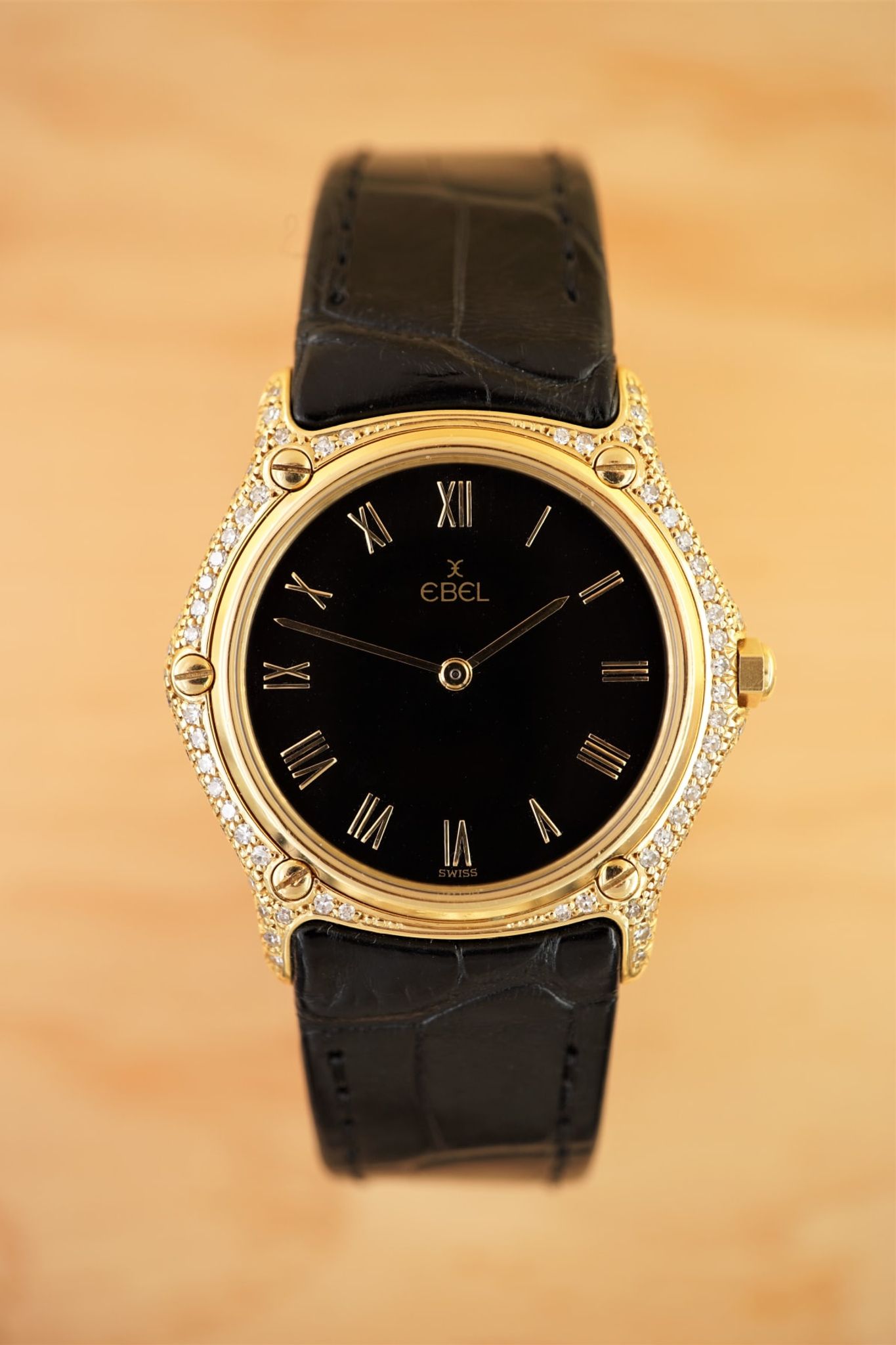 Beautiful preserved Ebel Classic 1911 with original black Ebel leather strap and original 18K solid gold Ebel folding-clasp, black dial with raised roman numerals and diamonds, factory-set on the iconic case.