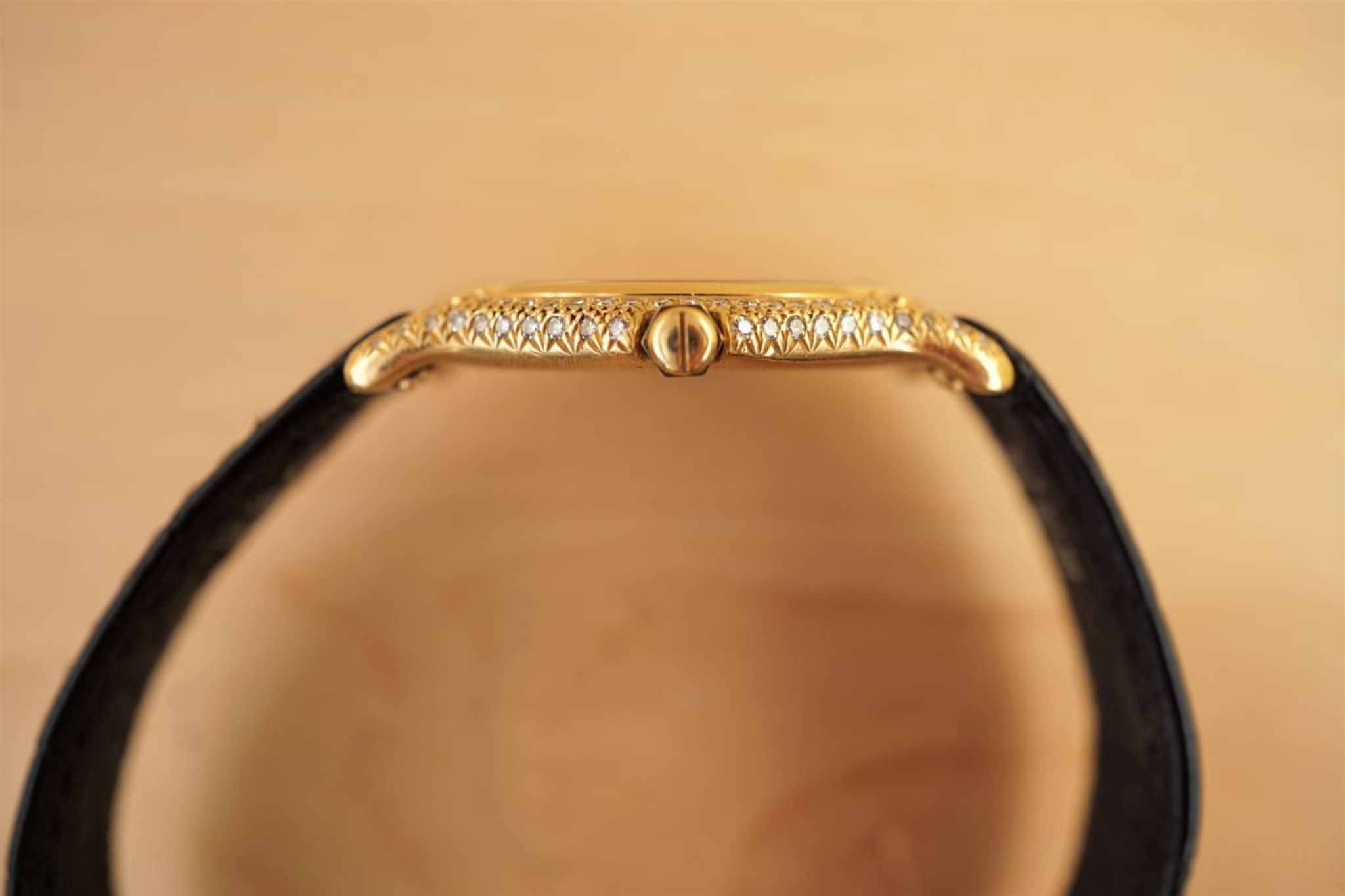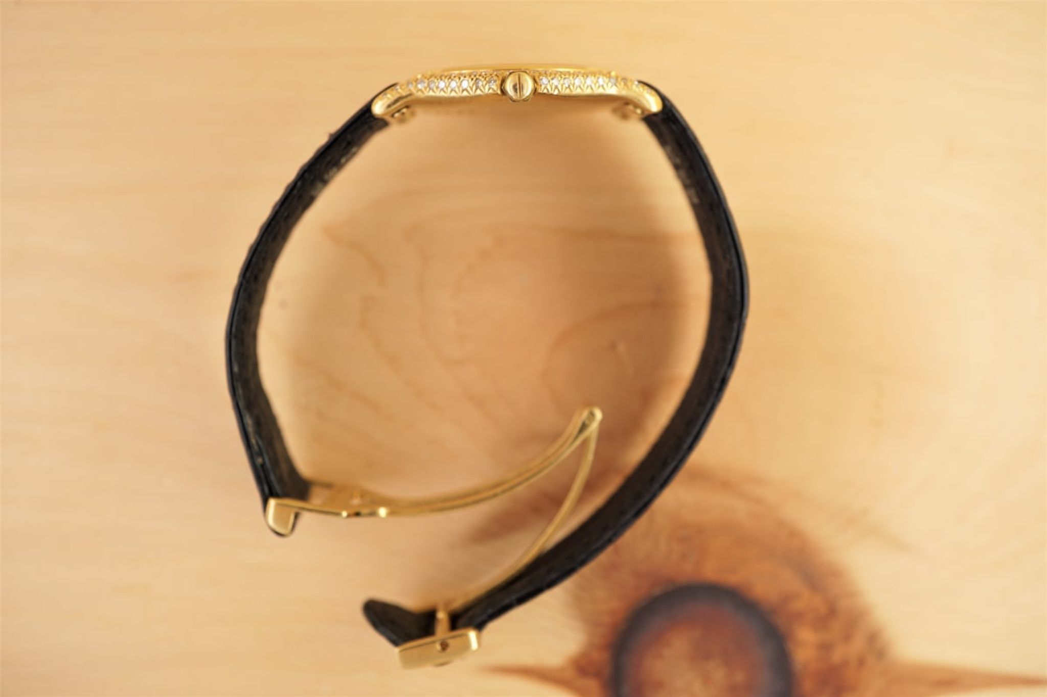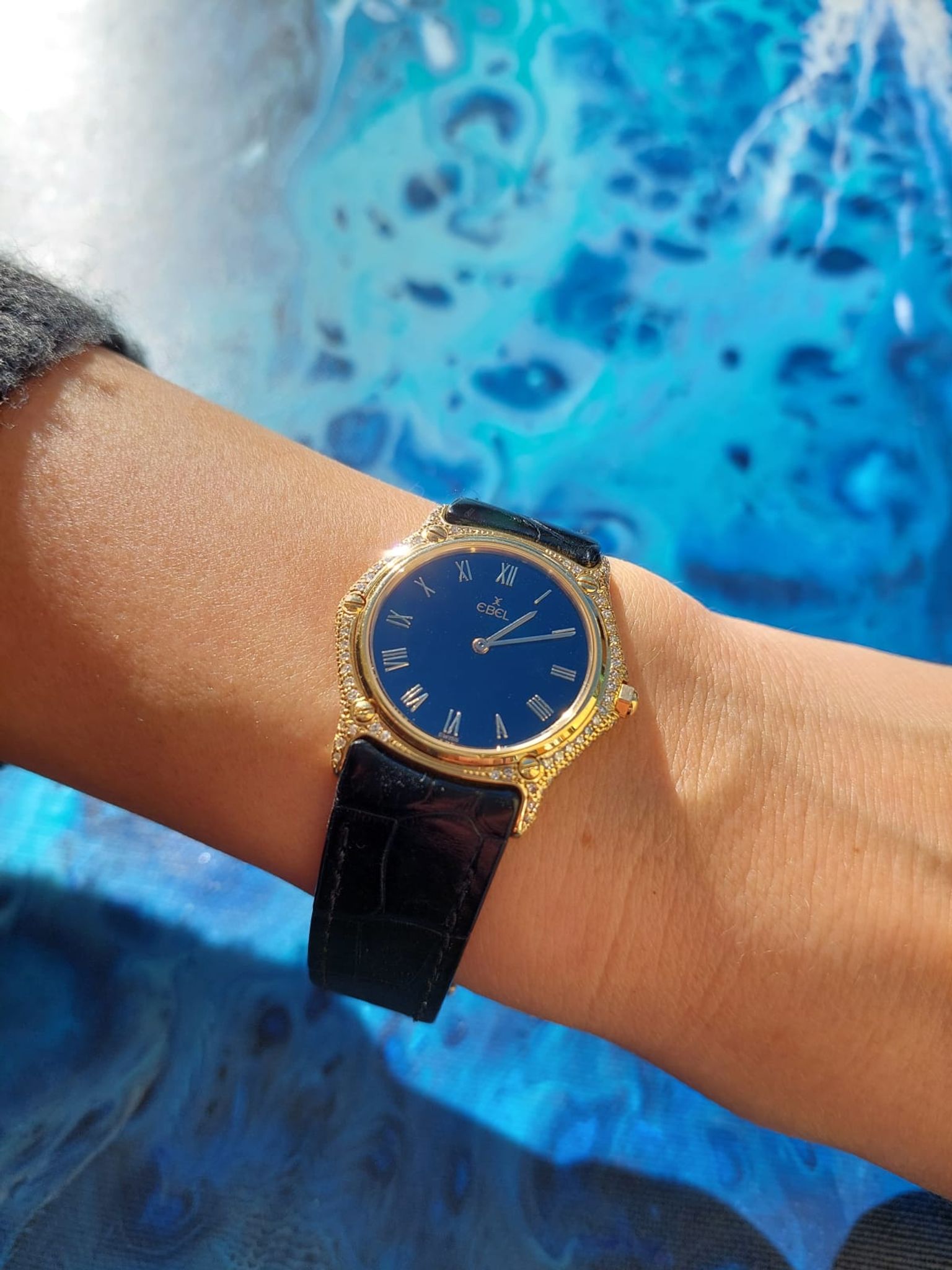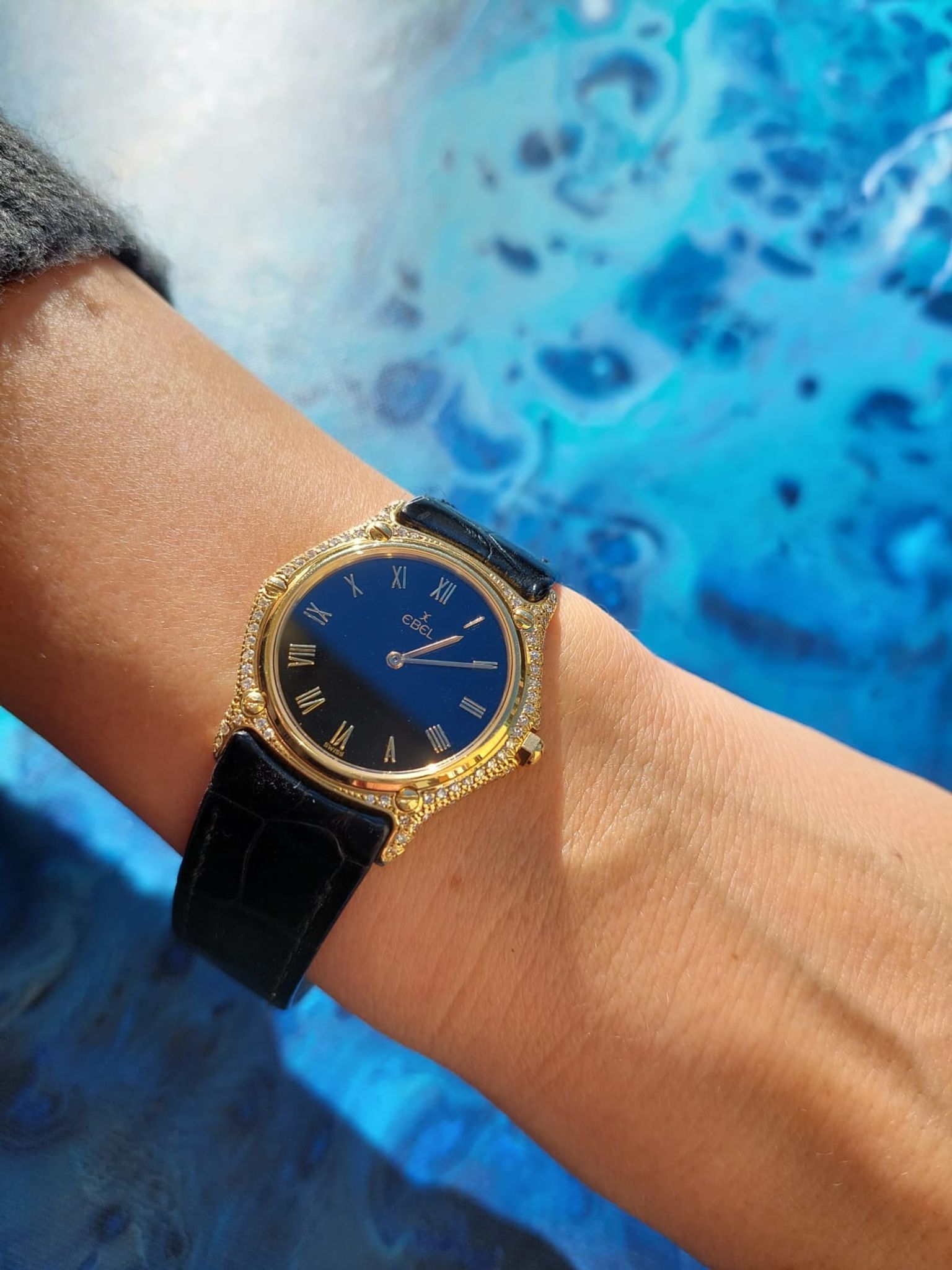 Beautiful preserved Ebel Classic 1911 with original black Ebel leather strap and original 18K solid gold Ebel folding-clasp, black dial with raised roman numerals and diamonds, factory-set on the iconic case.