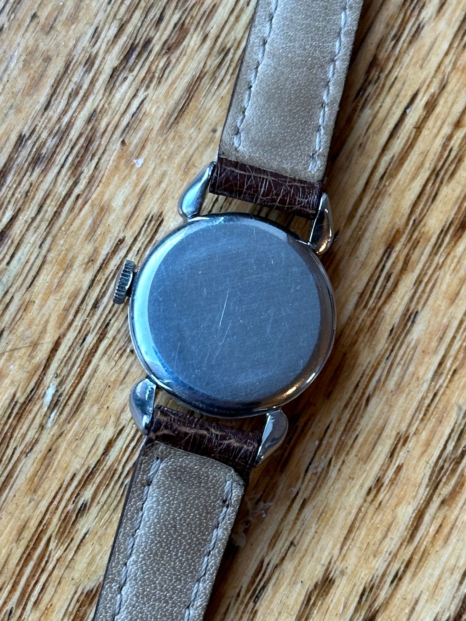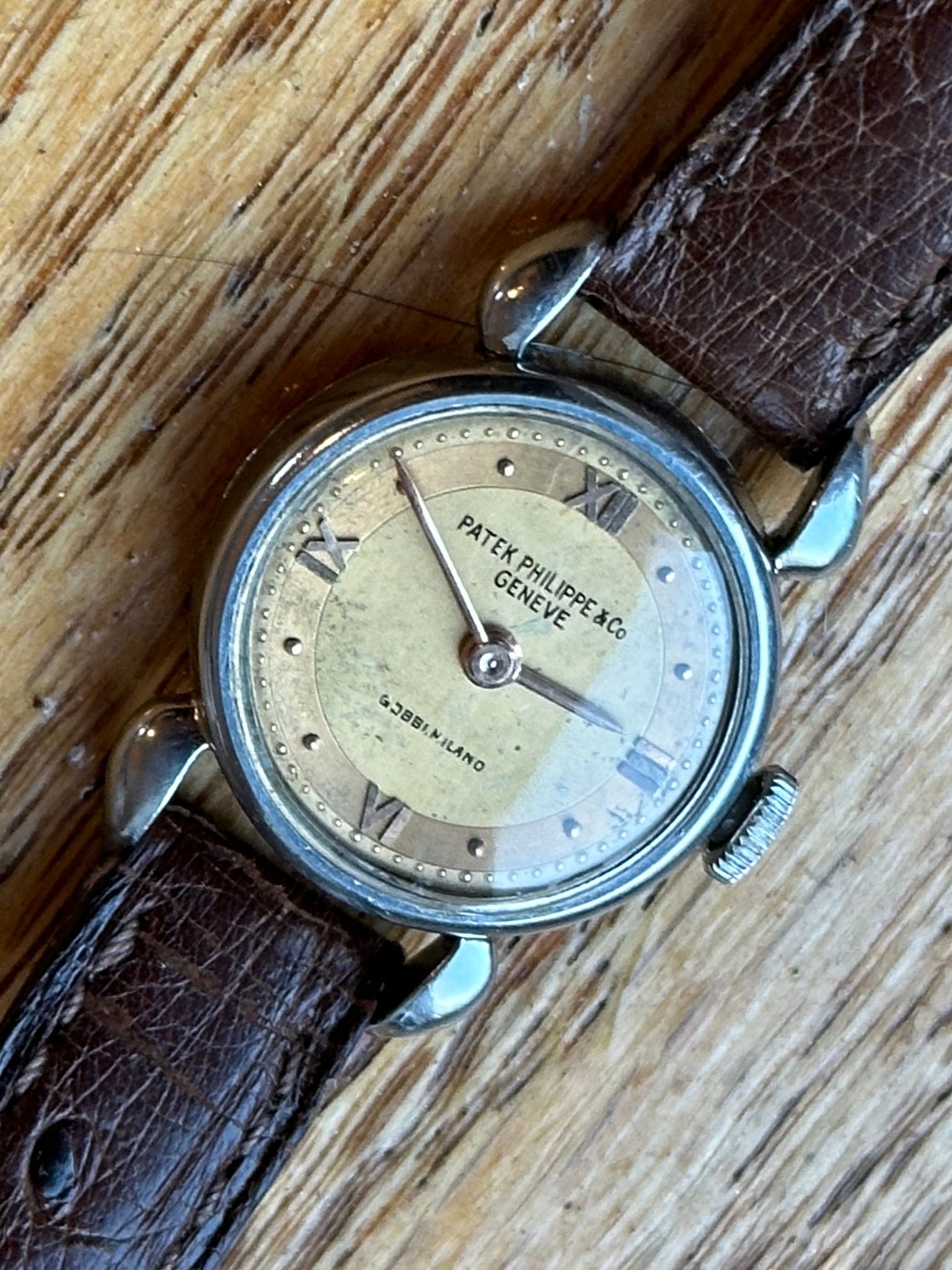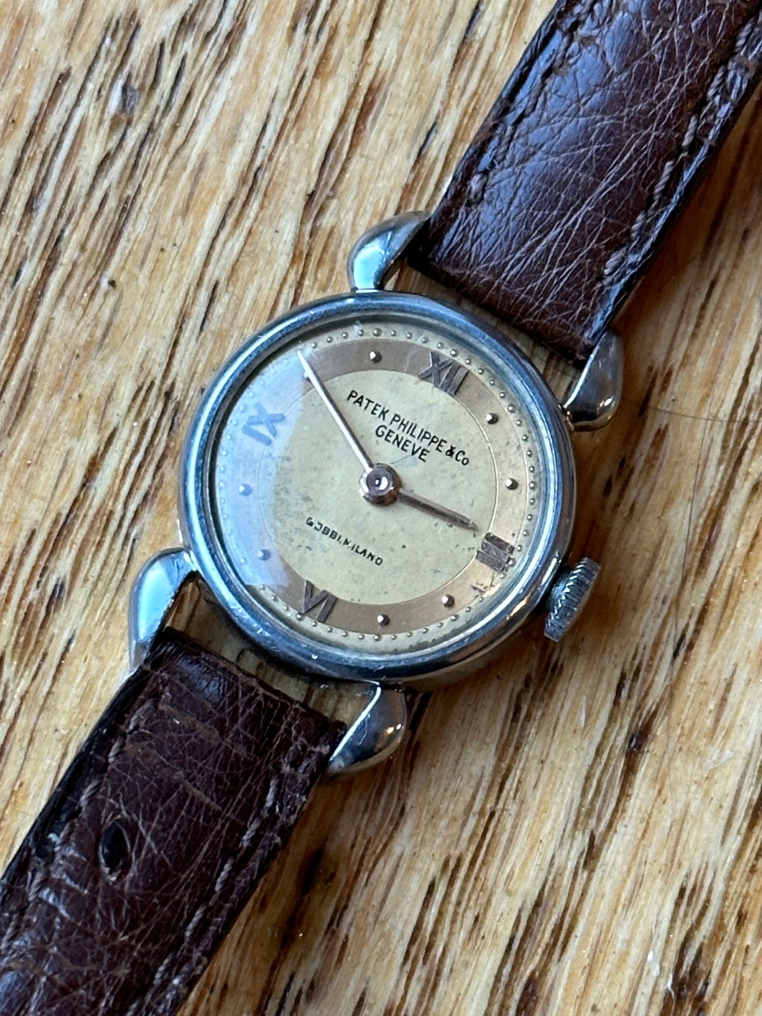 Rare steel ladies 1940’s wristwatch with teardrop lugs, retailed and signed by Gobbi Milano. Heavy honest patina on the dial.