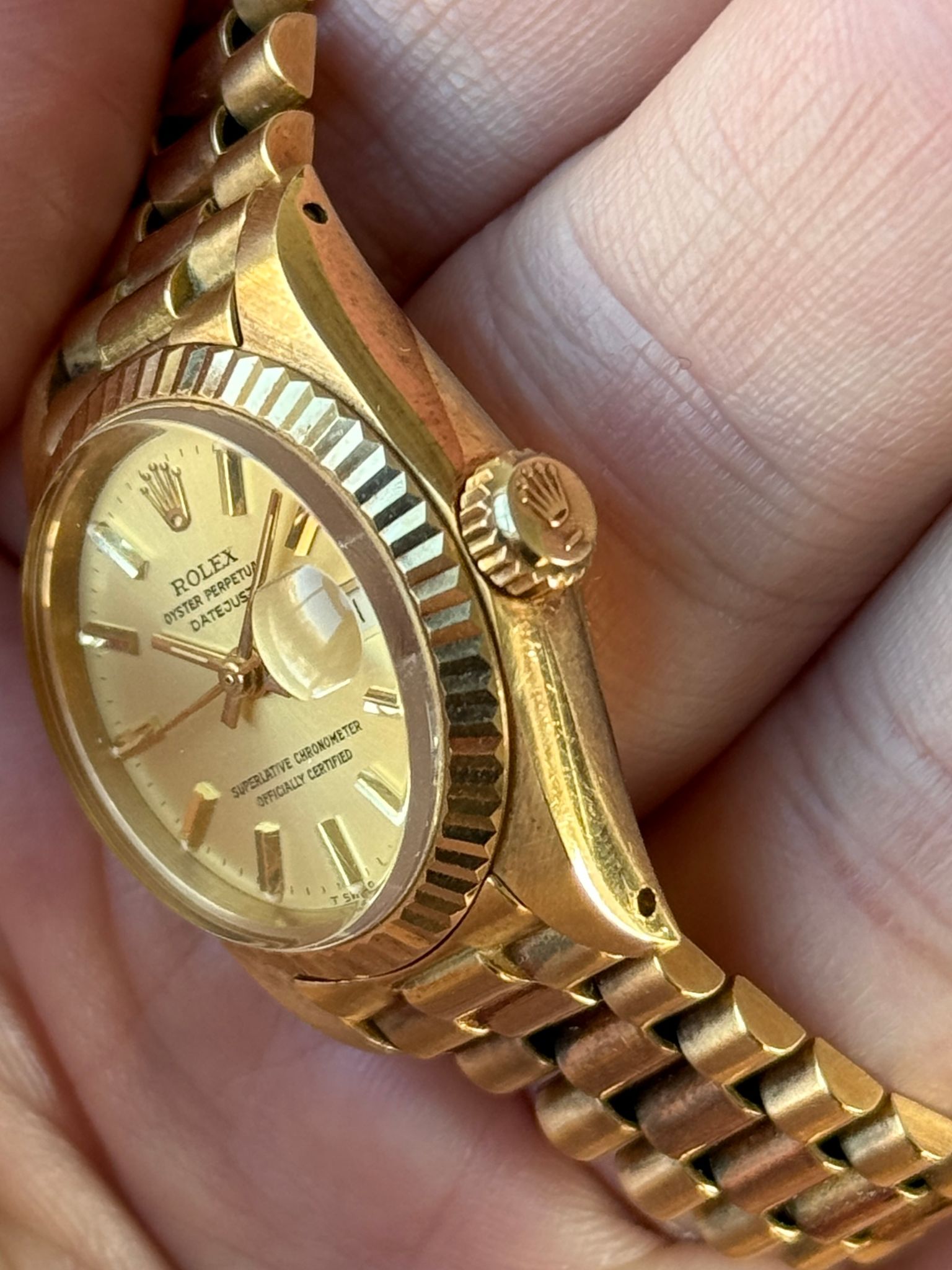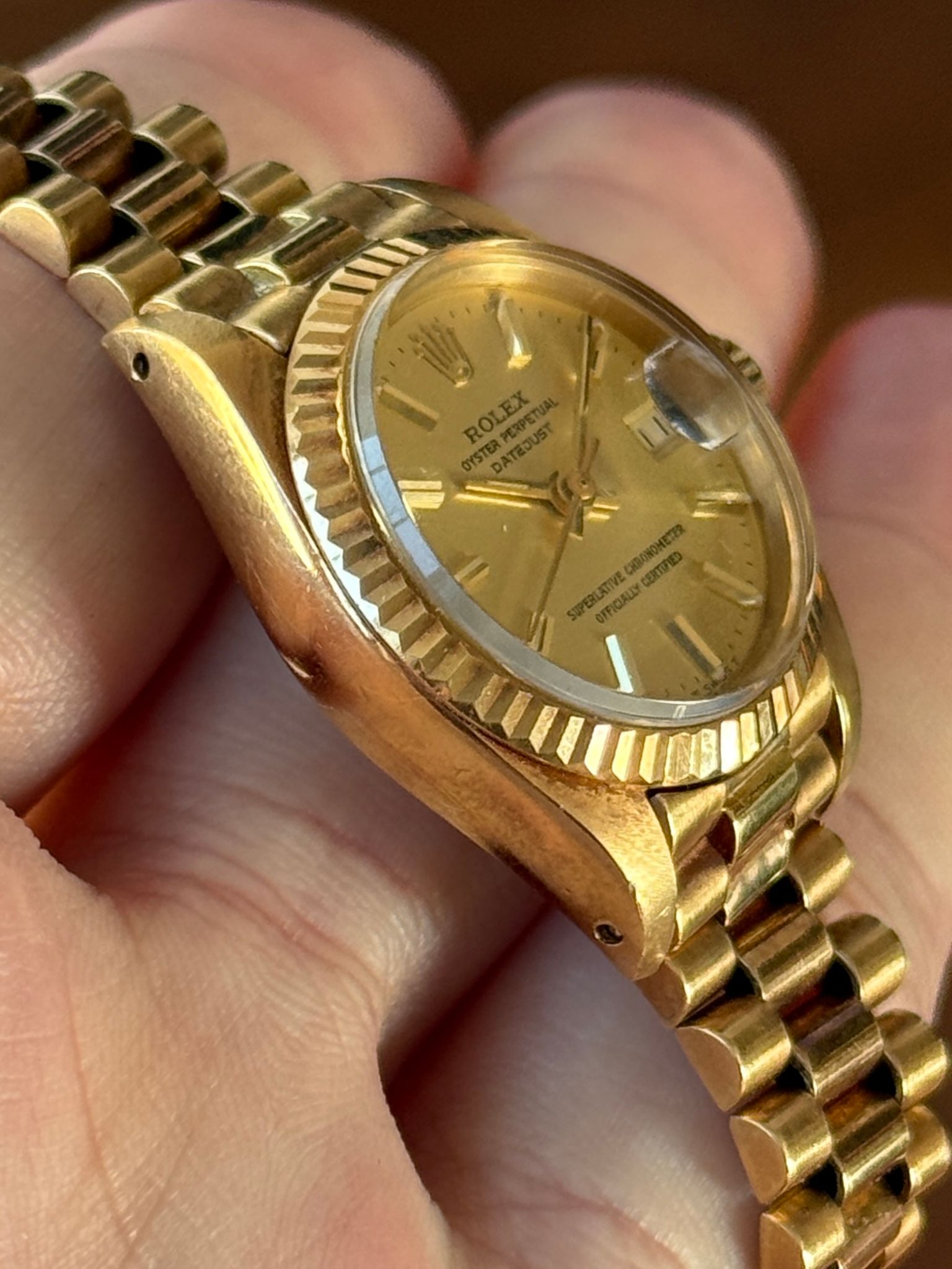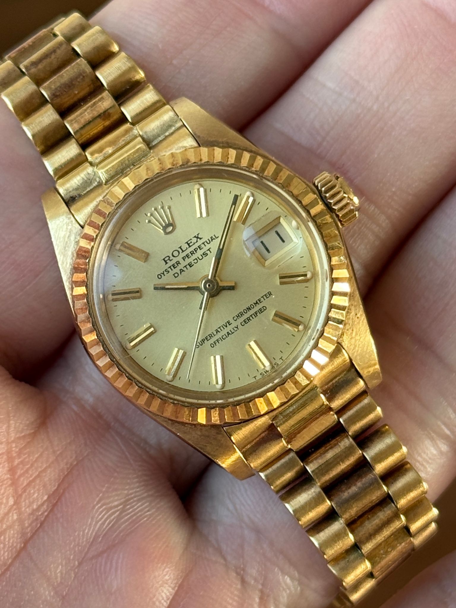 Stunning and probably unpolished 1980s Ladies Datejust reference 6917 on 18k Rolex “Made in Japan” president bracelet