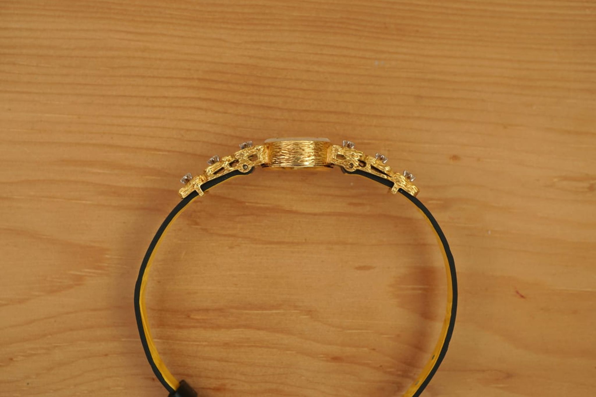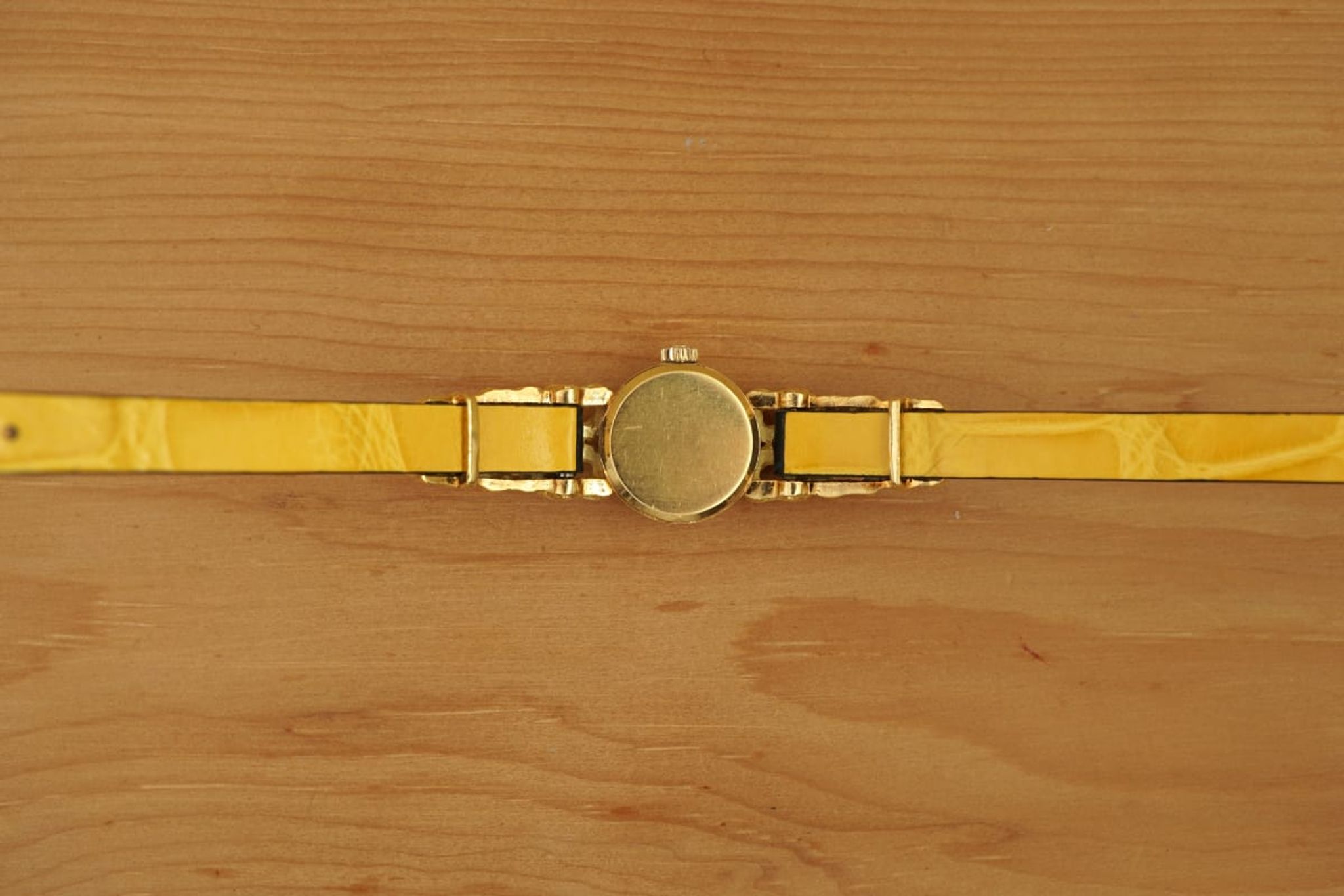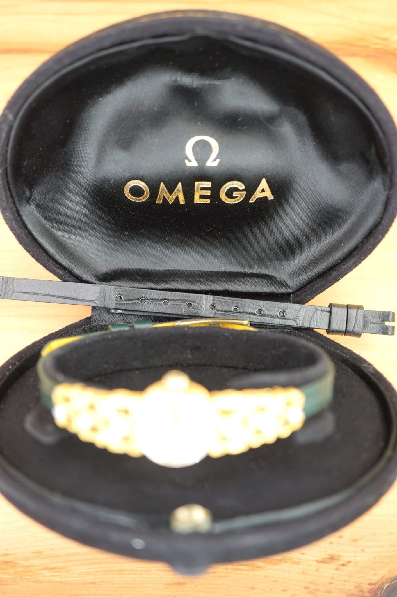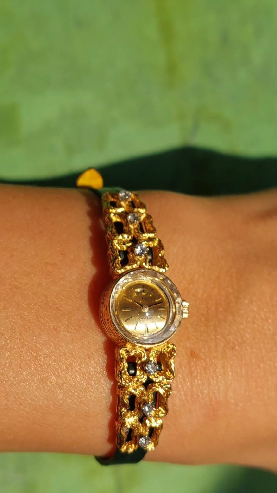 Beautiful, rare and versatile Omega: Highest quality with a miniature manual movement cal650, highest quality-diamonds, Stern Freres-dial (Patek owner-family) and a handmade 18K solid gold-case designed by Gilbert Albert for Omega.