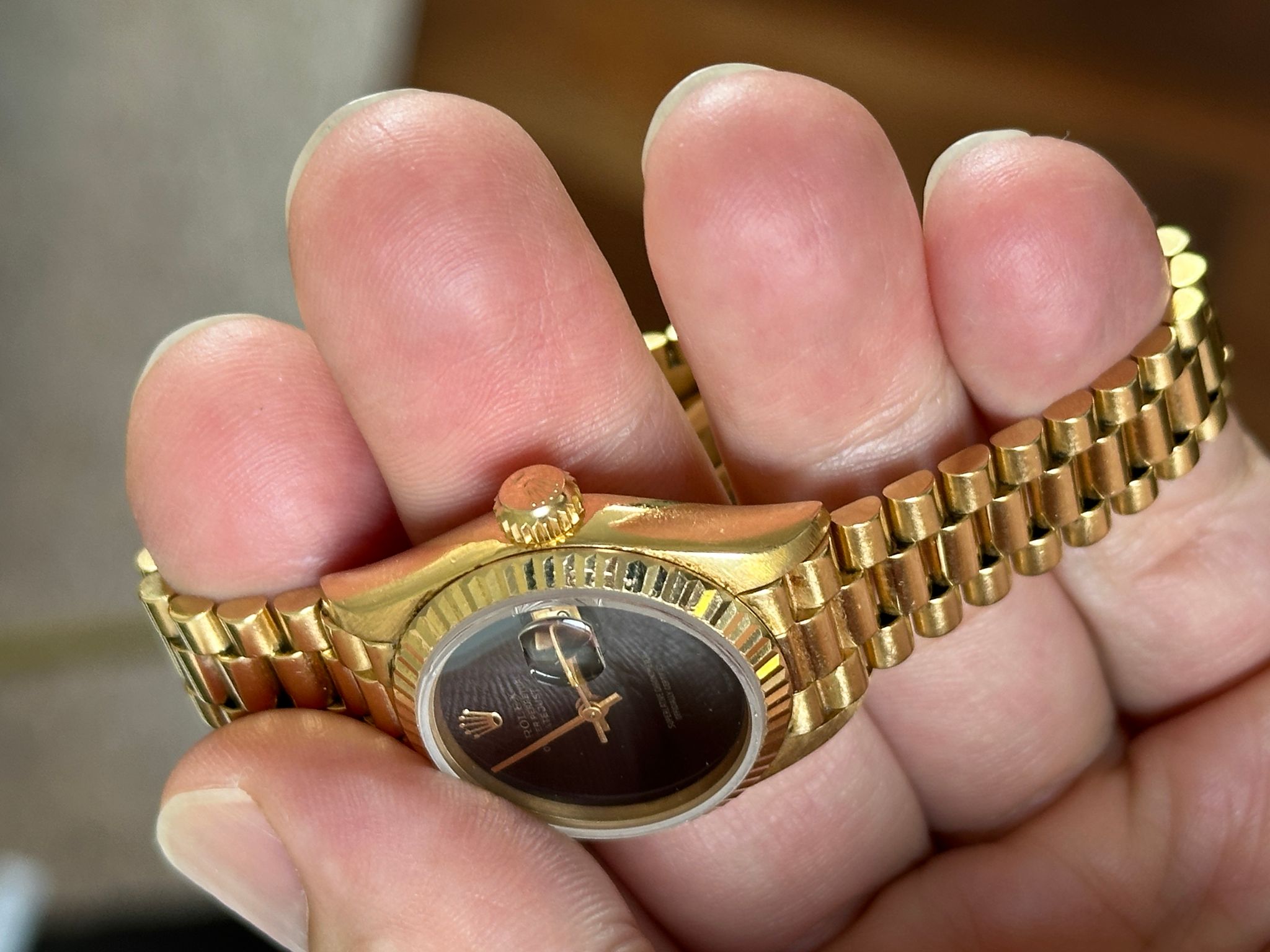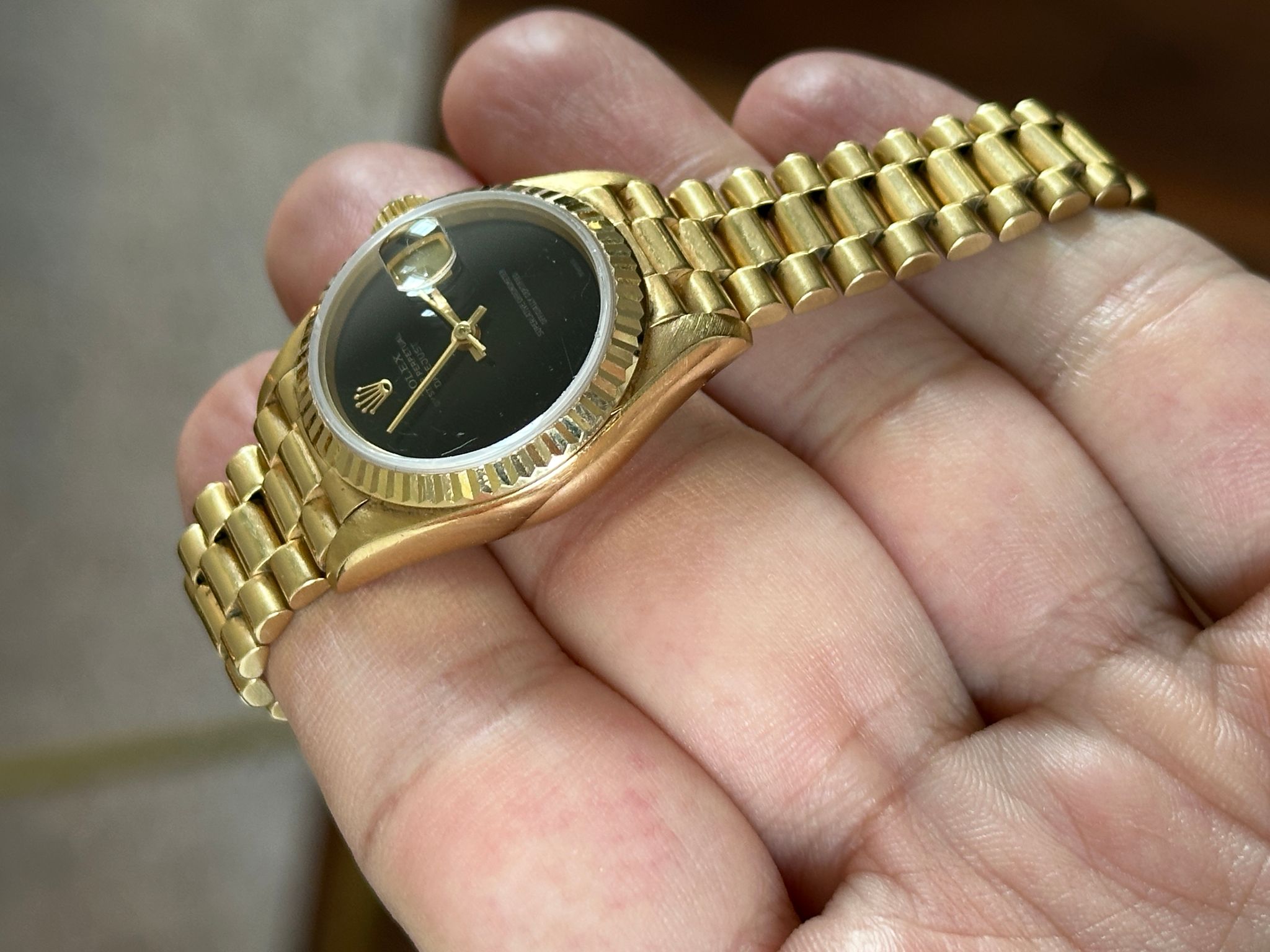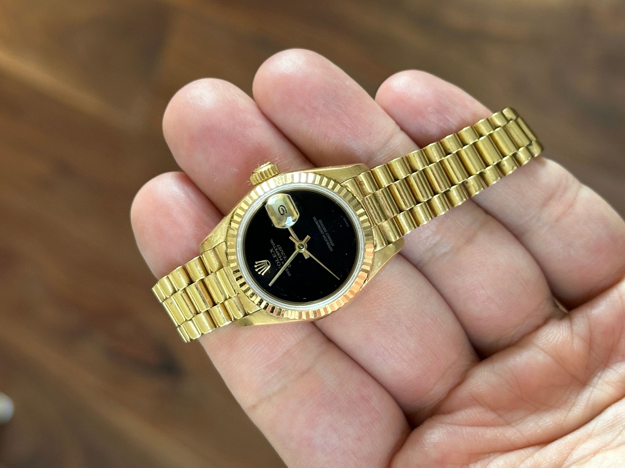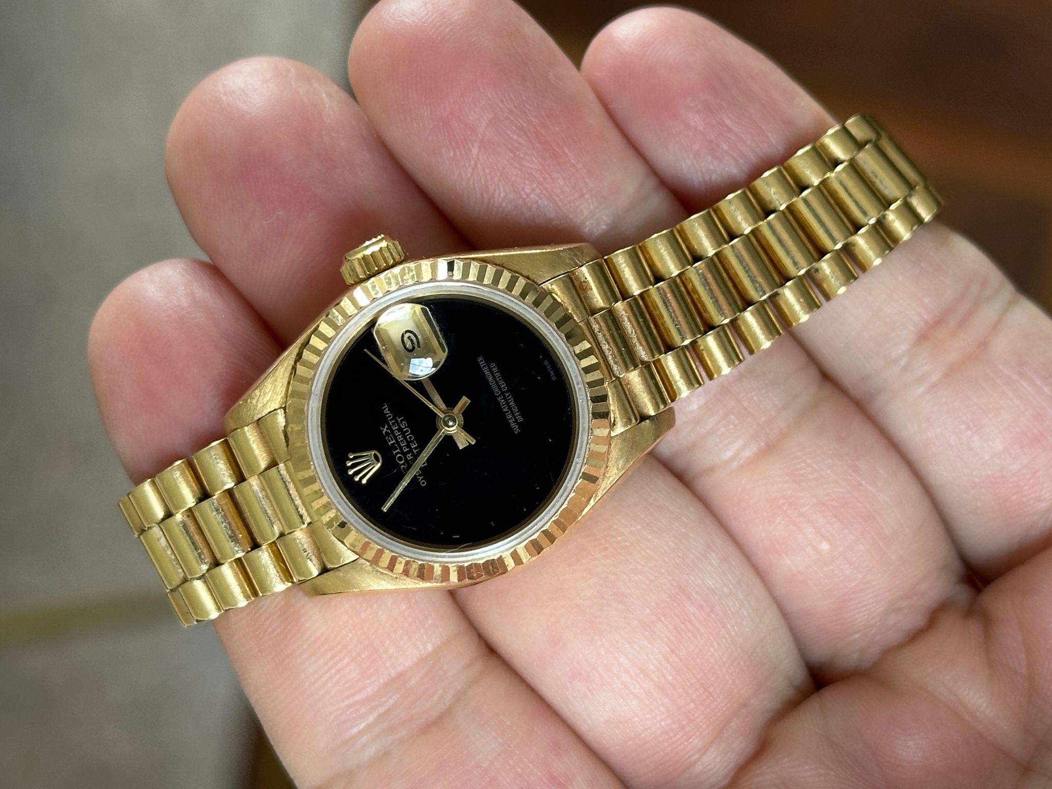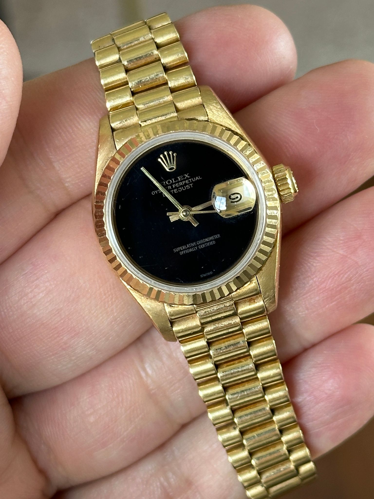 Gorgeous ladies Datejust reference 69179 with flawless factory Rolex onyx stone dial on presidential bracelet with light stretch. Any blemishes are on the crystal only.