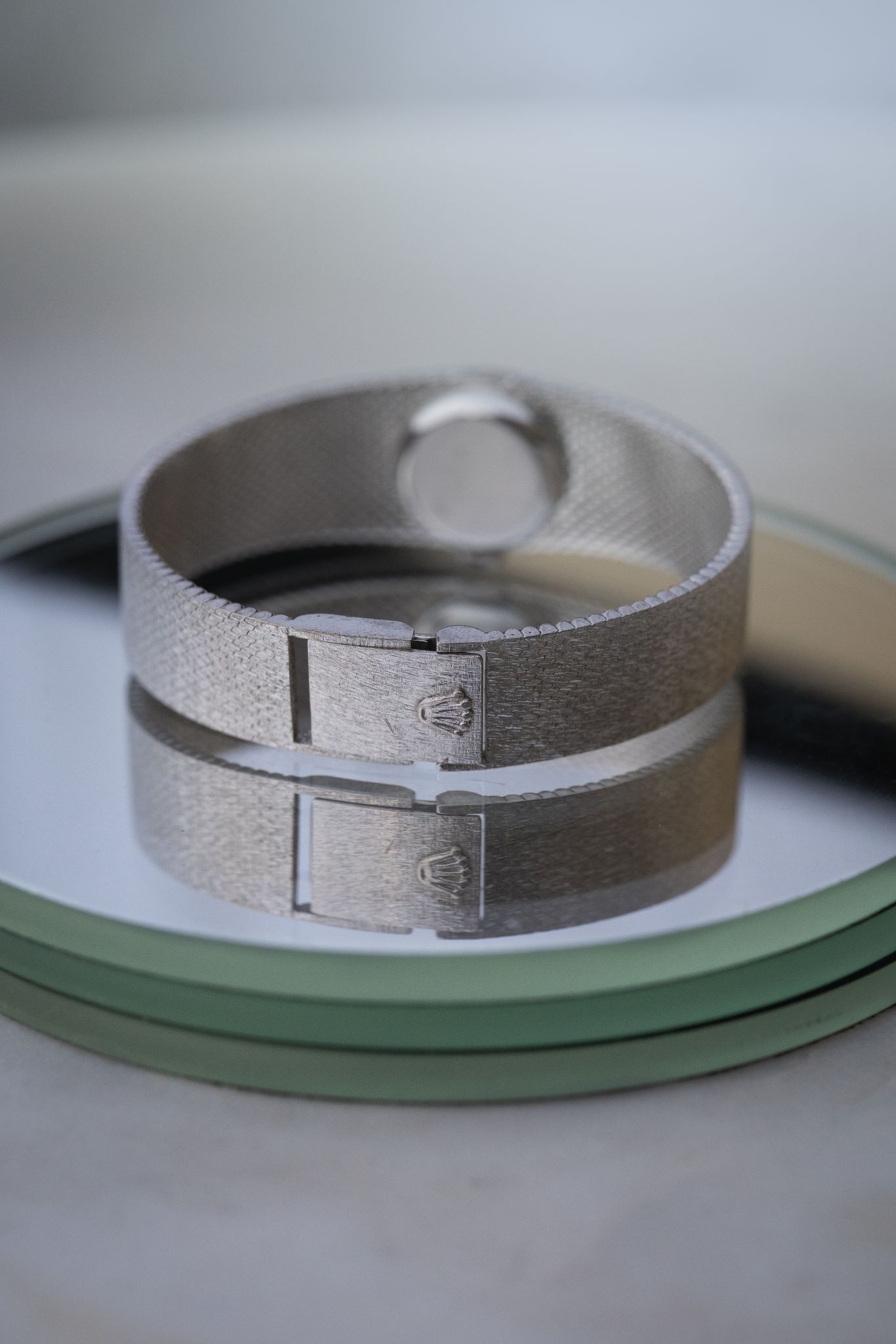 This slender Ladies Rolex, reference 2166, is a stunning blend of timeless elegance and vintage charm. Featuring a sleek silver dial and a dazzling diamond bezel, this watch exudes sophistication and luxury. Crafted from solid 18k white gold, the silky soft bracelet seamlessly integrates with the case, creating a fluid and harmonious design that is both unique and effortlessly chic. Weighing an impressive 37 grams, this timepiece not only offers exceptional style but also holds a significant underlying gold value, making it a luxurious investment as well as a statement piece.