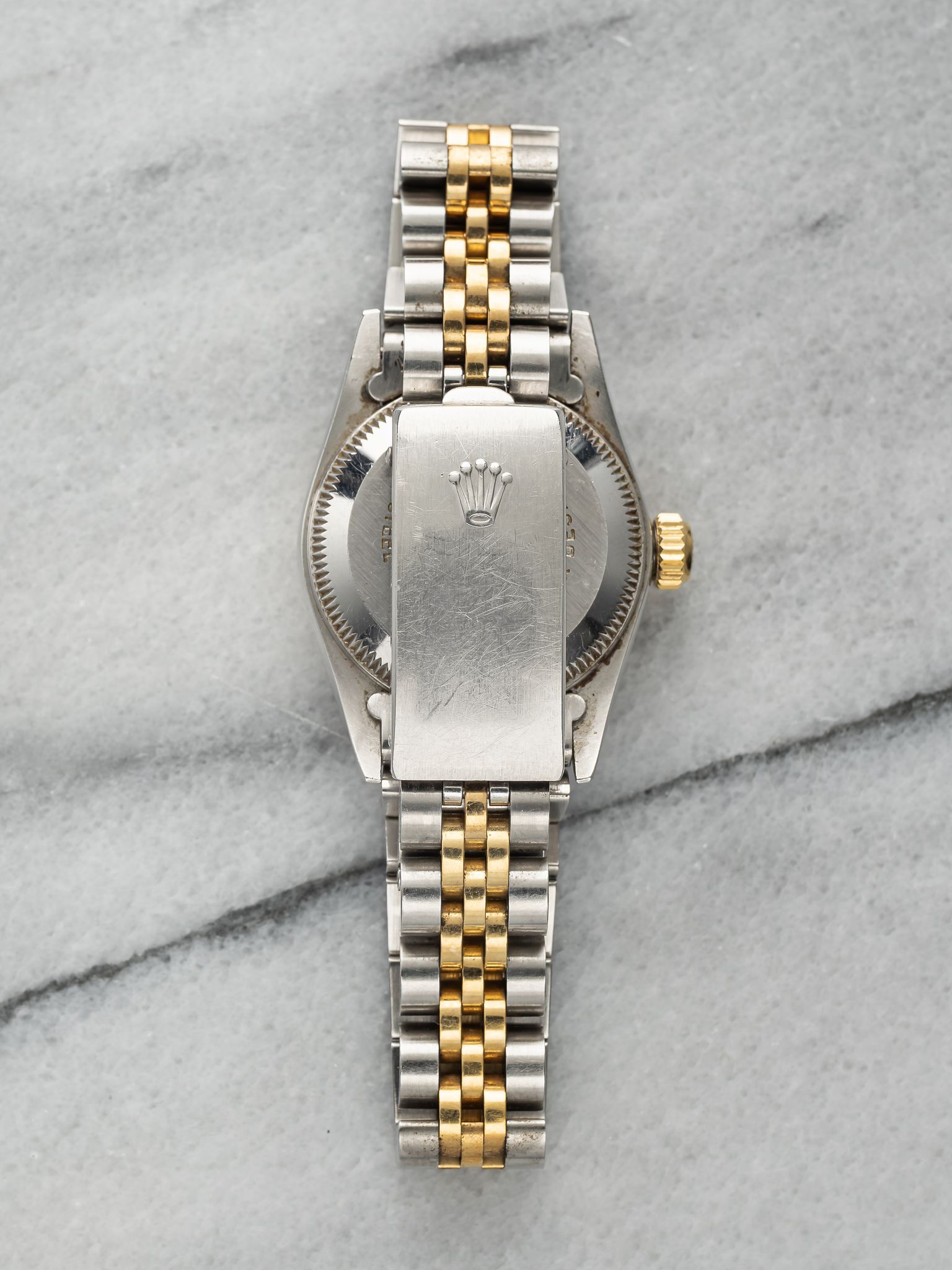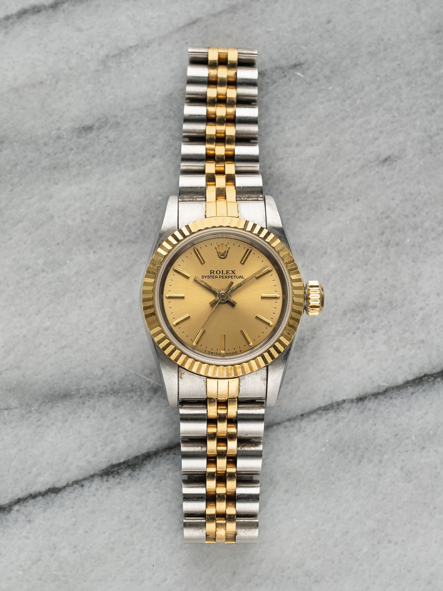 Here's a vintage ladies Rolex Oyster Perpetual reference 67193 automatic two tone with a champagne dial on a jubilee bracelet from the 80s. Keeps great time and is fully functional. Measurements include a 26mm oyster case. It's on a Rolex jubilee bracelet that fits up to a 6 wrist. The bracelet is quite tight for its age. Good condition on both the case and bracelet. Time only. Clean champagne dial and 18K yellow gold bezel. Steel case and caseback. The lume in the lume plots are an patina color. Drilled lug holes. The bezel and center links still maintained its rich yellow color. Crystal has some scratches that will be buffed out after. All parts are original including the signed Rolex crown, dial, movement, and caseback. Both the dial and case are in great cosmetic, untouched condition.