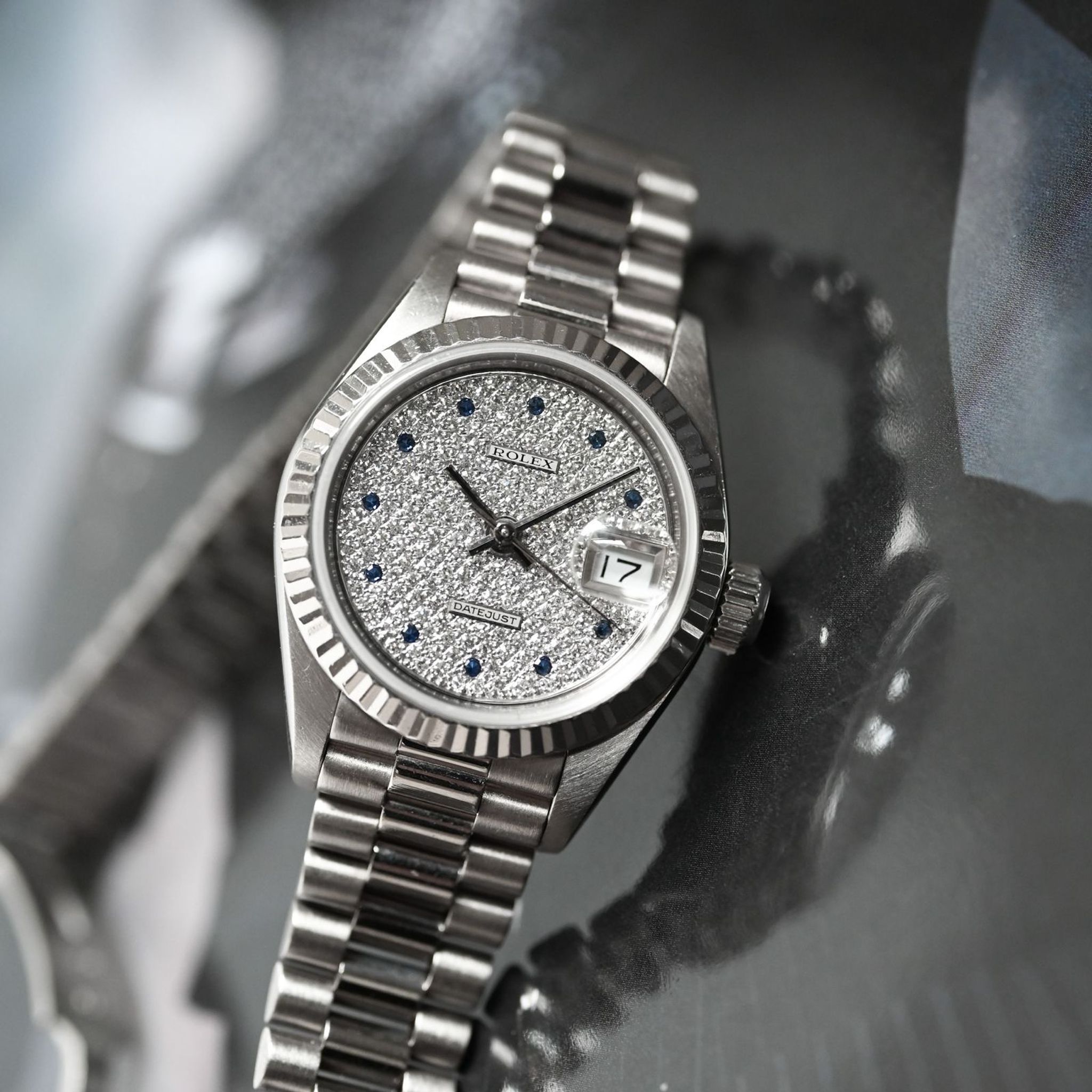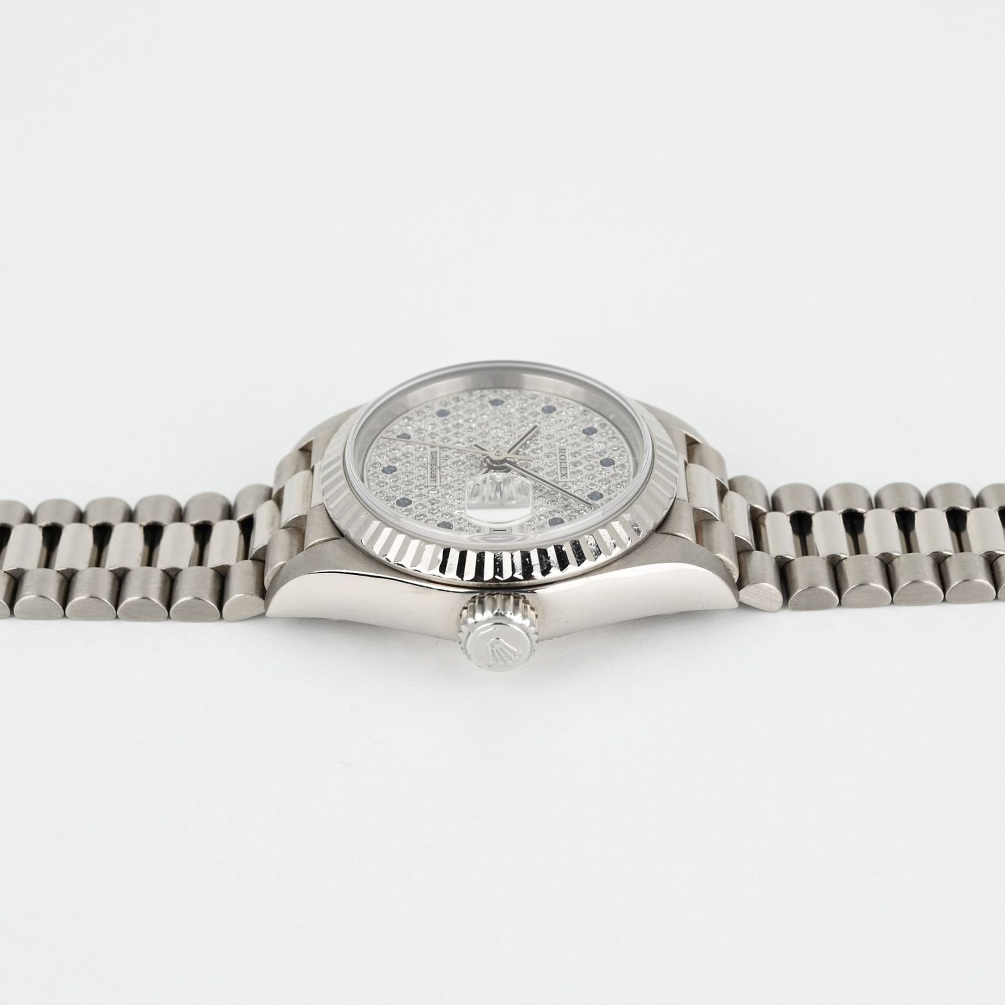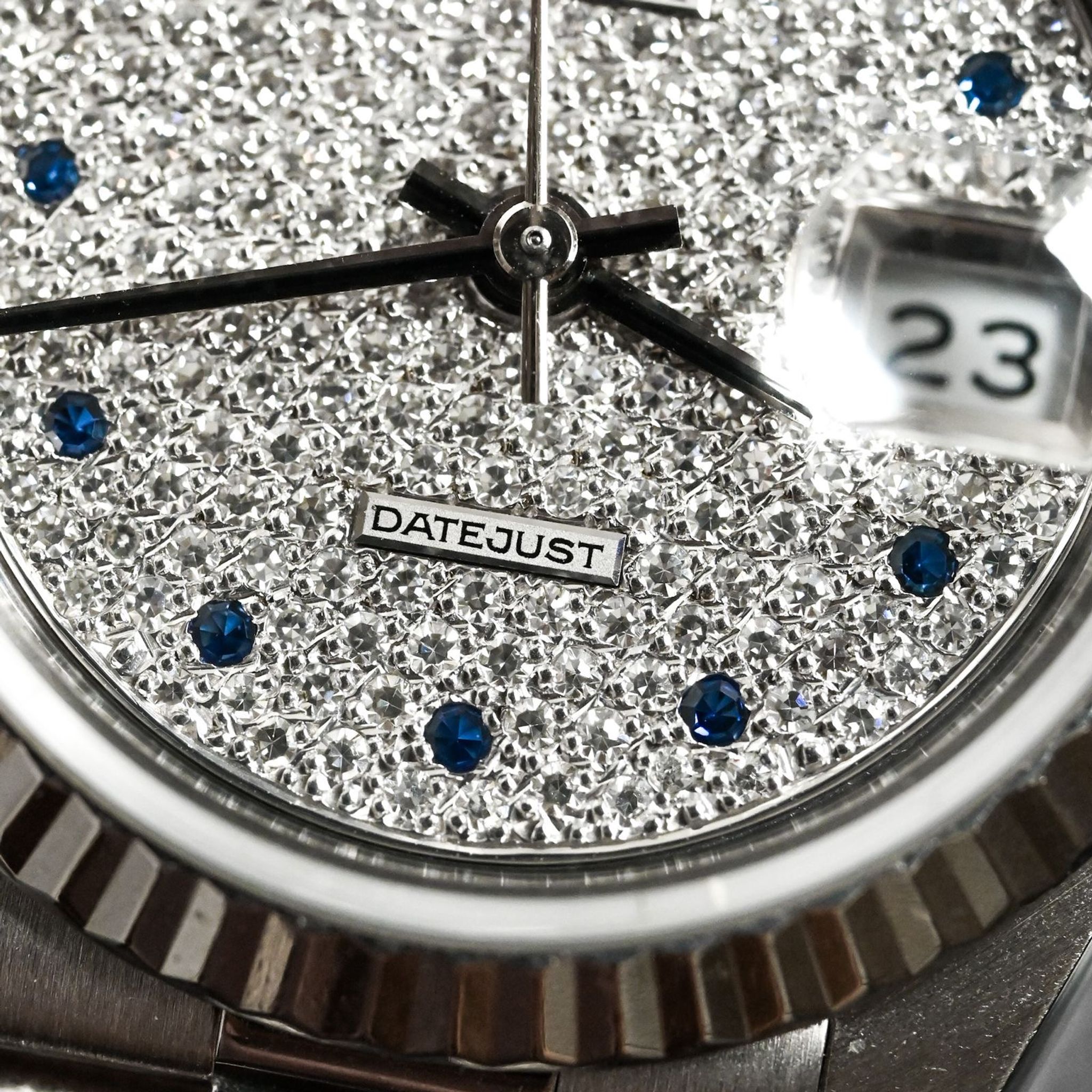 This 1991 model features a rare dial paved with diamonds and sapphires, a particularly attractive combination. The crystal, with a cyclops lens at 3 o'clock for easy date reading, is made of virtually scratchproof sapphire, and the three-link President bracelet features a Crownclasp clasp.