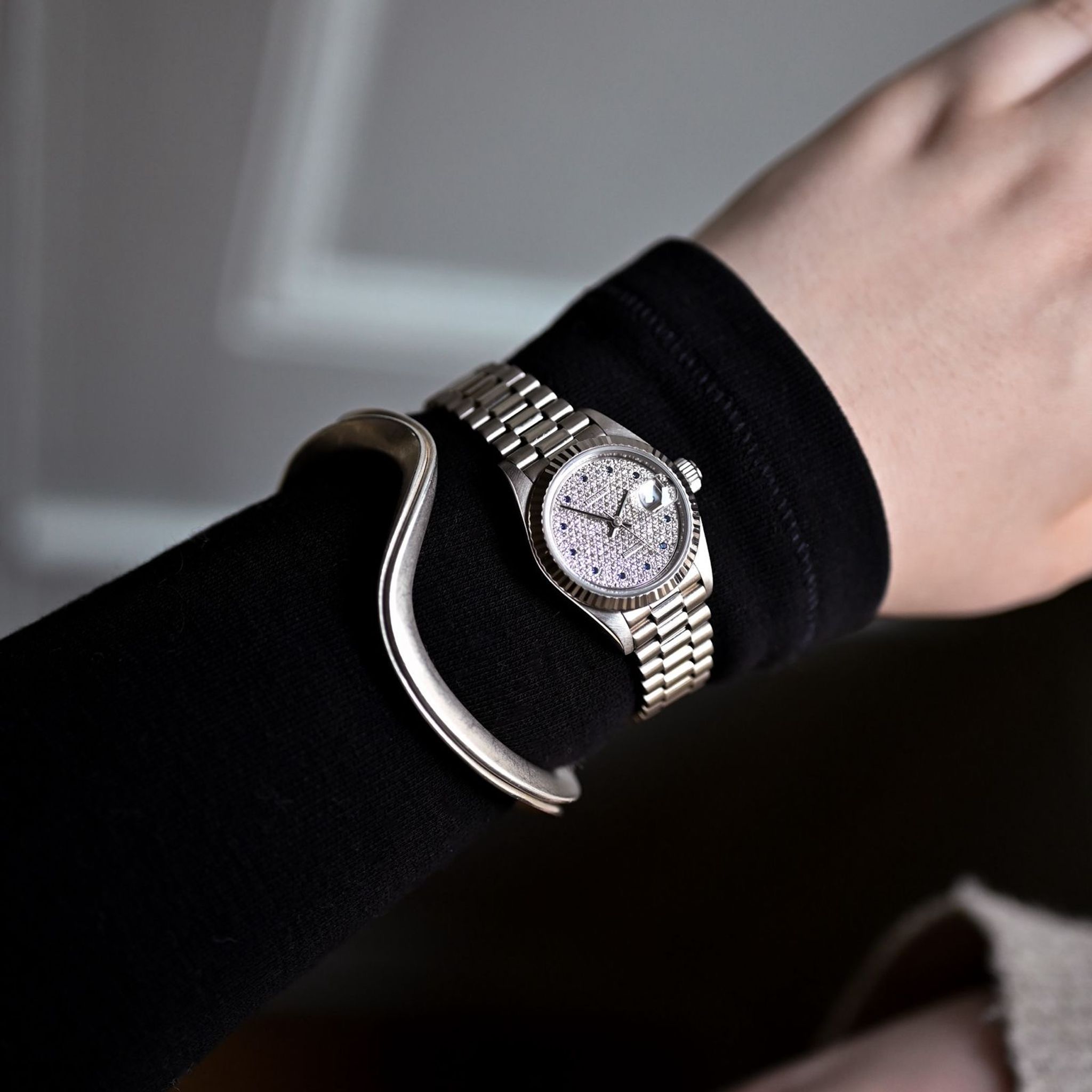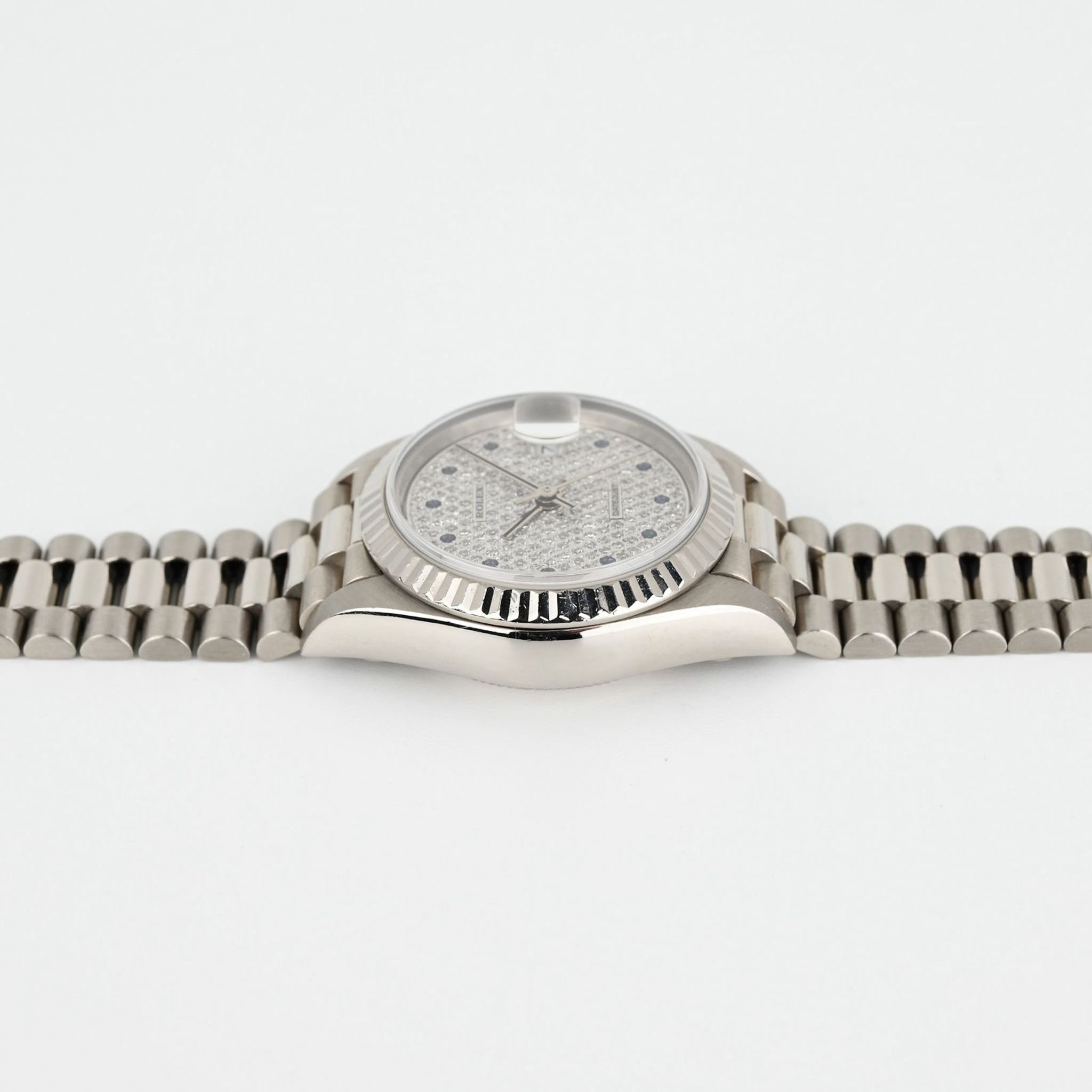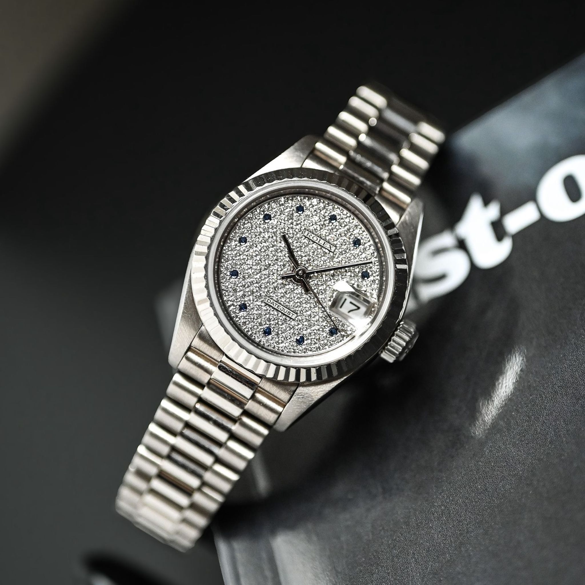 This 1991 model features a rare dial paved with diamonds and sapphires, a particularly attractive combination. The crystal, with a cyclops lens at 3 o'clock for easy date reading, is made of virtually scratchproof sapphire, and the three-link President bracelet features a Crownclasp clasp.