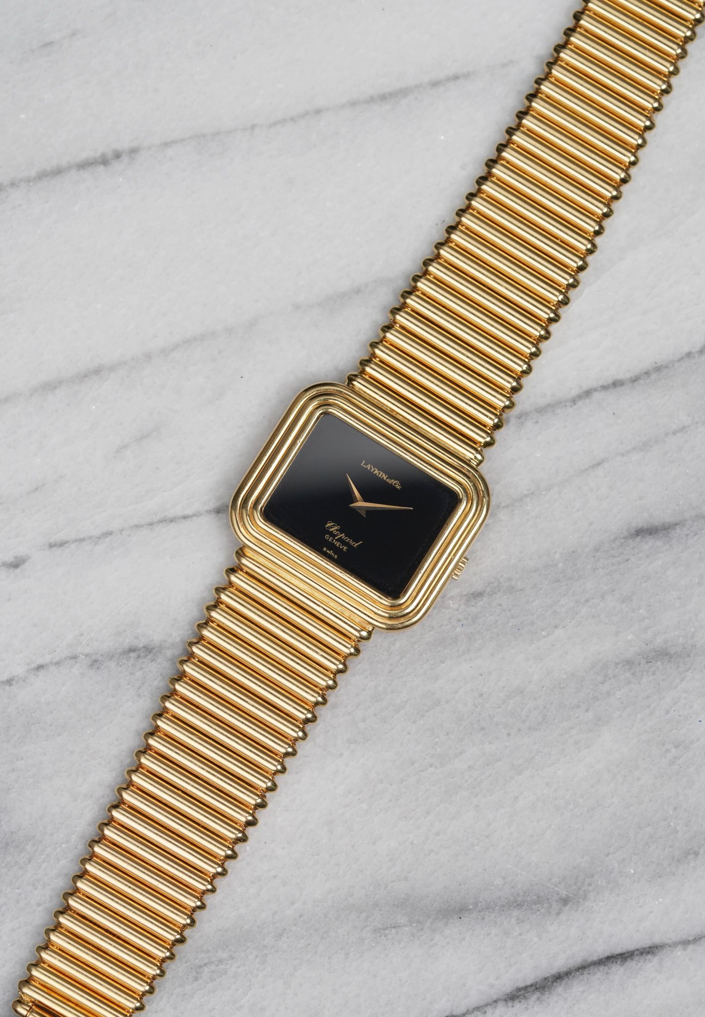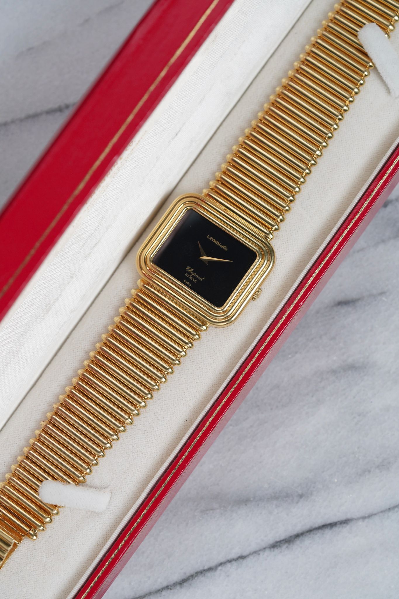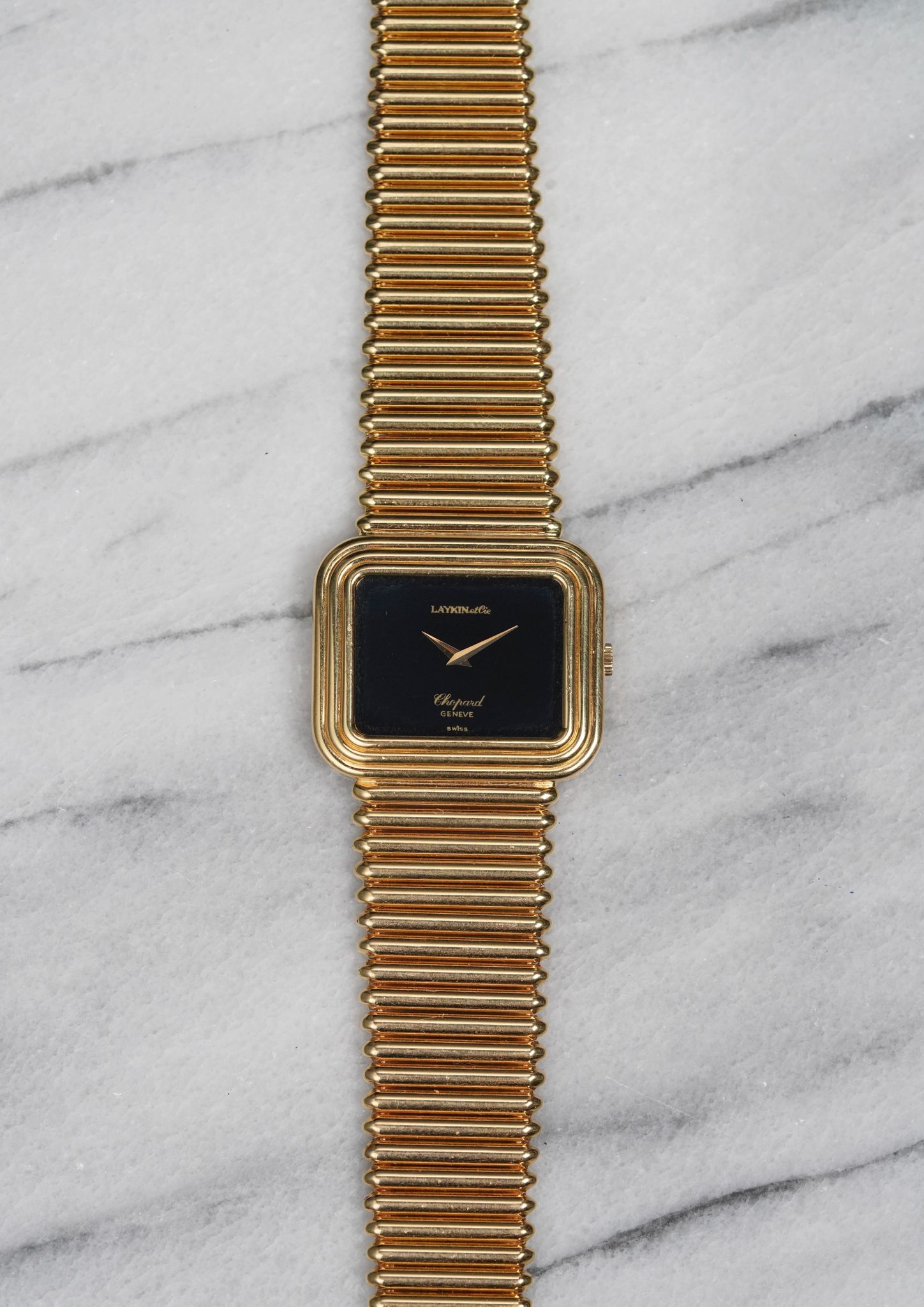 Here’s a Chopard in 18k yellow gold with a black onyx stone dial with a Laykin & Co double stamp at 12 a clock from the 1970s. Measurements include a 30mm case and a bracelet that fits up to a 7.25 inch wrist. Stepped case. Time only. Dauphine hands. Bullet-like finish on the bracelet. 18k yellow gold case and bracelet. Weighs 99.2 grams. It's not only cool to see the double retail stamp but it comes with its original red box.