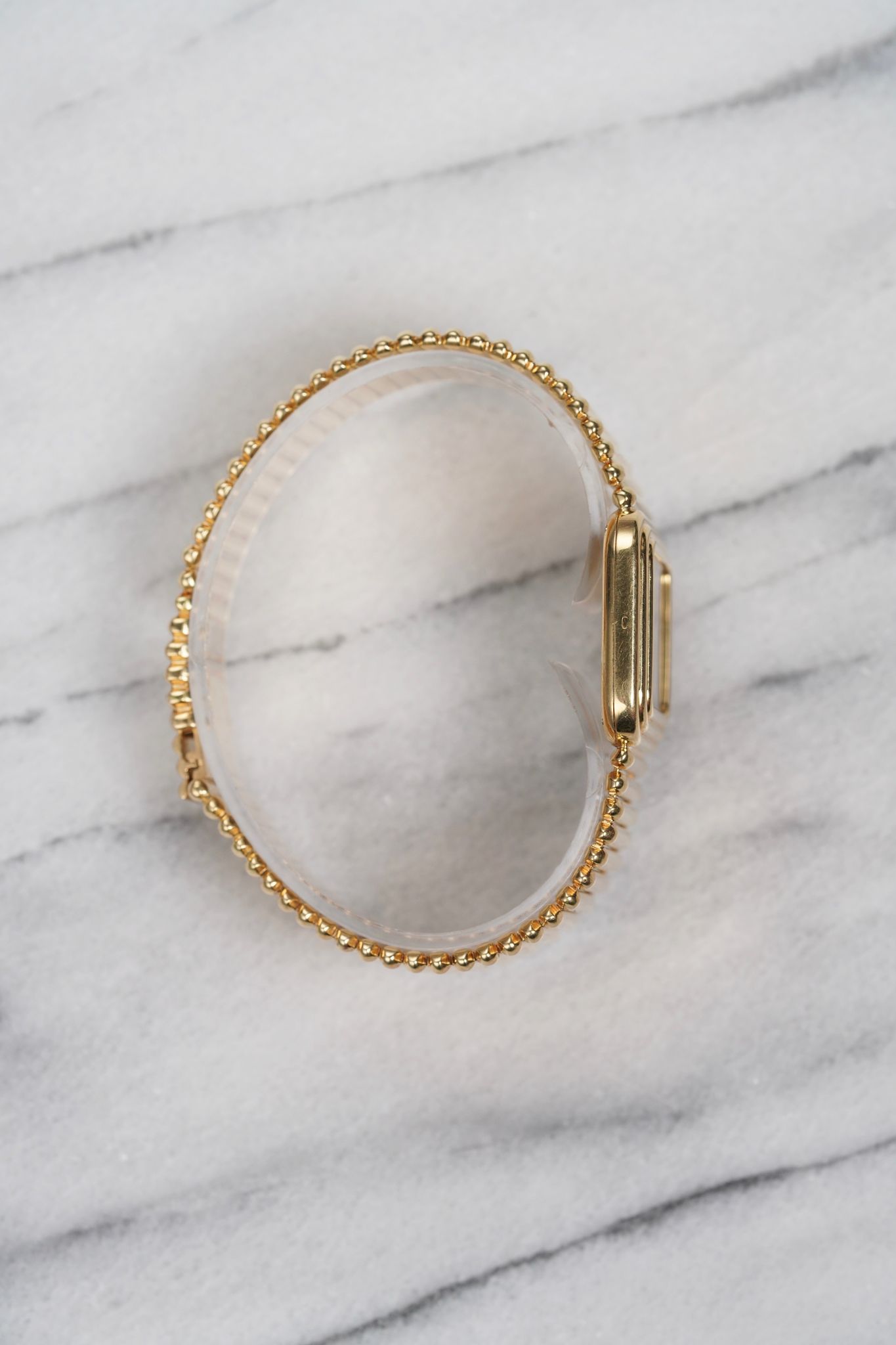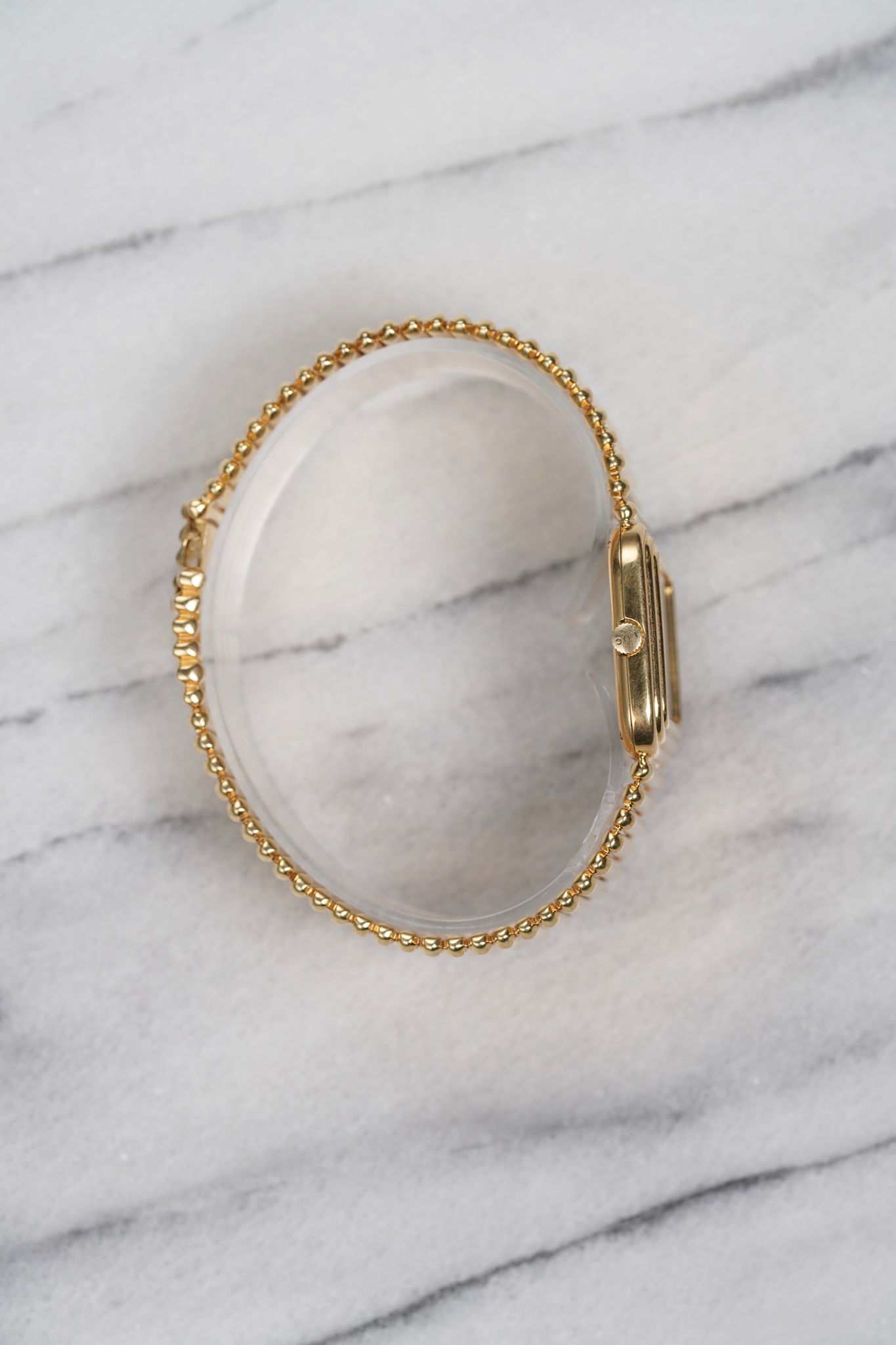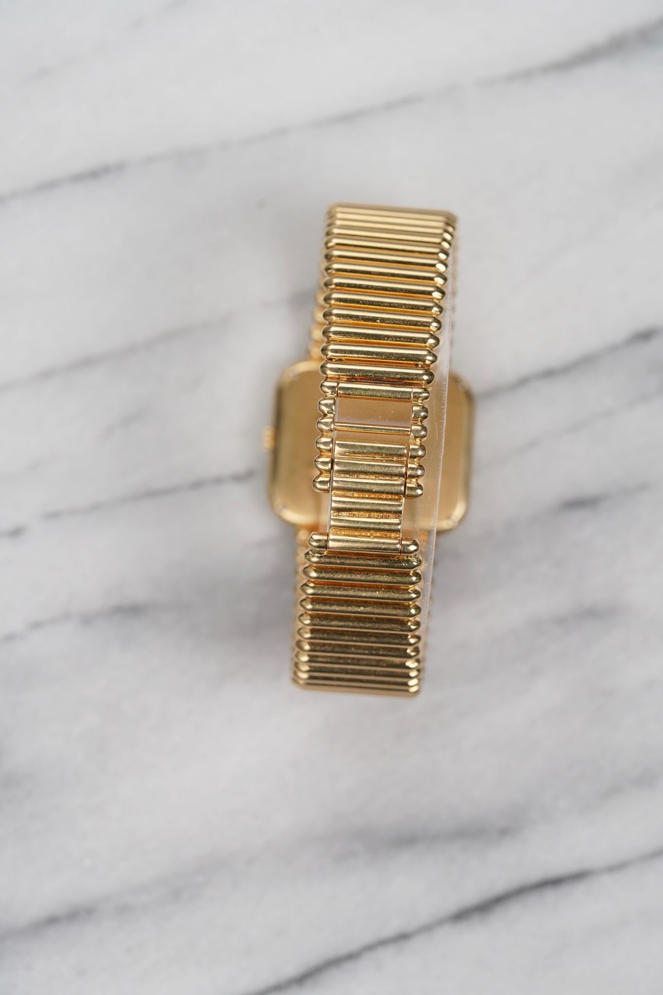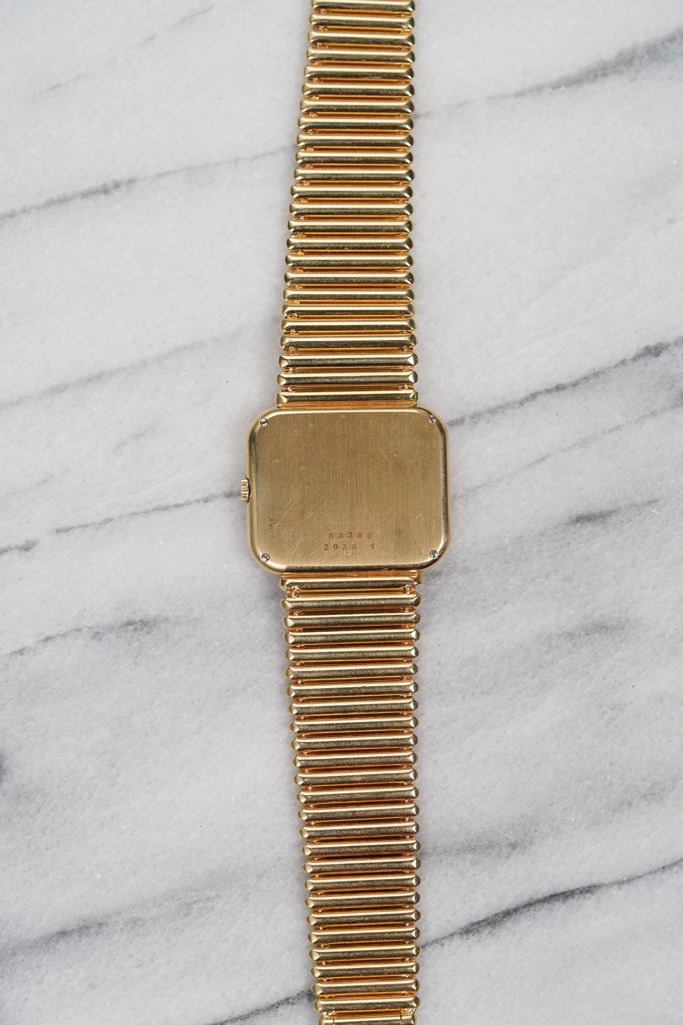 Here’s a Chopard in 18k yellow gold with a black onyx stone dial with a Laykin & Co double stamp at 12 a clock from the 1970s. Measurements include a 30mm case and a bracelet that fits up to a 7.25 inch wrist. Stepped case. Time only. Dauphine hands. Bullet-like finish on the bracelet. 18k yellow gold case and bracelet. Weighs 99.2 grams. It's not only cool to see the double retail stamp but it comes with its original red box.