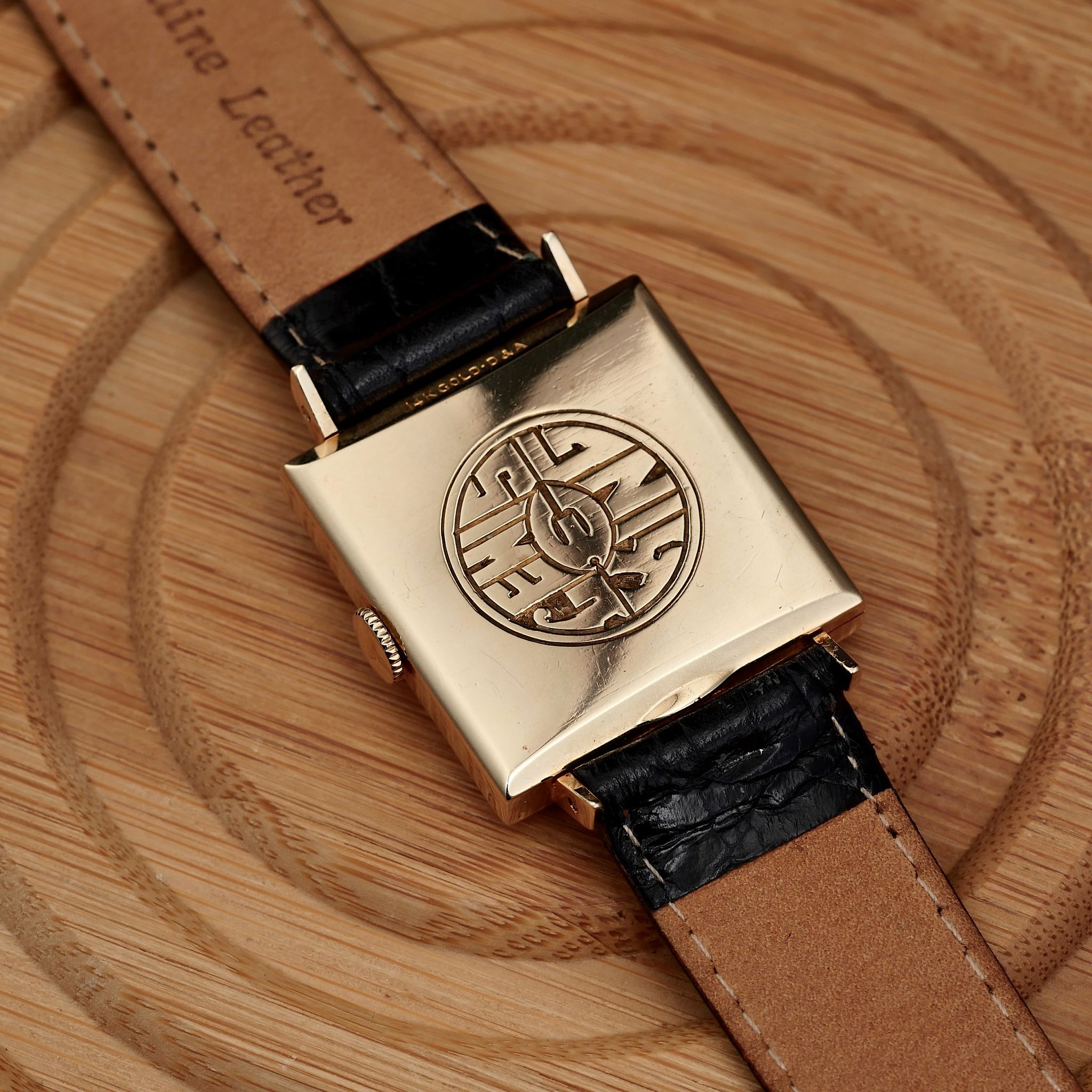 FEATURES: 14k Yellow Gold, Black Dial, Solid Engraved Caseback, Black Leather Strap, non OEM Gold buckle, Limited Production