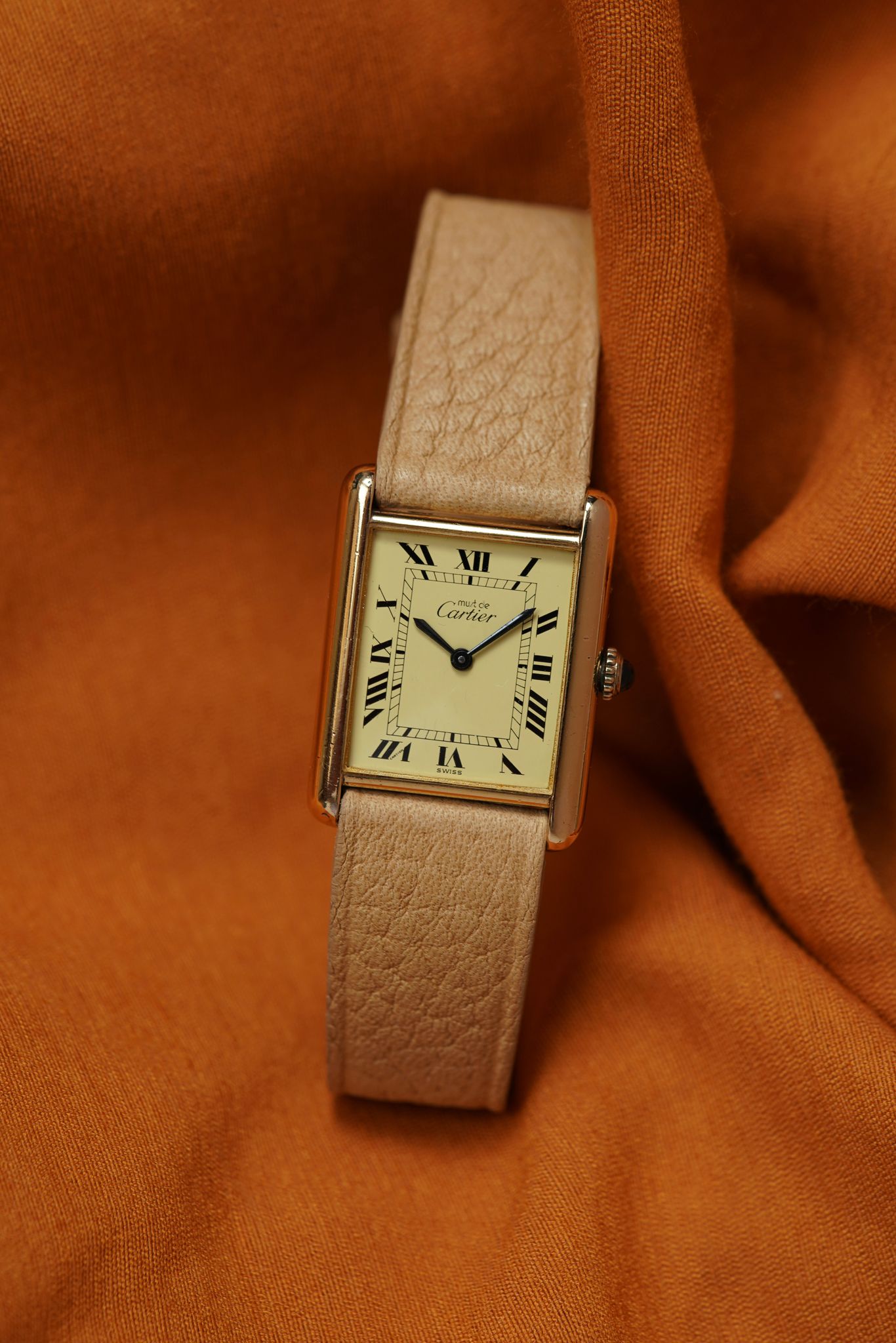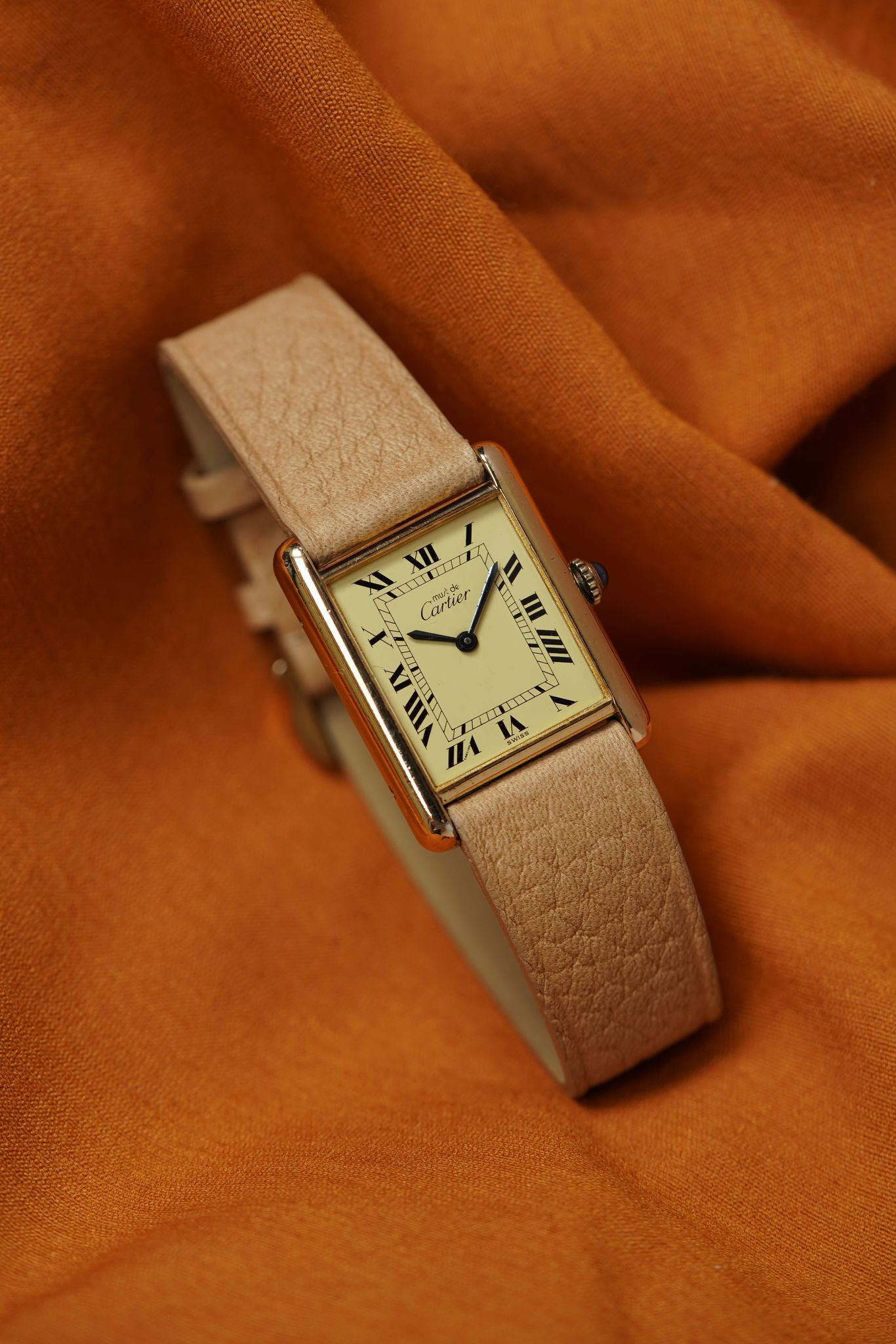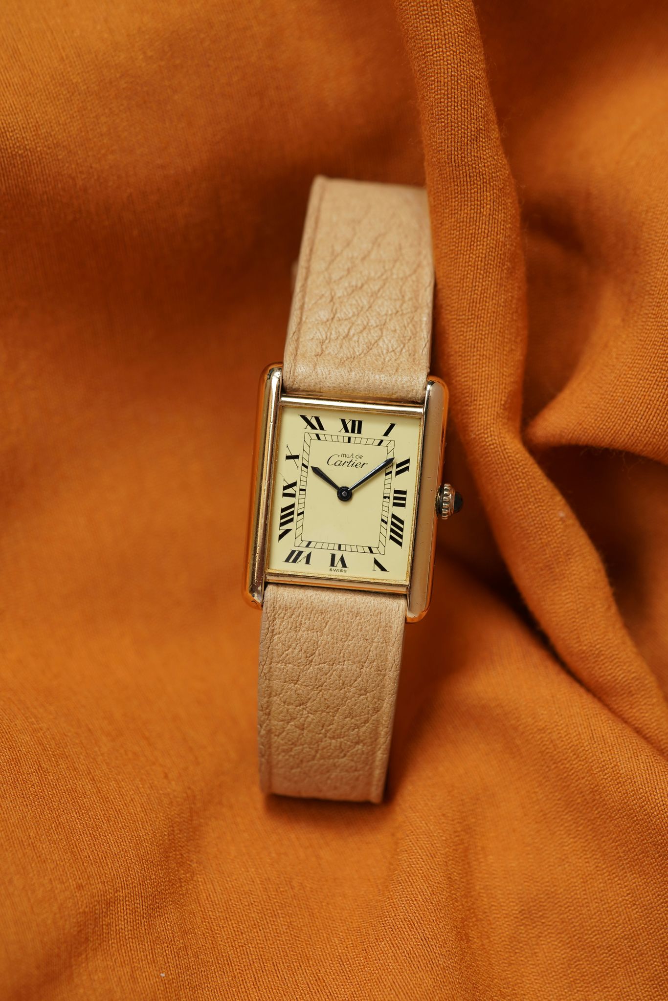 Cartier Tank Must with lemon champagne dial and blued steel hands, paired with our signature Avocado Summer strap. Manual wind, gold-plated case, and blue cabochon crown — all in excellent original condition.