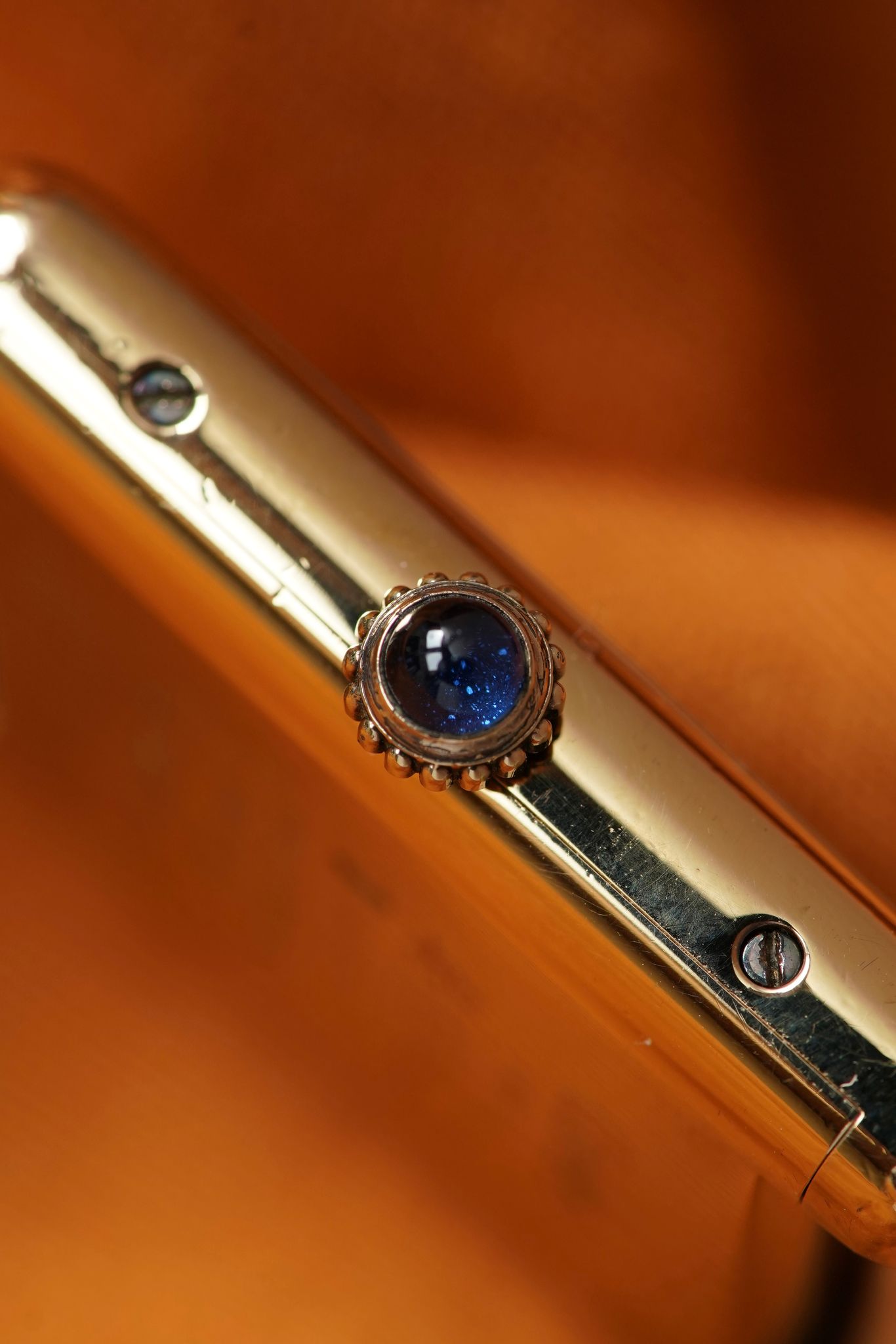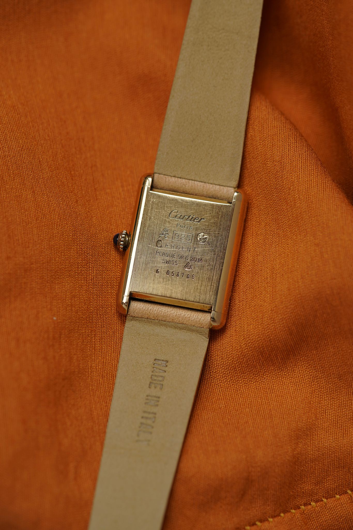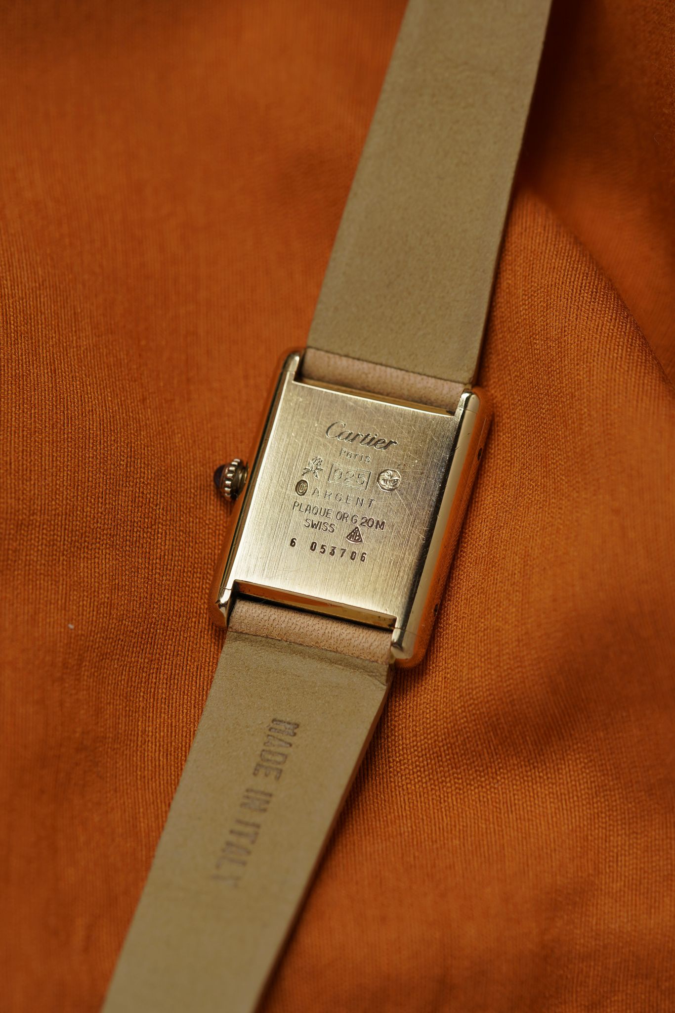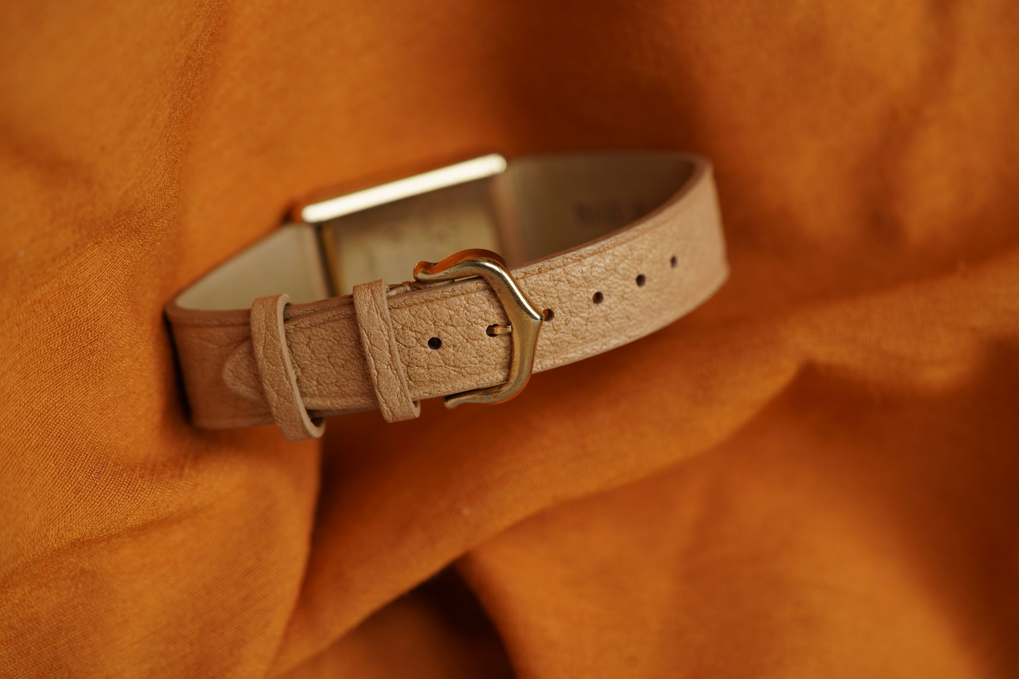Cartier Tank Must with lemon champagne dial and blued steel hands, paired with our signature Avocado Summer strap. Manual wind, gold-plated case, and blue cabochon crown — all in excellent original condition.