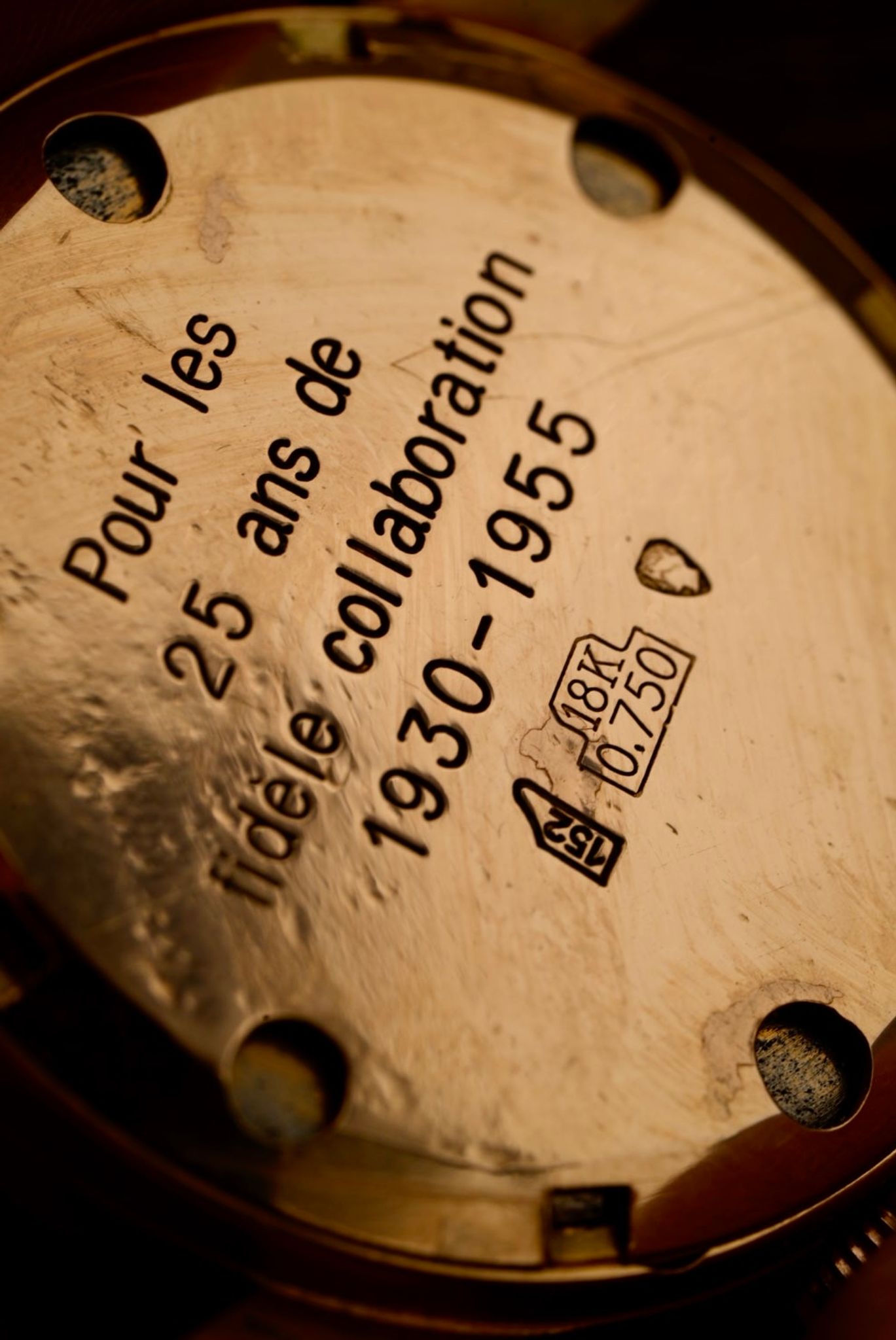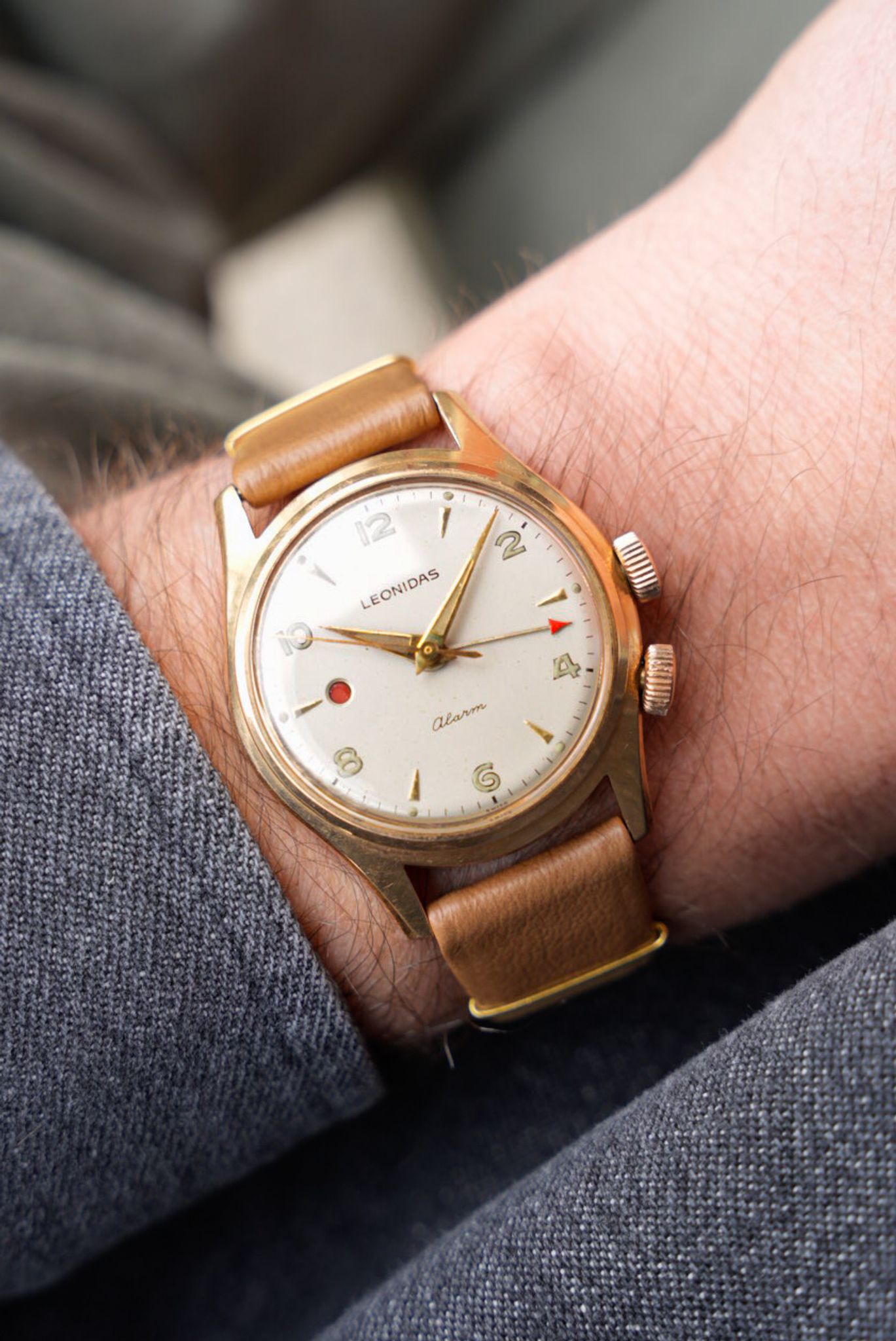 This Leonidas Alarm is in excellent overall condition for a nearly 70-year-old watch. Its gold case has a small, barely visible ding, but remains well-preserved, with sharp edges. The untouched dial has retained its original luminous material. Additionally, the watch has just been serviced, ensuring optimal performance. As the case back engraving indicates, it was presented to a dedicated employee after 25 years of service—a well-deserved reward, but also an amusing choice: an alarm watch for a loyal worker. Perhaps they were already remarkably punctual, or maybe their boss hoped this watch would ensure they never ran late again! Either way, this piece is a true piece of horological history and a fantastic acquisition for any serious collector.