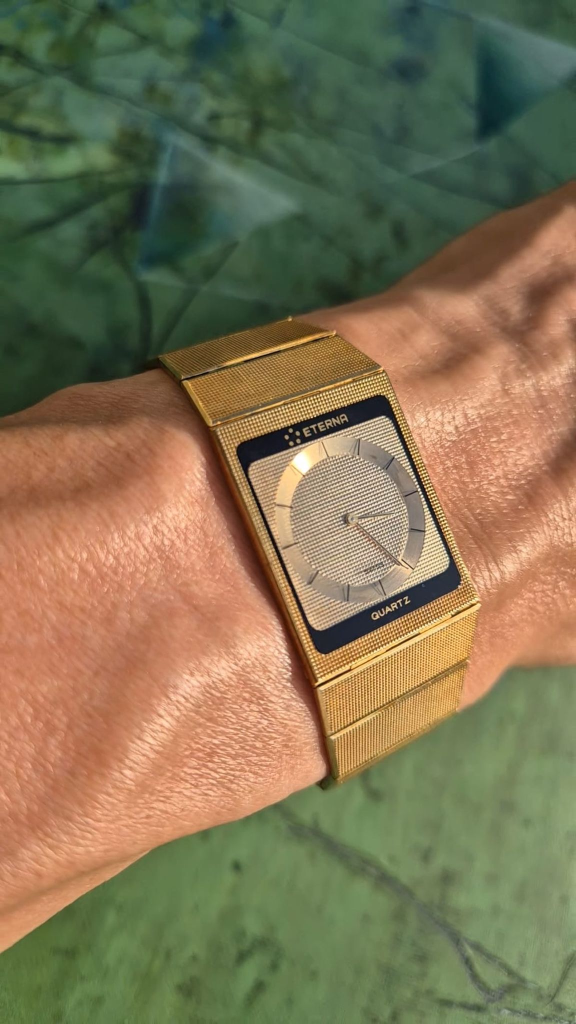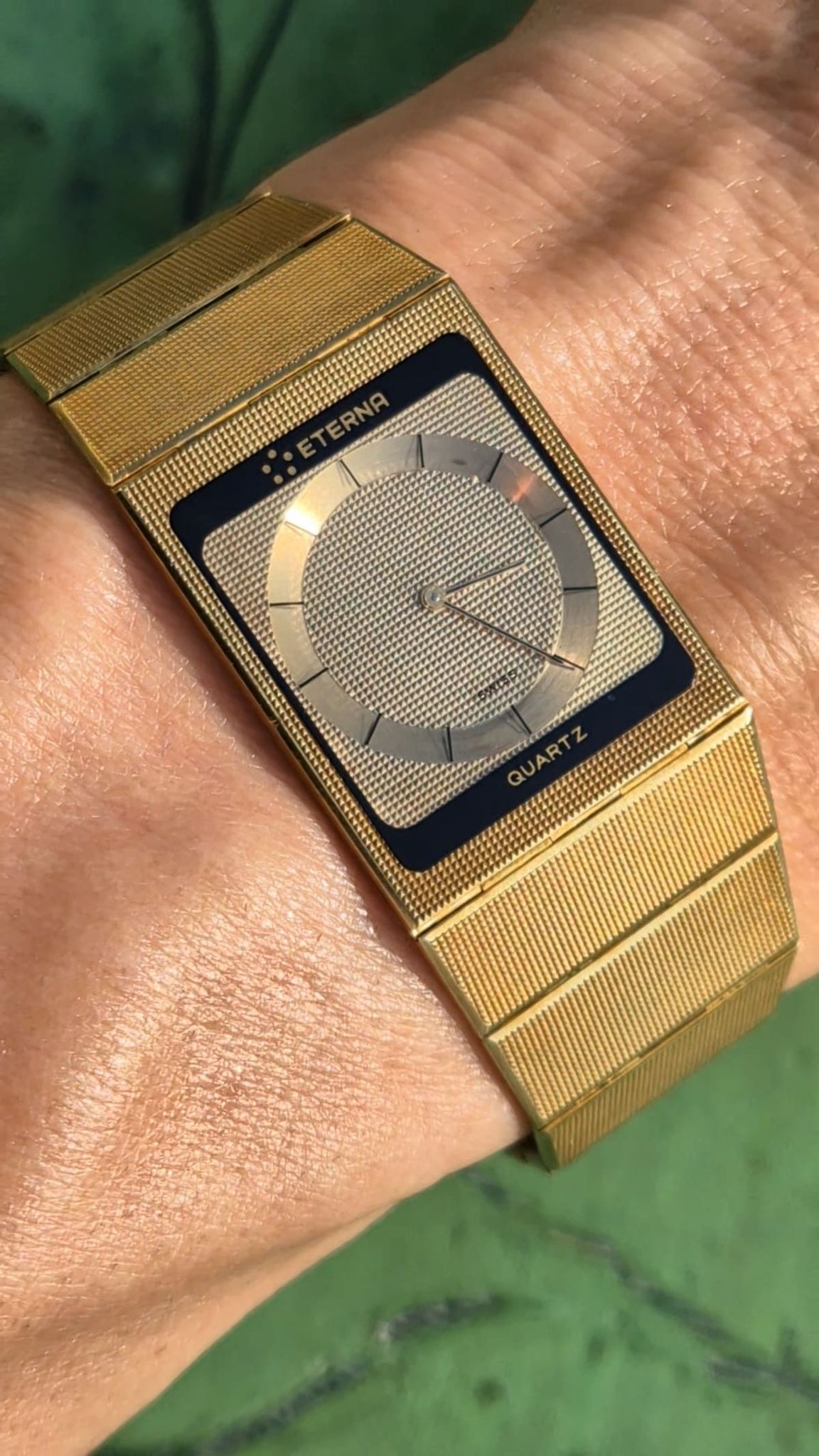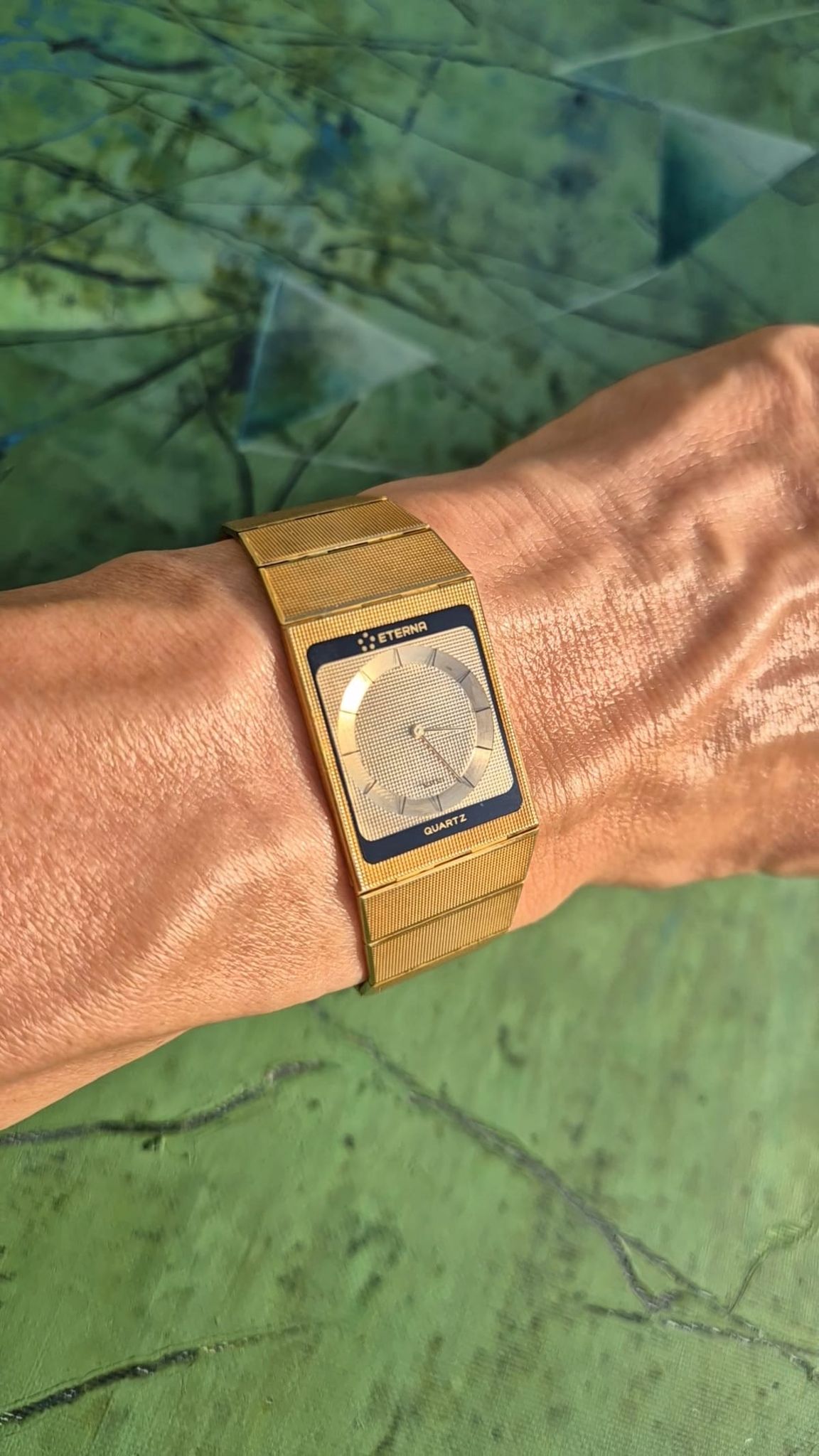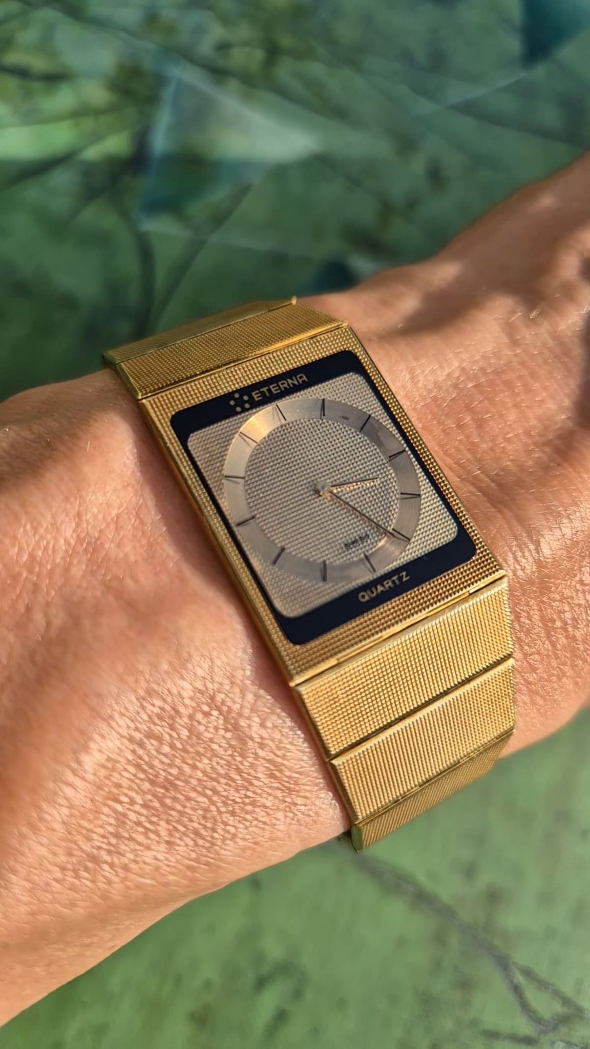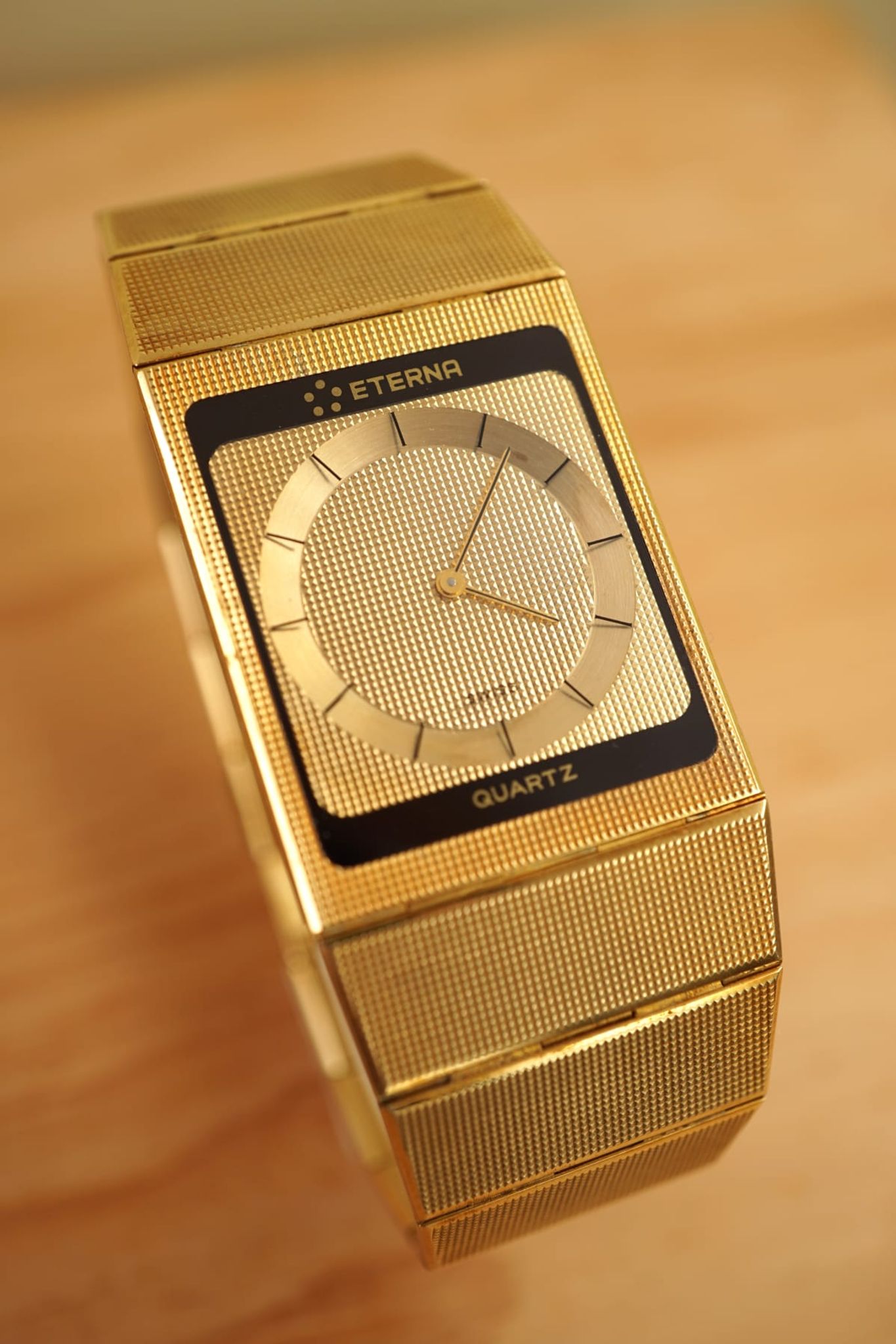 With the model on a leather strap priced CHF12'900 in 1979 -- Eterna Espada Delirium Tres Mince (sounds Tremens). This even rarer and more special variant with the solid gold bracelet, that is all decorated with the same hobnail- / guilloche-pattern as the case and dial, sold for a whopping CHF25'800 in 1979. And so it is safe to assume it was a rare watch back then already. And today with many smelted in the last four decades and in excellent running condition and that well preserved, it comes close to a piece unique. Yes, it was the hottest watch you could buy in 1979 -- if you could: on the edge of technology, super-precise and all hand-engraved by the case-maker-artisans at Favre & Perret -- yes, they made the Patek 3700 Nautilus Jumbo, the Patek 3770 Nautillipse and several other Pateks, too.