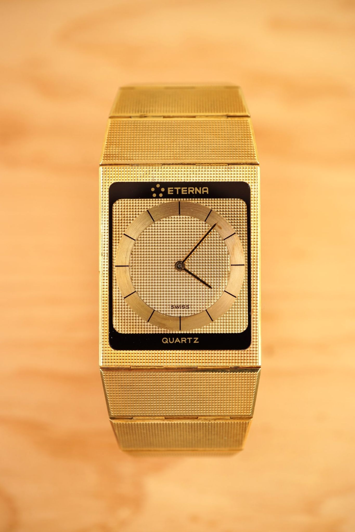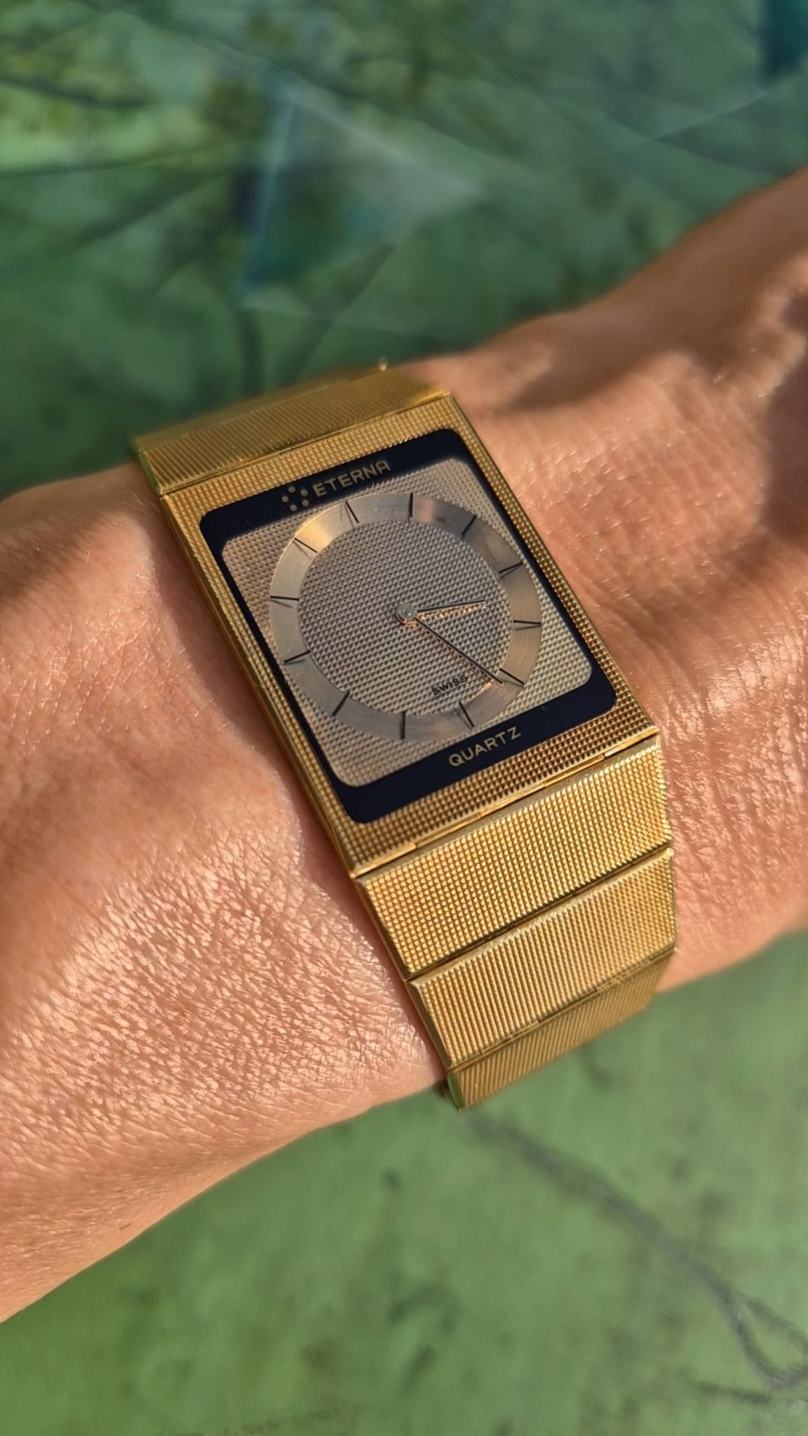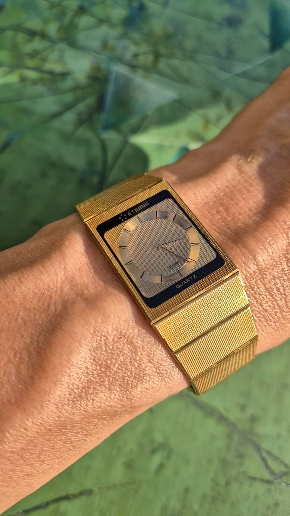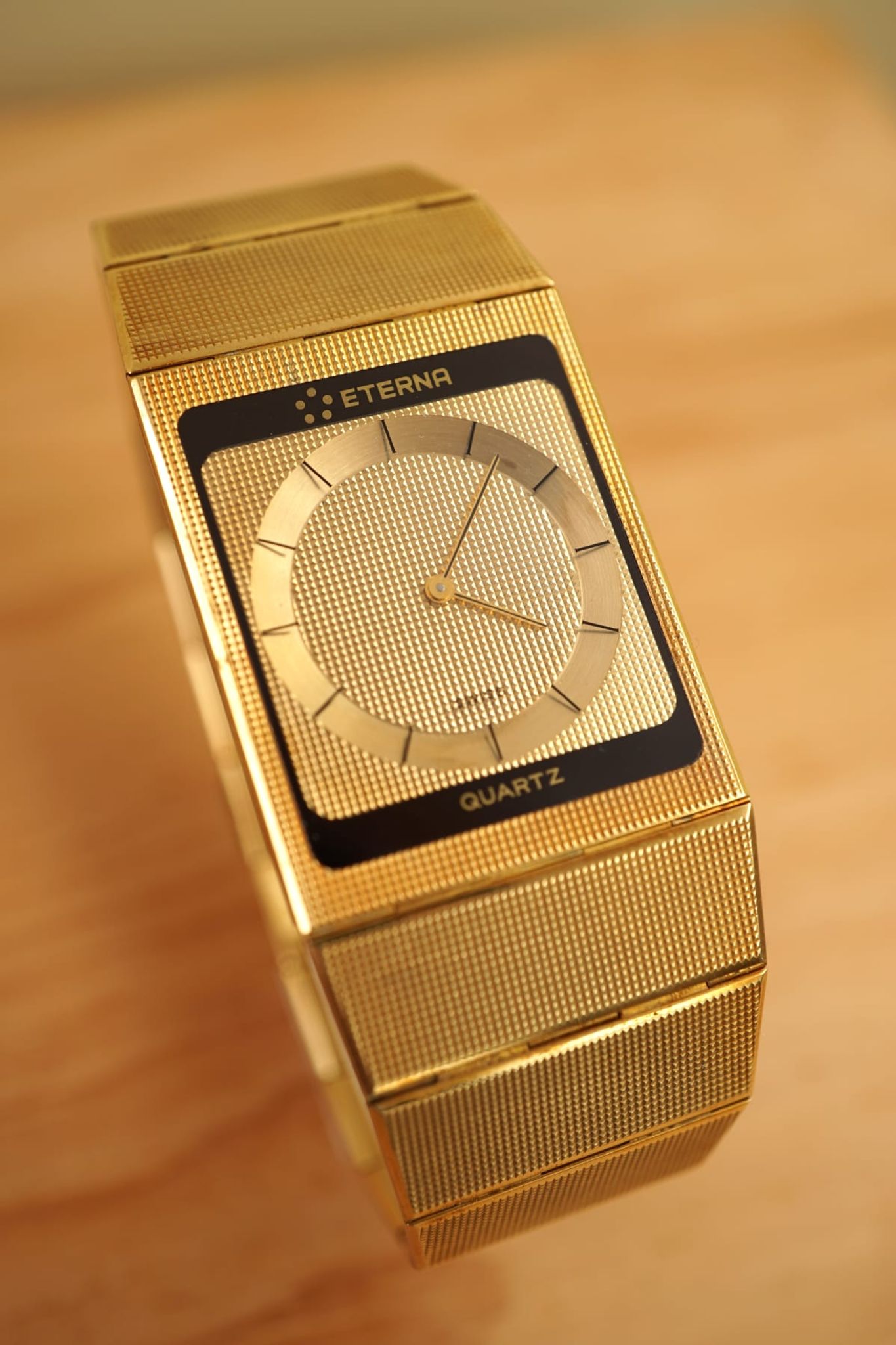 With the model on a leather strap priced CHF12'900 in 1979 -- Eterna Espada Delirium Tres Mince (sounds Tremens). This even rarer and more special variant with the solid gold bracelet, that is all decorated with the same hobnail- / guilloche-pattern as the case and dial, sold for a whopping CHF25'800 in 1979. And so it is safe to assume it was a rare watch back then already. And today with many smelted in the last four decades and in excellent running condition and that well preserved, it comes close to a piece unique. Yes, it was the hottest watch you could buy in 1979 -- if you could: on the edge of technology, super-precise and all hand-engraved by the case-maker-artisans at Favre & Perret -- yes, they made the Patek 3700 Nautilus Jumbo, the Patek 3770 Nautillipse and several other Pateks, too.
