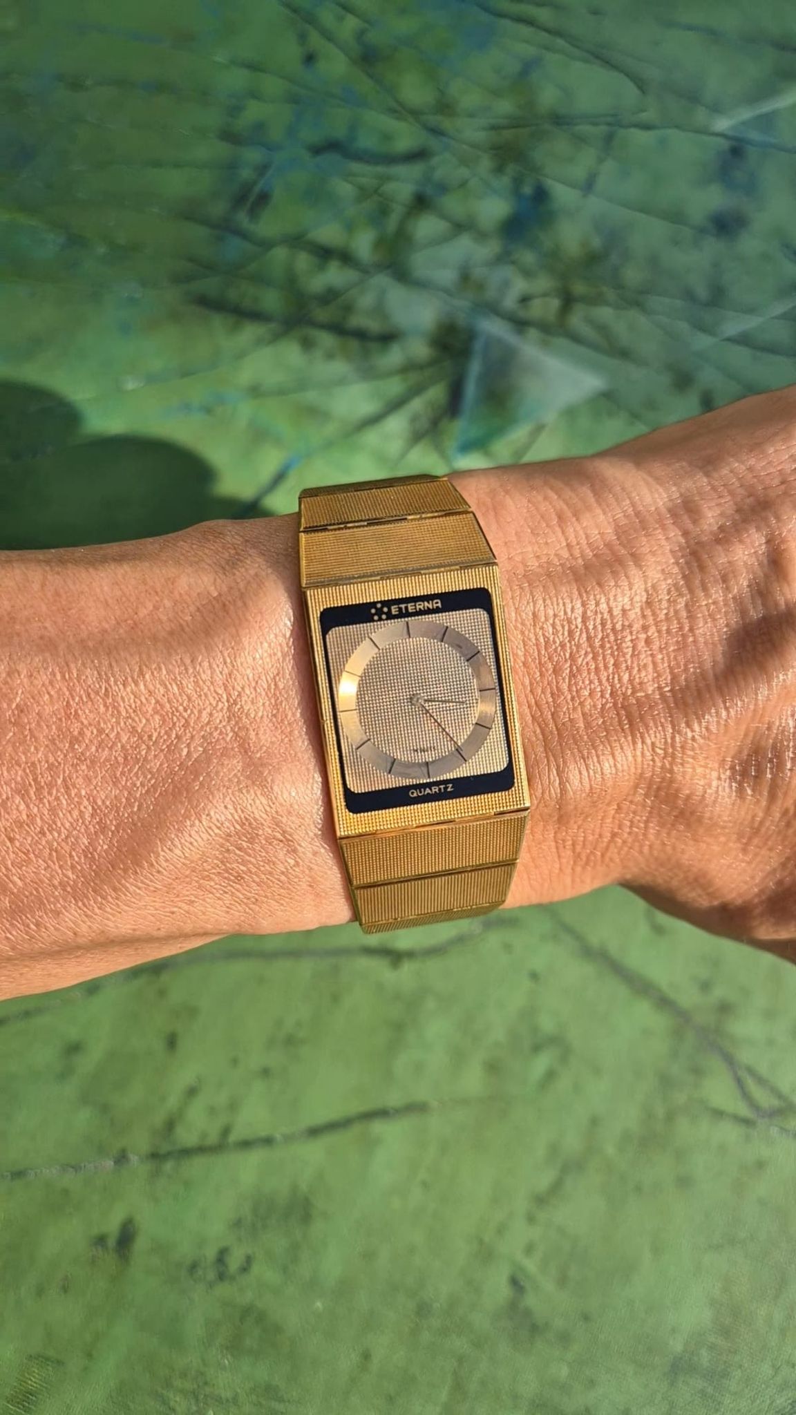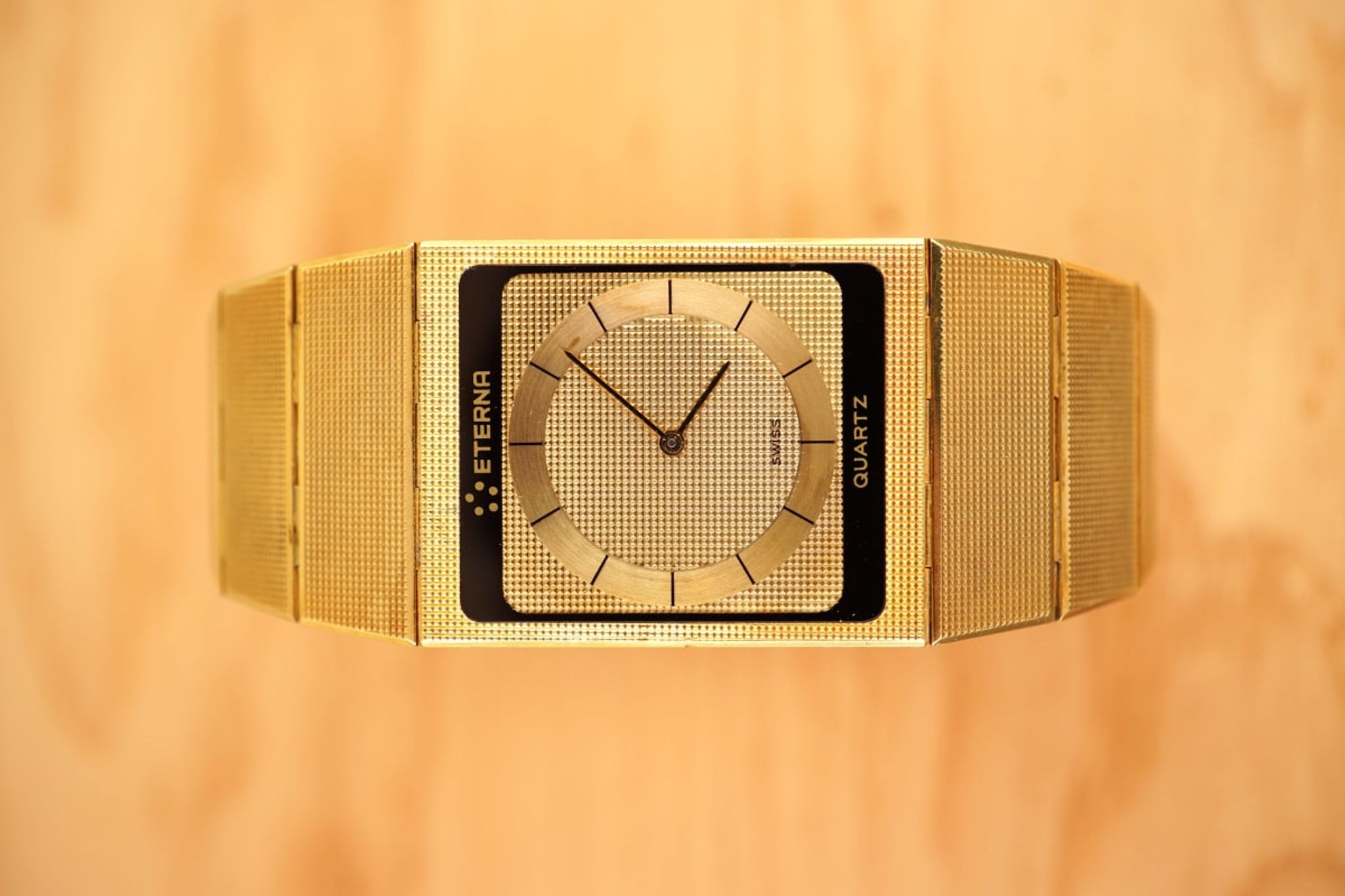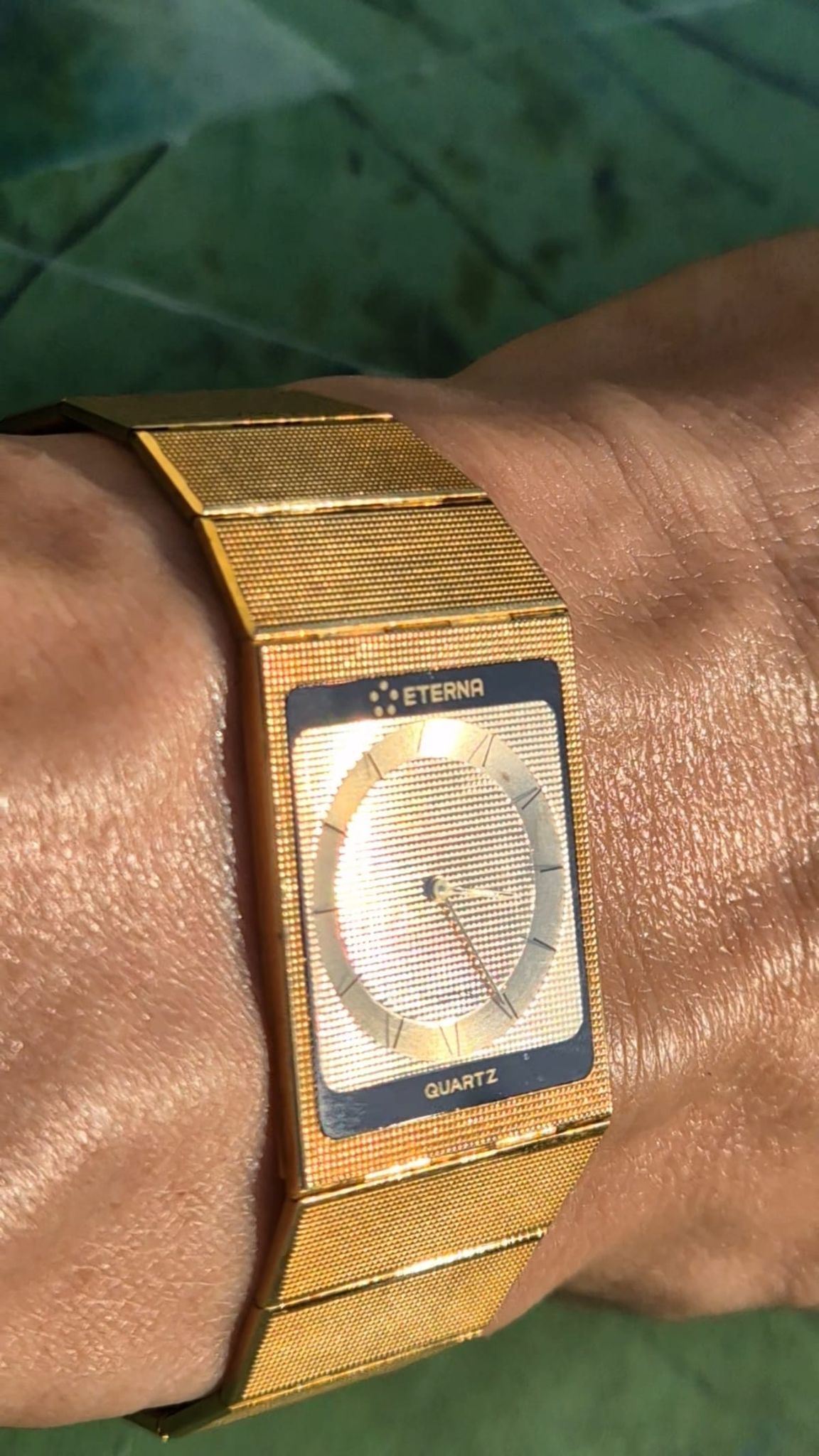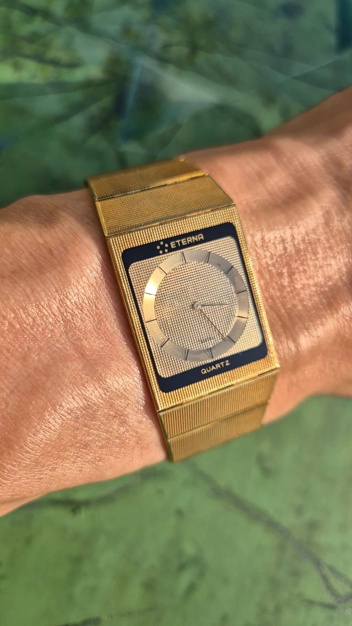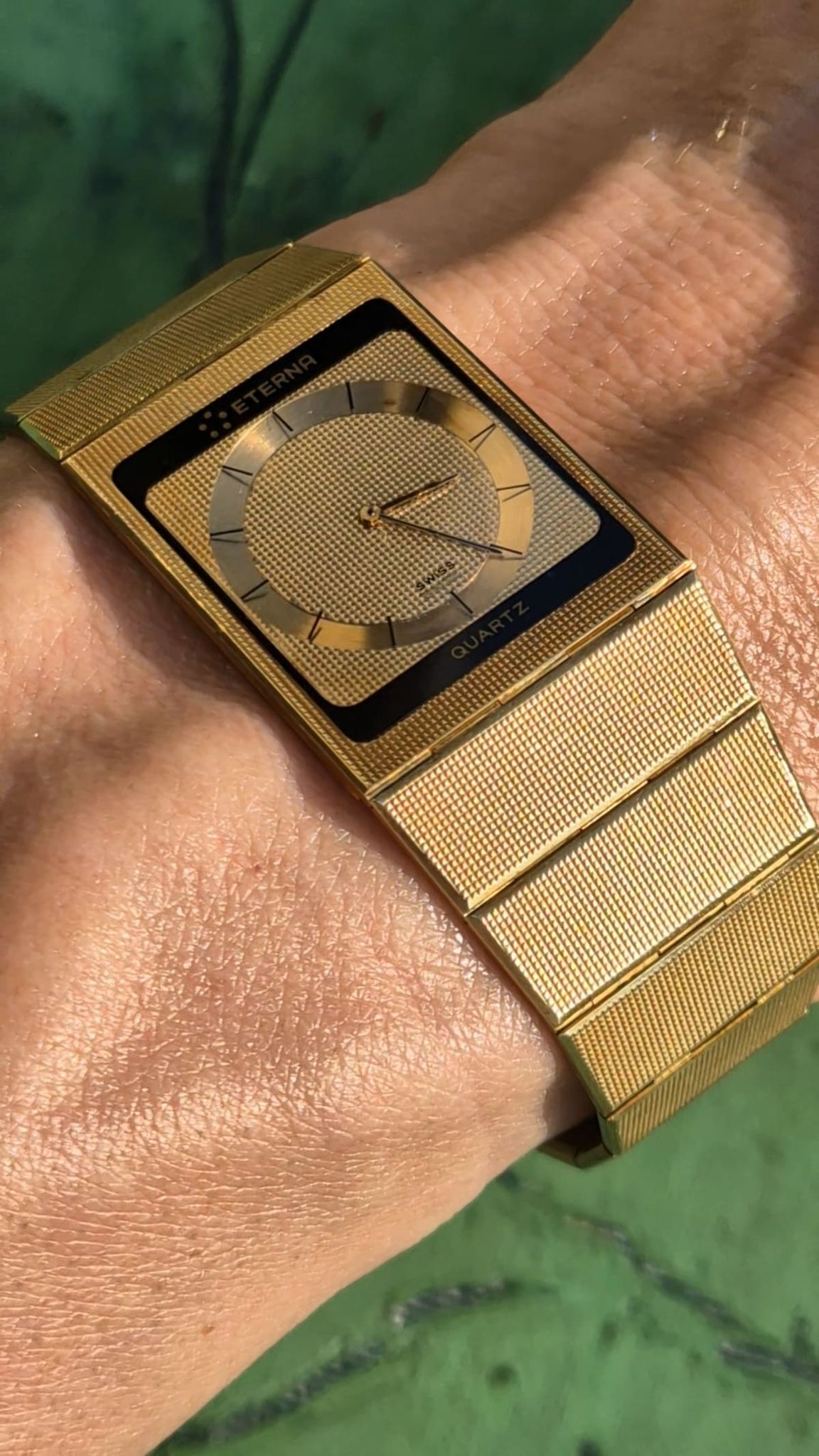 With the model on a leather strap priced CHF12'900 in 1979 -- Eterna Espada Delirium Tres Mince (sounds Tremens). This even rarer and more special variant with the solid gold bracelet, that is all decorated with the same hobnail- / guilloche-pattern as the case and dial, sold for a whopping CHF25'800 in 1979. And so it is safe to assume it was a rare watch back then already. And today with many smelted in the last four decades and in excellent running condition and that well preserved, it comes close to a piece unique. Yes, it was the hottest watch you could buy in 1979 -- if you could: on the edge of technology, super-precise and all hand-engraved by the case-maker-artisans at Favre & Perret -- yes, they made the Patek 3700 Nautilus Jumbo, the Patek 3770 Nautillipse and several other Pateks, too.