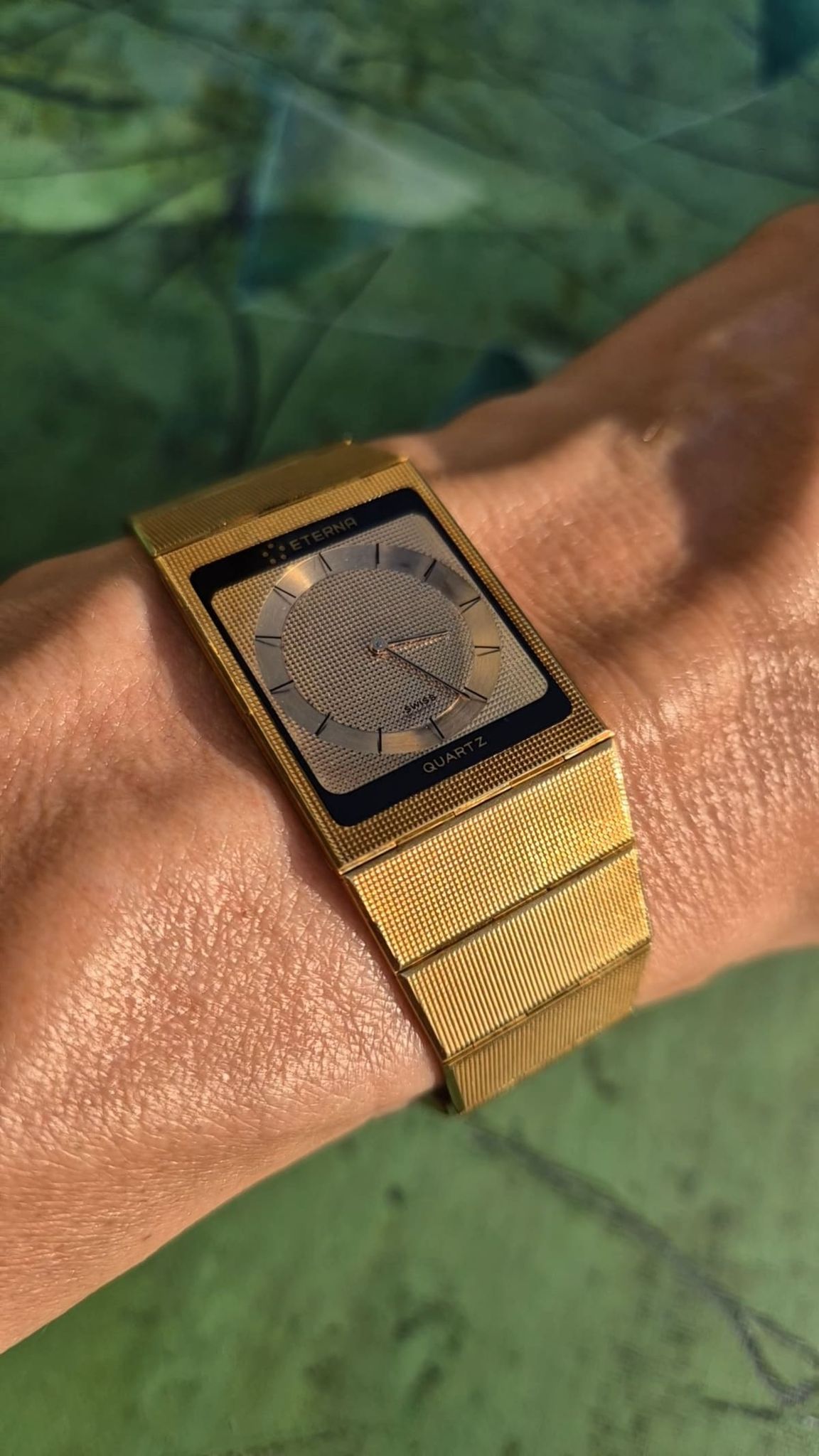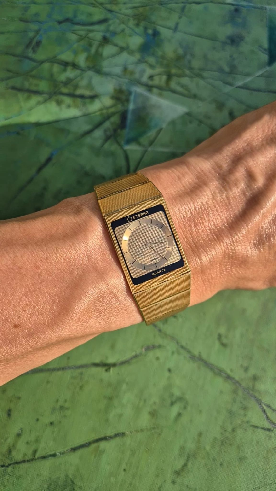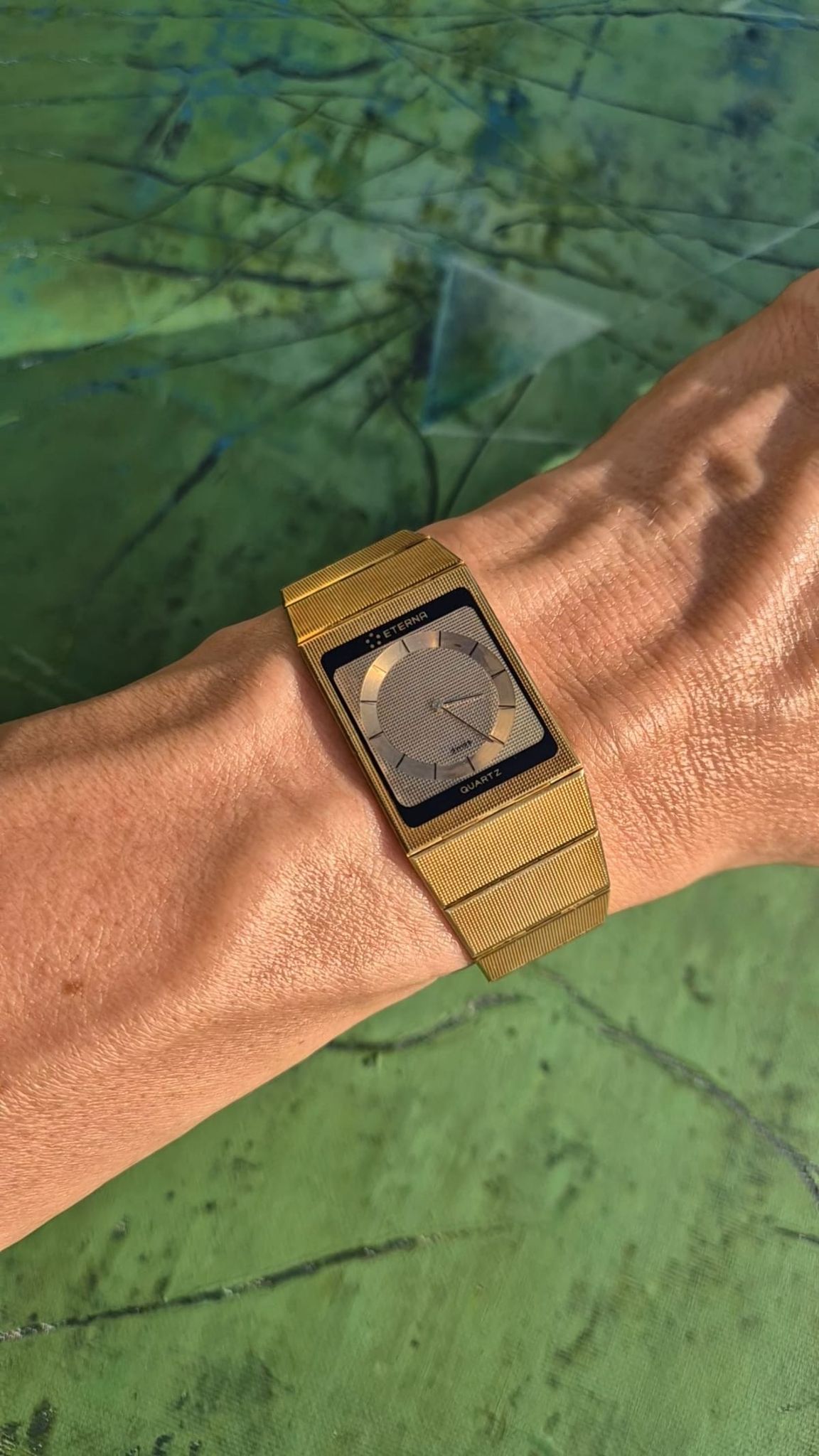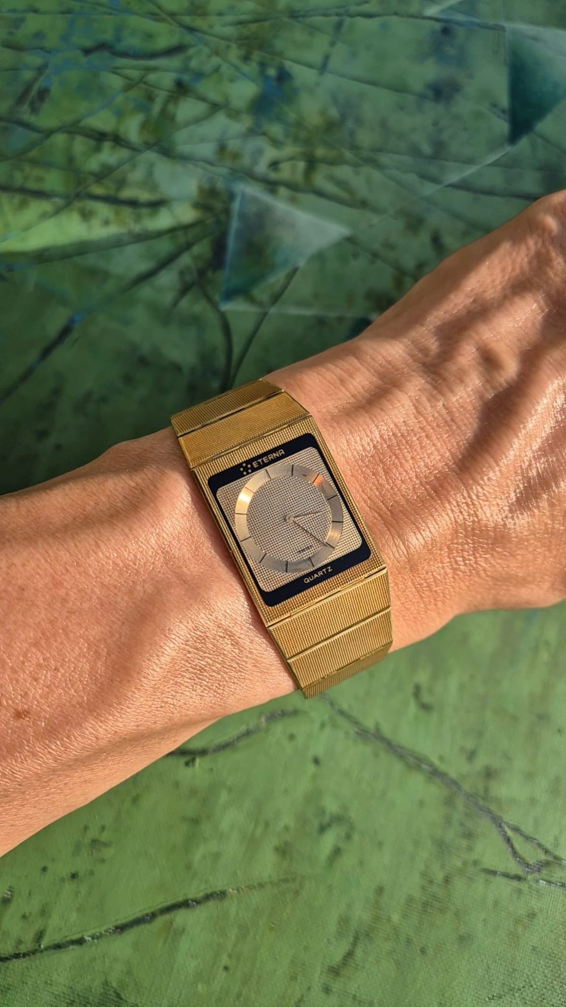 With the model on a leather strap priced CHF12'900 in 1979 -- Eterna Espada Delirium Tres Mince (sounds Tremens). This even rarer and more special variant with the solid gold bracelet, that is all decorated with the same hobnail- / guilloche-pattern as the case and dial, sold for a whopping CHF25'800 in 1979. And so it is safe to assume it was a rare watch back then already. And today with many smelted in the last four decades and in excellent running condition and that well preserved, it comes close to a piece unique. Yes, it was the hottest watch you could buy in 1979 -- if you could: on the edge of technology, super-precise and all hand-engraved by the case-maker-artisans at Favre & Perret -- yes, they made the Patek 3700 Nautilus Jumbo, the Patek 3770 Nautillipse and several other Pateks, too.