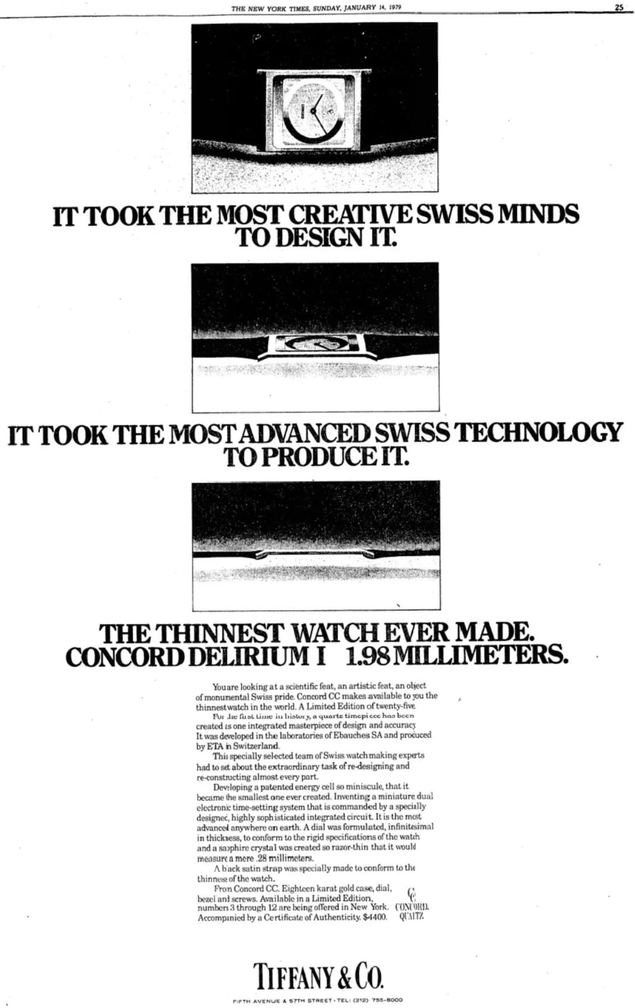Indeed, a rare and important watch: The model for the best-selling Swiss watch Swatch, for the automatic Audemars Piguet Ra-Tourbillon, the modern Piaget Altiplano Ultra and the Richard Mille RM-UP01 -- all apply the Delirium I-innovation of utilizing the case-back as movement main-plate. Besides this, it was the thinnest quartz-watch (less than 2mm inclusive crystal) and thus the winner in the race-to-miniaturization and in the early '80s one of the hottest and most expensive watches.